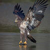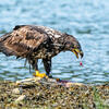 Opportunistic; sometimes a predator, sometimes a scavenger. Does much hunting by watching from a high perch, then swooping down to catch prey in its talons. Also hunts by cruising very low over sea or land, taking prey by surprise. Where fish are abundant (as at spawning runs), may wade in shallow water to pursue them. Sometimes steals fish from Ospreys or other birds. Also lands on ground to feed on carrion.