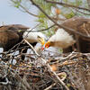 During a spectacular courtship display, the male and female Bald Eagle fly high into the sky, lock talons, and cartwheel down toward earth, unlocking talons just before crashing to the ground. The male and female also chase one another, sometimes locking talons, rolling, and diving or an individual will fly high into the sky, fold wings, and dive directly down toward earth, swooping up just before crashing to the ground. Unless a mate dies, pairs mate for life and are considered monogamous, first breeding around 4-5 years of age.