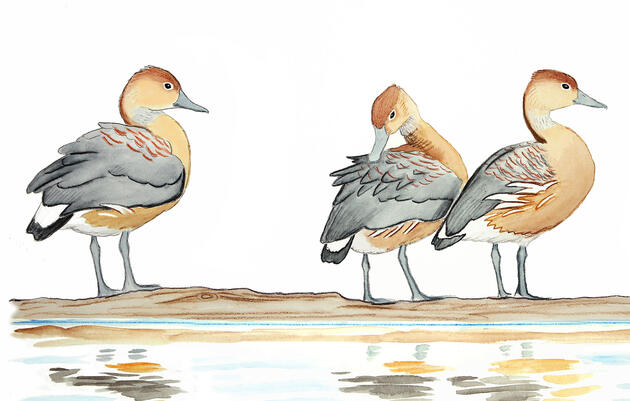Ducklings in cavity nests can climb walls of cavity, jump to ground 1 or 2 days after hatching. Young tended by both parents, find all their own food. Young fledge at about 2 months.