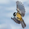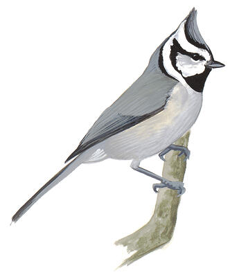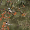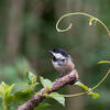 Forages mostly by hopping among twigs and branches and gleaning food from surface, often hanging upside down to reach underside of branches. Sometimes takes food while hovering, and may fly out to catch insects in mid-air. Readily comes to bird feeders for seeds or suet. Often stores food, recovering it later.