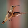 At flowers, usually feeds while hovering, extending its bill deep into the center of the flower. At feeders, may either hover or perch. To catch small insects, may fly out and grab them in midair, or hover to pluck them from foliage; sometimes will take insects from spider webs.
