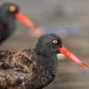 Forages mostly near low tide, resting at high tide. When feeding on mussel beds, typically removes the mussel from its shell and leaves the shell in place. The birds have two methods of opening the shells of bivalves. In one, finding a mussel with its shell slightly open, the oystercatcher quickly jabs its bill into the opening, cutting the muscles and then cleaning out the contents. In the other method, the bird simply hammers on the shell to break it open.