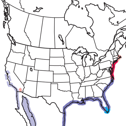 | Habitat | Mostly ocean beaches, tidewater. Favors coastal waters protected from open surf, such as lagoons, estuaries, inlets, sheltered bays. Locally on inland lakes in Florida and at Salton Sea, California. Nests on sandy islands, beaches, shell banks. In South America, occurs far inland along major rivers. |