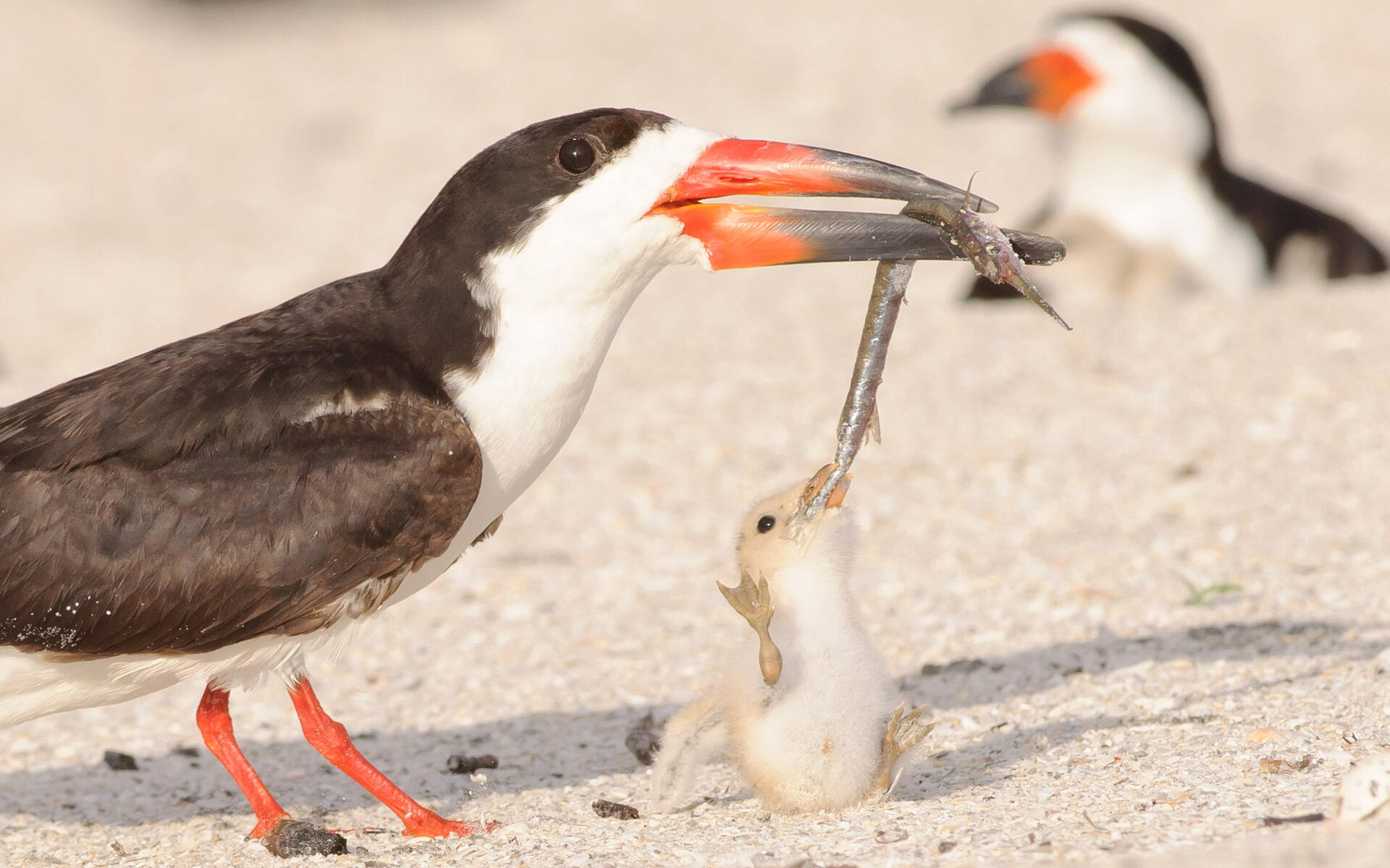 Both parents feed young, by regurgitation. Upper and lower mandibles of young are same length at first, so they are able to pick up food dropped on the ground by parents. Young wander in vicinity of nest after a few days; if danger threatens, may attempt to look inconspicuous by lying flat on beach, even kicking up sand to make a hollow to lie in. Able to fly at about 23-25 days.
