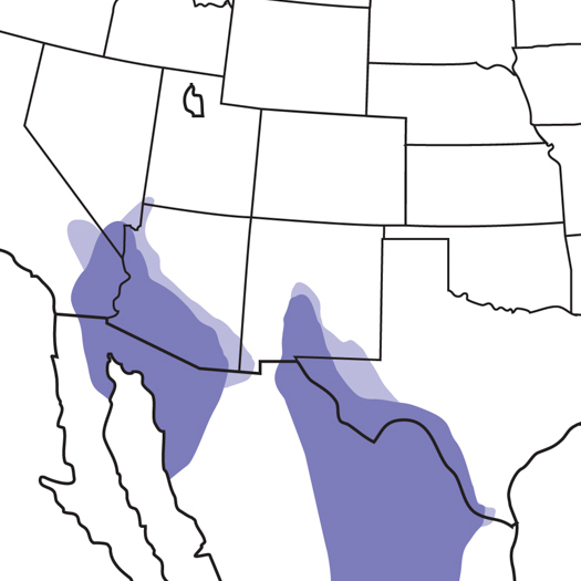| Habitat | Desert brush, ravines, dry washes, mesquites. Found in many dry, scrubby habitats. Most common in Sonoran desert with varied growth of mesquites, acacias, and paloverdes, but also found in low acacia scrub and on open flats of creosote bush. |