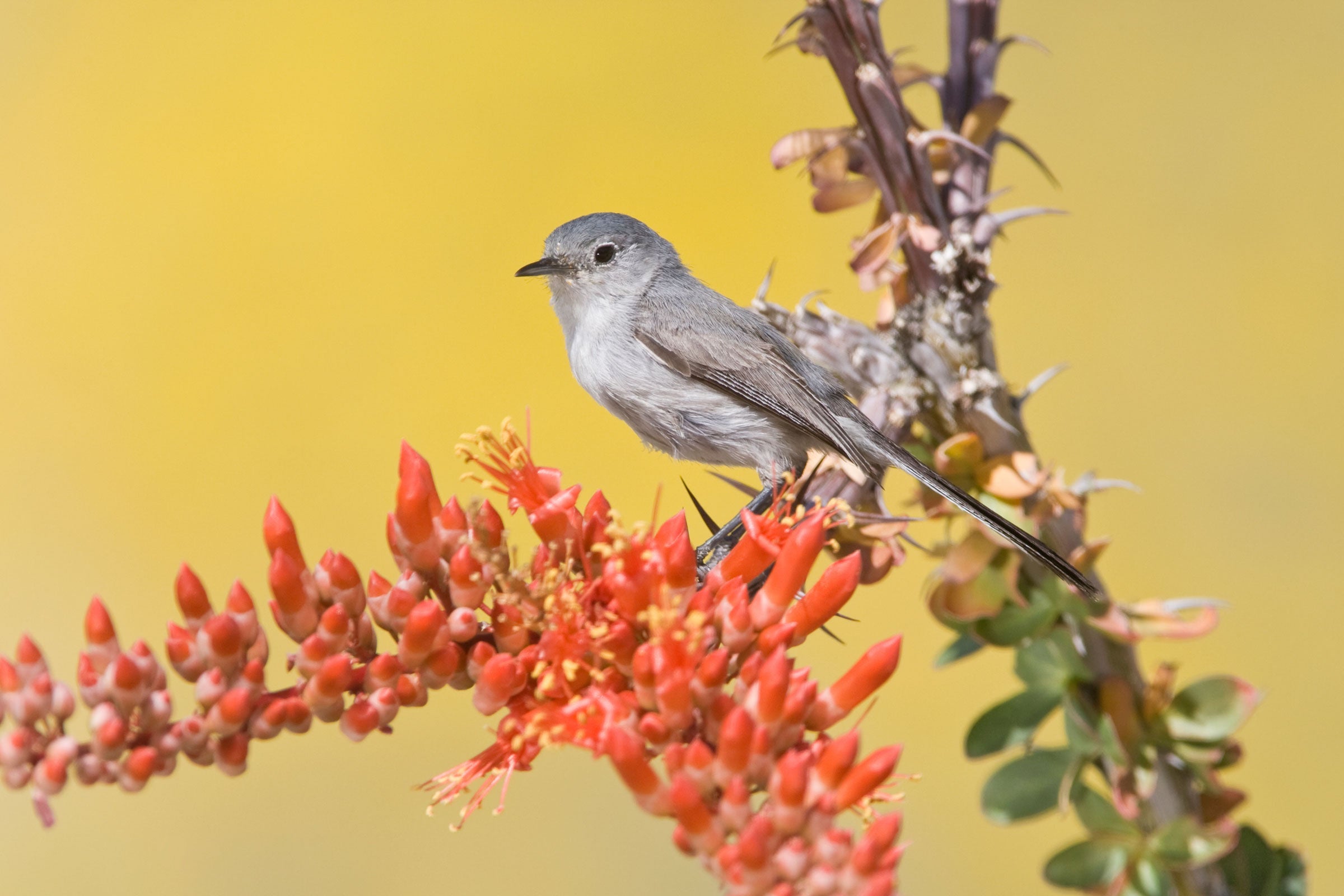 This long-tailed little insect-eater is at home in the desert southwest, even in arid scrub and creosote bush flats where there are few other birds. Black-tailed Gnatcatchers live in pairs all year, foraging together actively in the low brush. They stay in contact with each other using a wide variety of calls; some of these calls sound suspiciously like imitations of other desert birds, such as Verdin or Black-throated Sparrow.