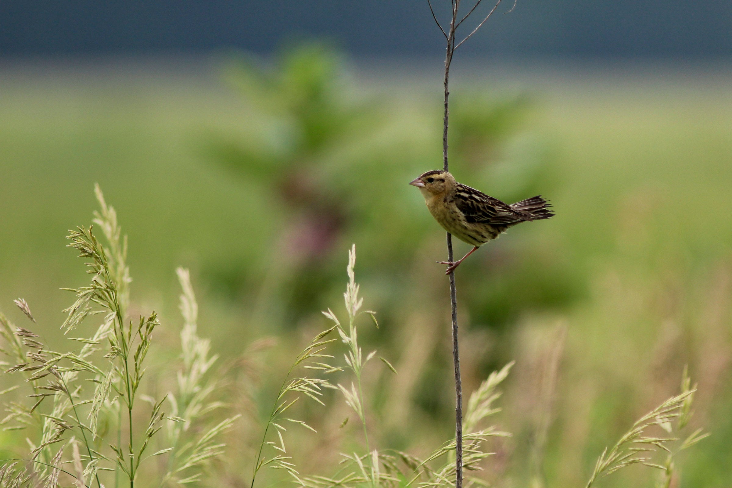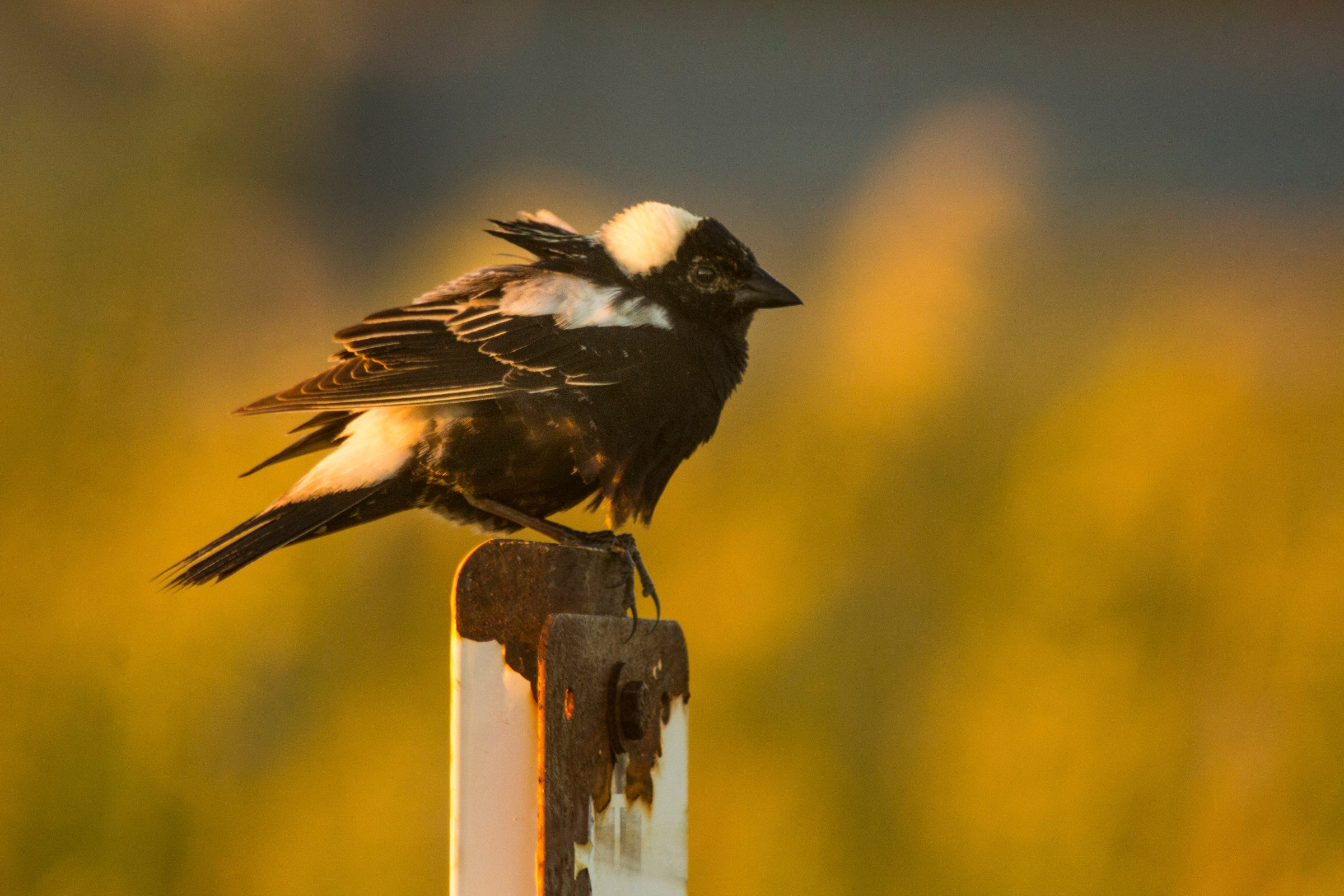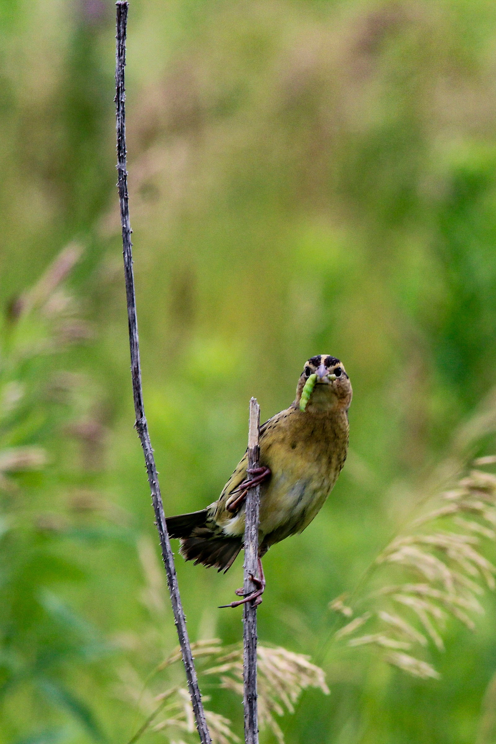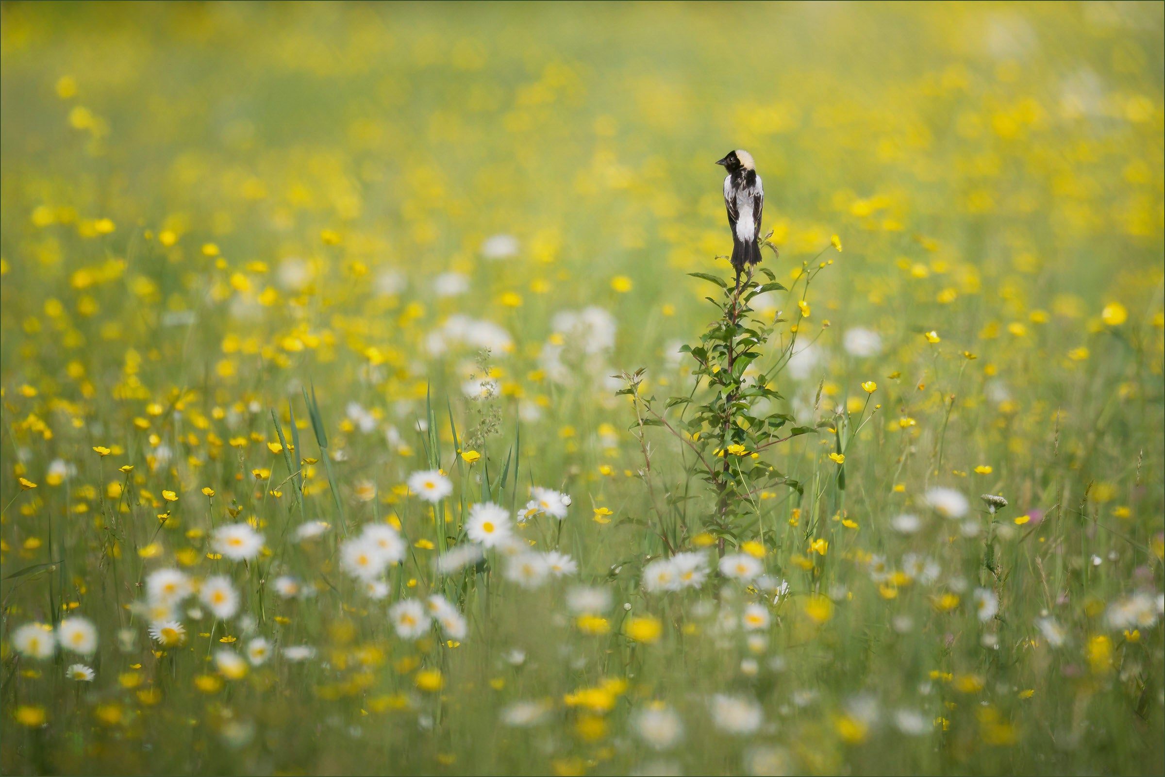 Fluttering over meadows and hayfields in summer, the male Bobolink delivers a bubbling, tinkling song which, loosely interpreted, gives the species its name. The male is unmistakable in spring finery, but before fall migration he molts into a striped brown appearance like that of the female. Bobolinks in this plumage were once known as 'ricebirds' in the South, where they occasionally used to cause serious damage in the ricefields.