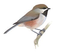 5-5 1/2" (13-14 cm). Dingy look with brown cap, brown sides. Wings always plain, without obvious pale edgings on feathers. Overall color varies from warmer to grayer brown, but always has dusky wash on cheeks, showing less white there than other chickadees.