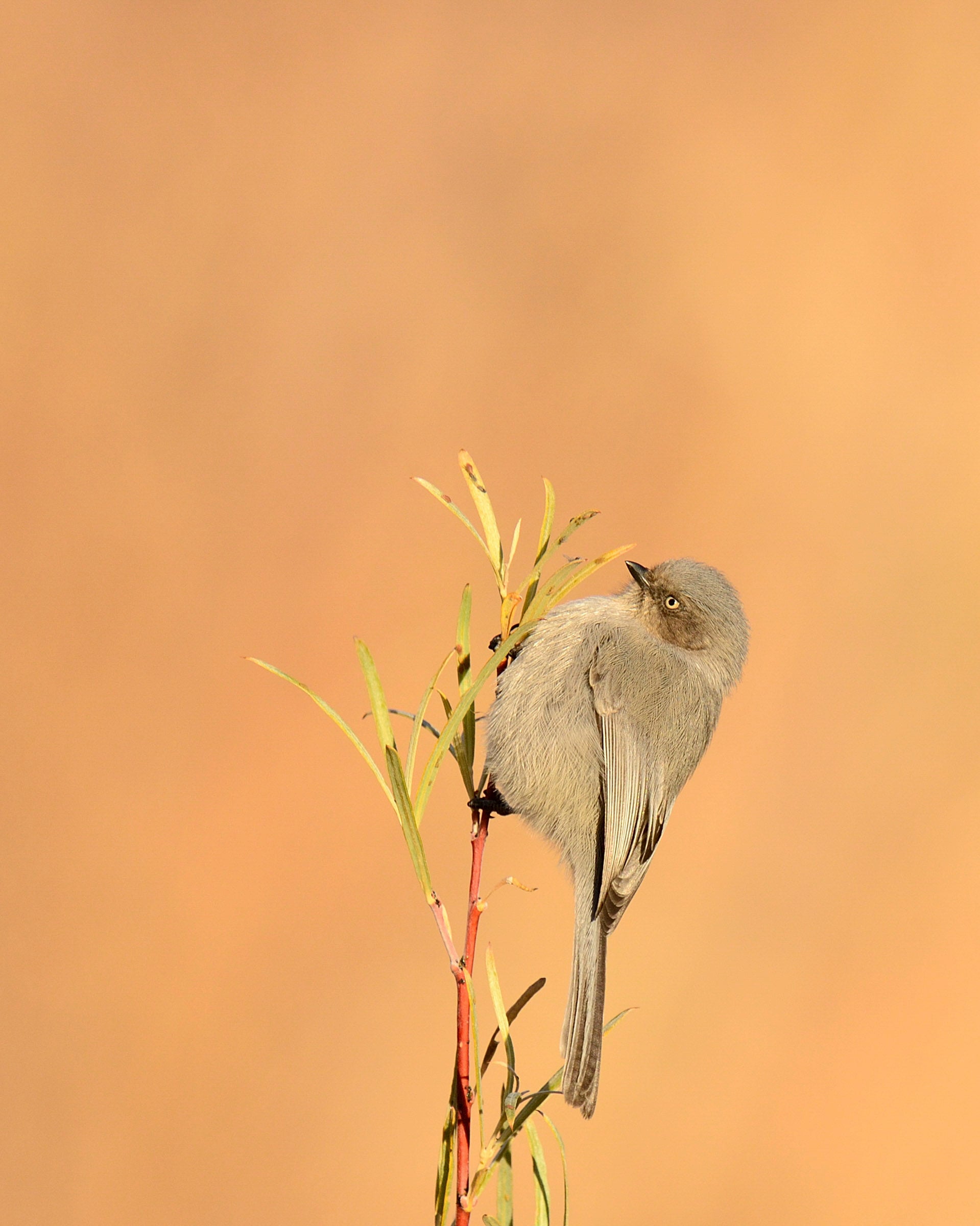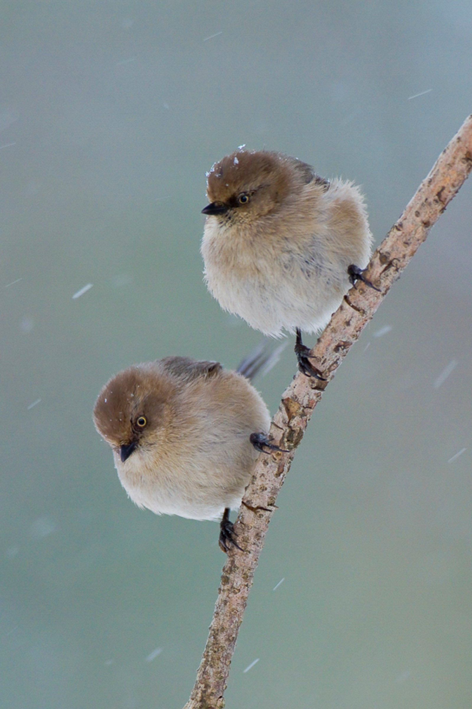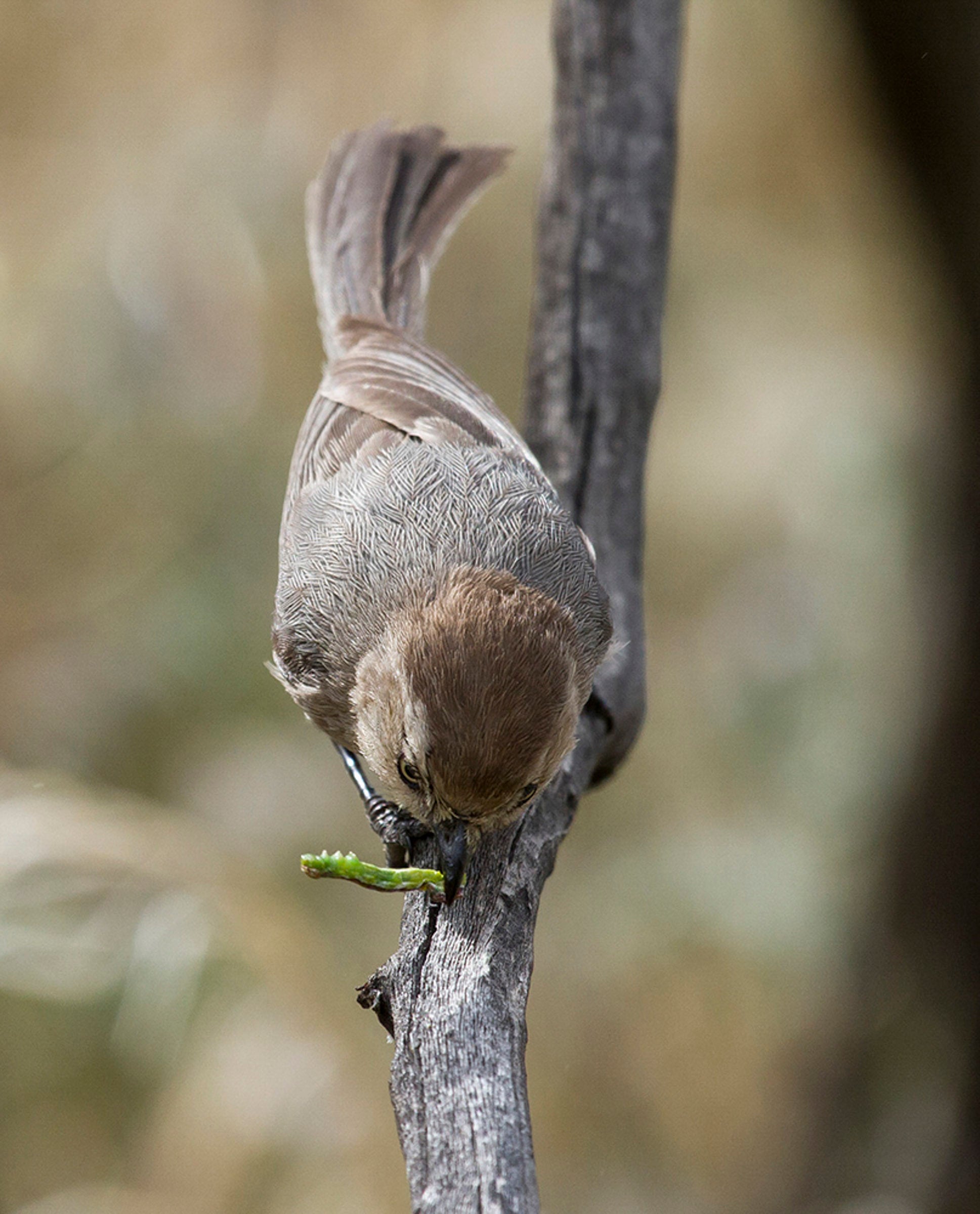 Tiny, drab birds with light ticking and lisping callnotes, Bushtits are common in woods and mountains of the west, but they are often inconspicuous. A flock feeding in a tree may go almost unnoticed until the birds fly out, perhaps twenty or thirty of them, in a straggling single file to the next tree. They are very sociable at most seasons, and groups will roost huddled close together in a tight mass on cold nights.