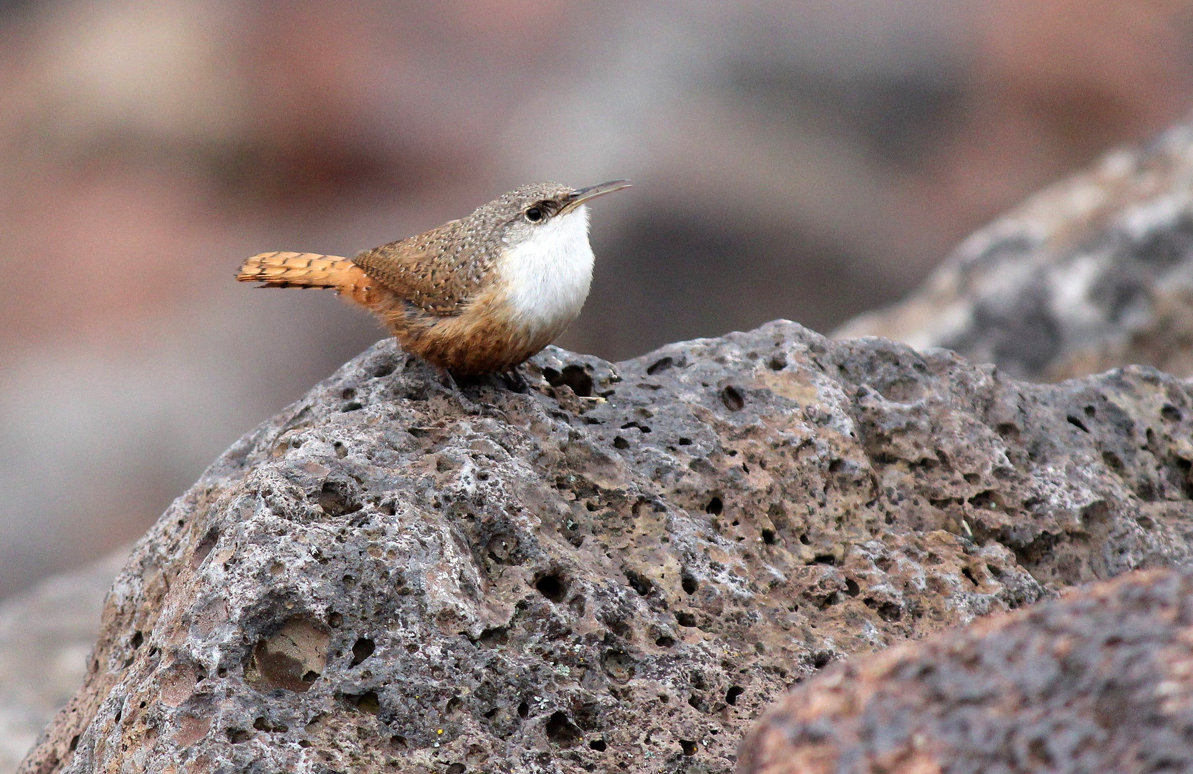 One of the best songsters in the west, the Canyon Wren is usually heard before it is seen. Surprisingly elusive and skulking even in open terrain, this dark rusty wren disappears and reappears as it creeps about the jumbled rocks of an eroded cliff or steep canyon wall. If the observer waits, the bird will eventually jump to the top of an exposed boulder to pour out another song, a rippling and musical cascade of notes, well suited to beautiful wild canyons.