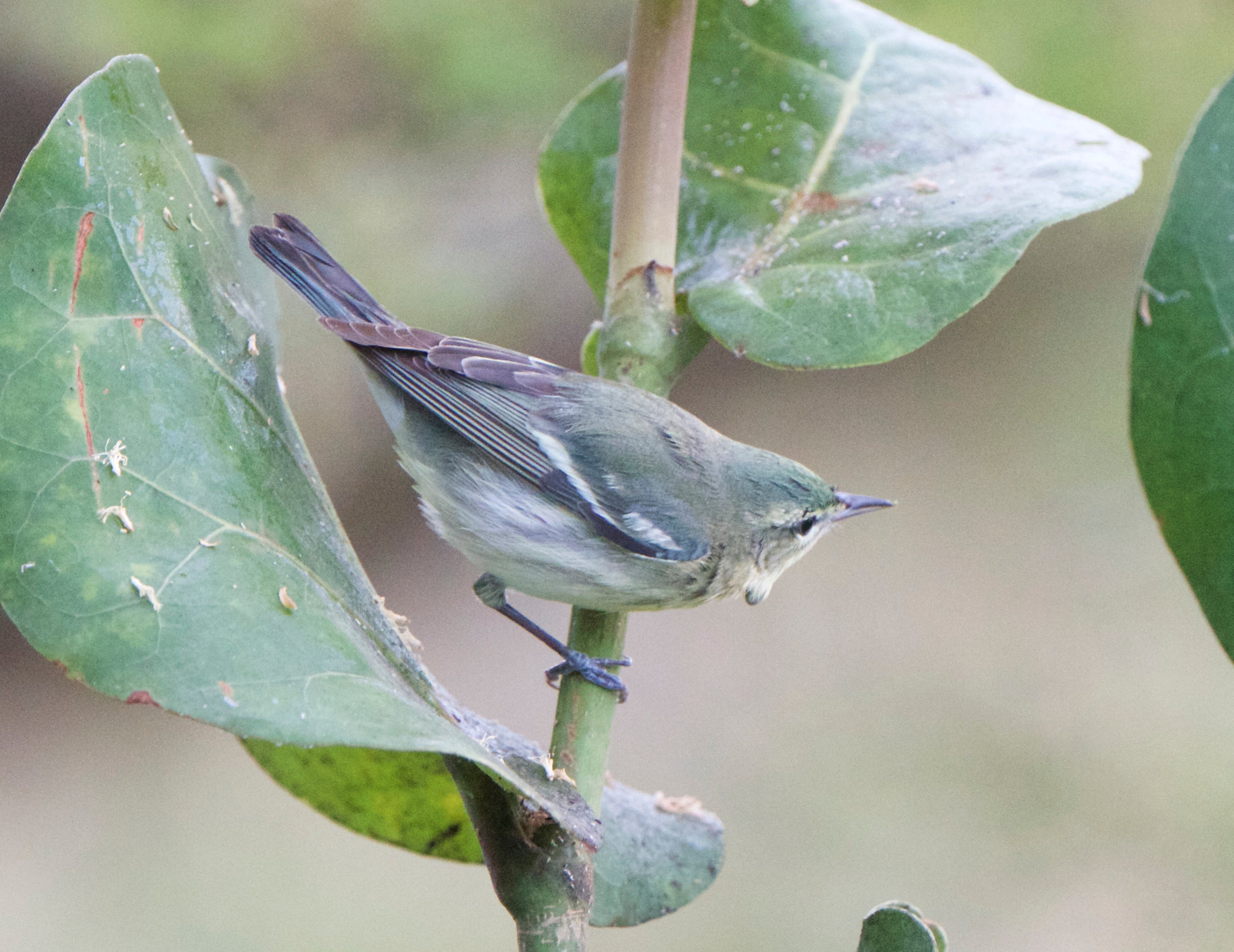 The sky-blue upperparts of the male Cerulean Warbler are difficult to observe in summer: At that season, the birds stay high in the tops of leafy trees in the eastern United States and extreme southern Canada. The bird itself has become harder to observe in recent decades, as its numbers have decreased in parts of its range. Cowbirds, which lay their eggs in the warblers' nests, may be finding their unwitting 'hosts' more easily as forest patches become smaller.