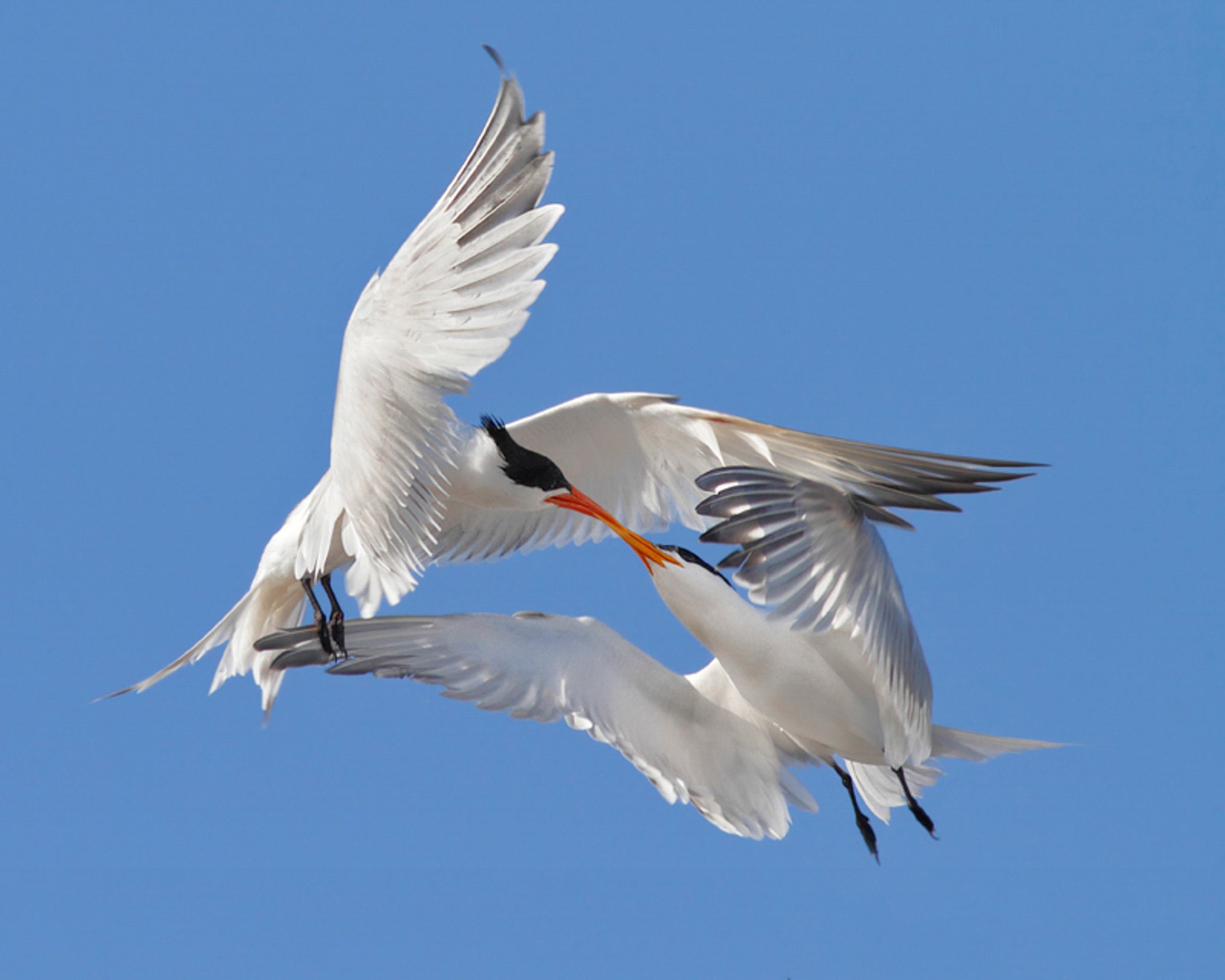 16-17" (41-43 cm). Very similar to Royal Tern. Smaller (apparent only when they are together). Has much slimmer bill that often looks slightly droopy. In "winter" plumage (worn for most of year), black from nape usually extends forward to include the eye on Elegant, not on Royal Tern.