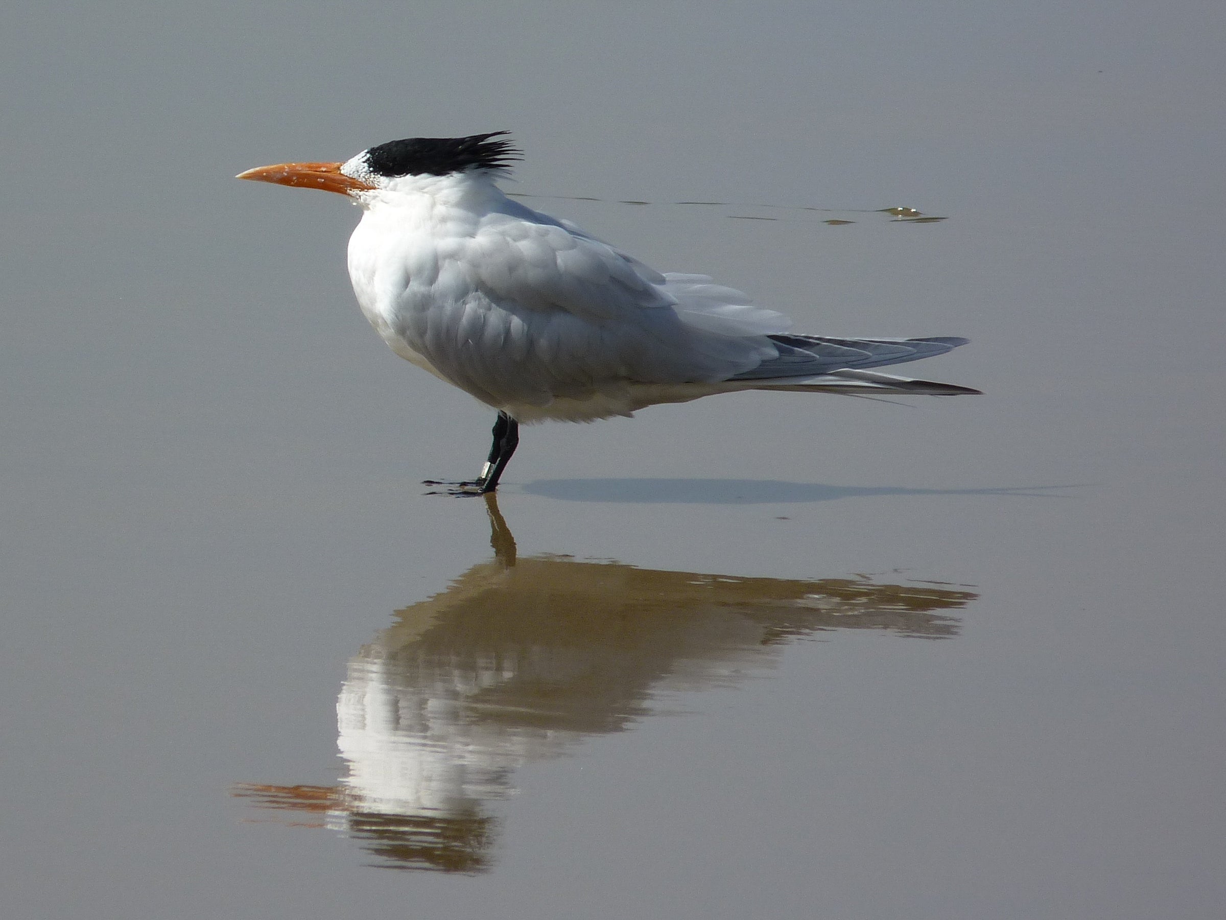 Formerly just a late-summer visitor to our Pacific Coast from its Mexican breeding colonies, the Elegant Tern has been reaching California in increasing numbers since about 1950, nesting there since 1959. A medium-sized tern, slim and long-billed, strictly coastal in its occurrence. In size, shape, and callnotes, very similar to the Sandwich Tern of the Atlantic Coast.