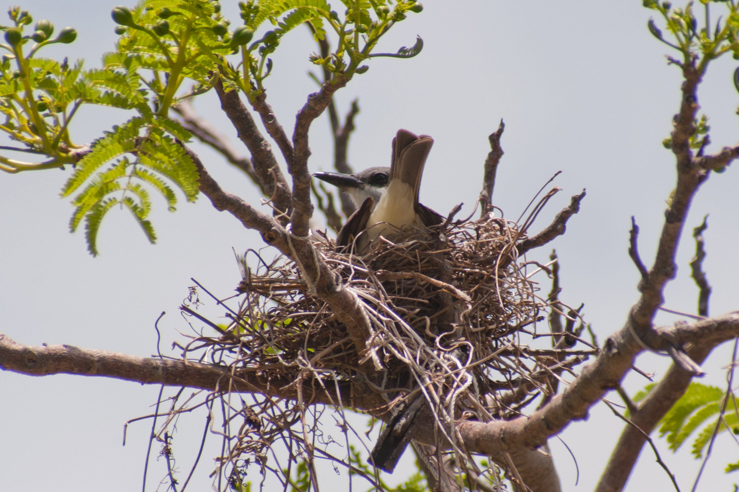 Nesting behavior is poorly known. Adults are very active and bold in defense of their nest, even attacking humans who come too close. Nest site is often among branches of coastal mangroves, 4-12' above the water or ground. Also nests in taller trees inland, such as pines or oaks, up to 40' above the ground. In cities, may build nest where wires cross utility poles. Nest is a cup of twigs, grasses, rootlets, lined with finer grass; usually built loosely, so that eggs may even be visible from below.
