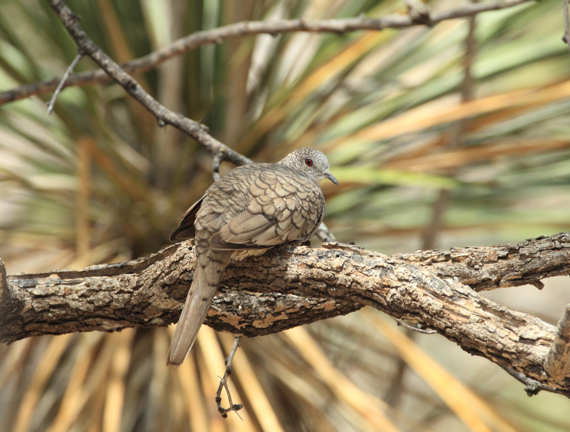 The soft, whistled no-hope of the Inca Dove is a familiar sound in southwestern cities. These little doves are often seen walking about on lawns with dainty steps, or fluttering up with a rattle of wings. In much of their range, they are found around human dwellings, and rather seldom seen in natural habitats away from towns or farms. Probably absent originally from areas north of Mexico, they have spread northward as settlements have grown up in the southwest.