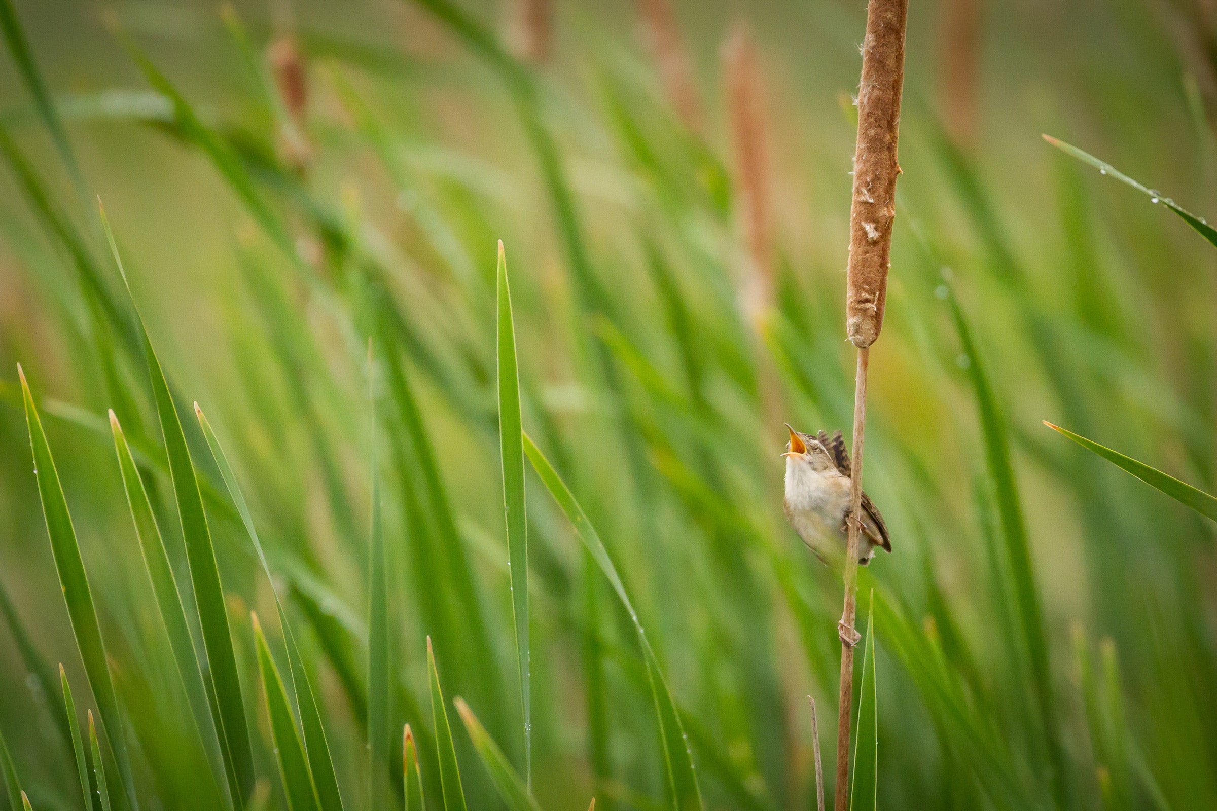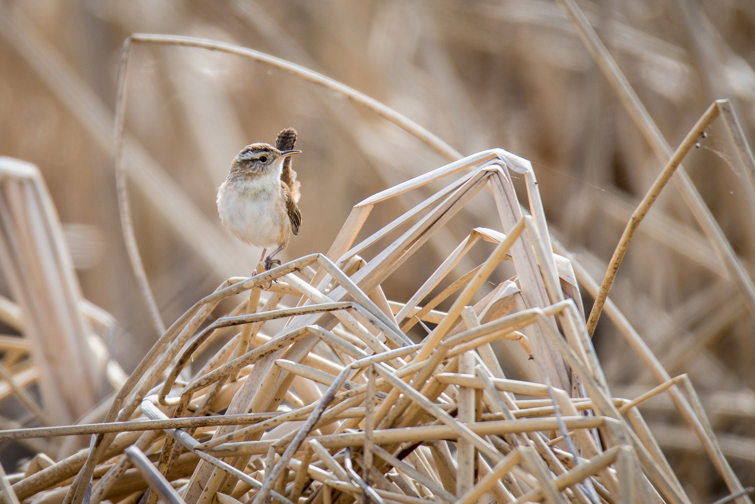 A sputtering, bubbling song among the cattails is a giveaway that the Marsh Wren is at home. A patient watcher eventually will see the bird as it slips furtively through the reeds or bounces to the top of a stem for a look around. Industrious male Marsh Wrens build 'dummy nests' in their nesting territories, occasionally up to twenty or more; most of these are never used for raising young, but the adults may sleep in them during other seasons.