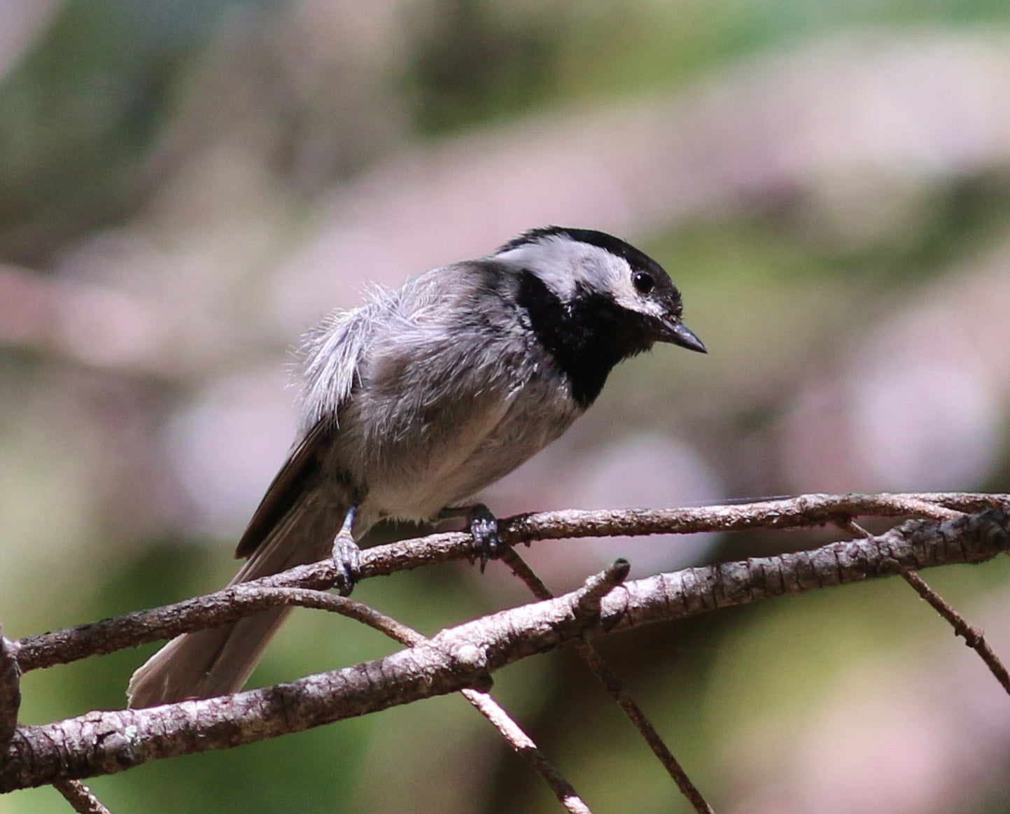 5" (13 cm). Most easily known by range, as it is the only chickadee in the Chiricahuas and adjacent lower mountains. (Elsewhere in the southwest, it is replaced by Mountain Chickadee.) Note the large black bib, extensive gray wash on sides.