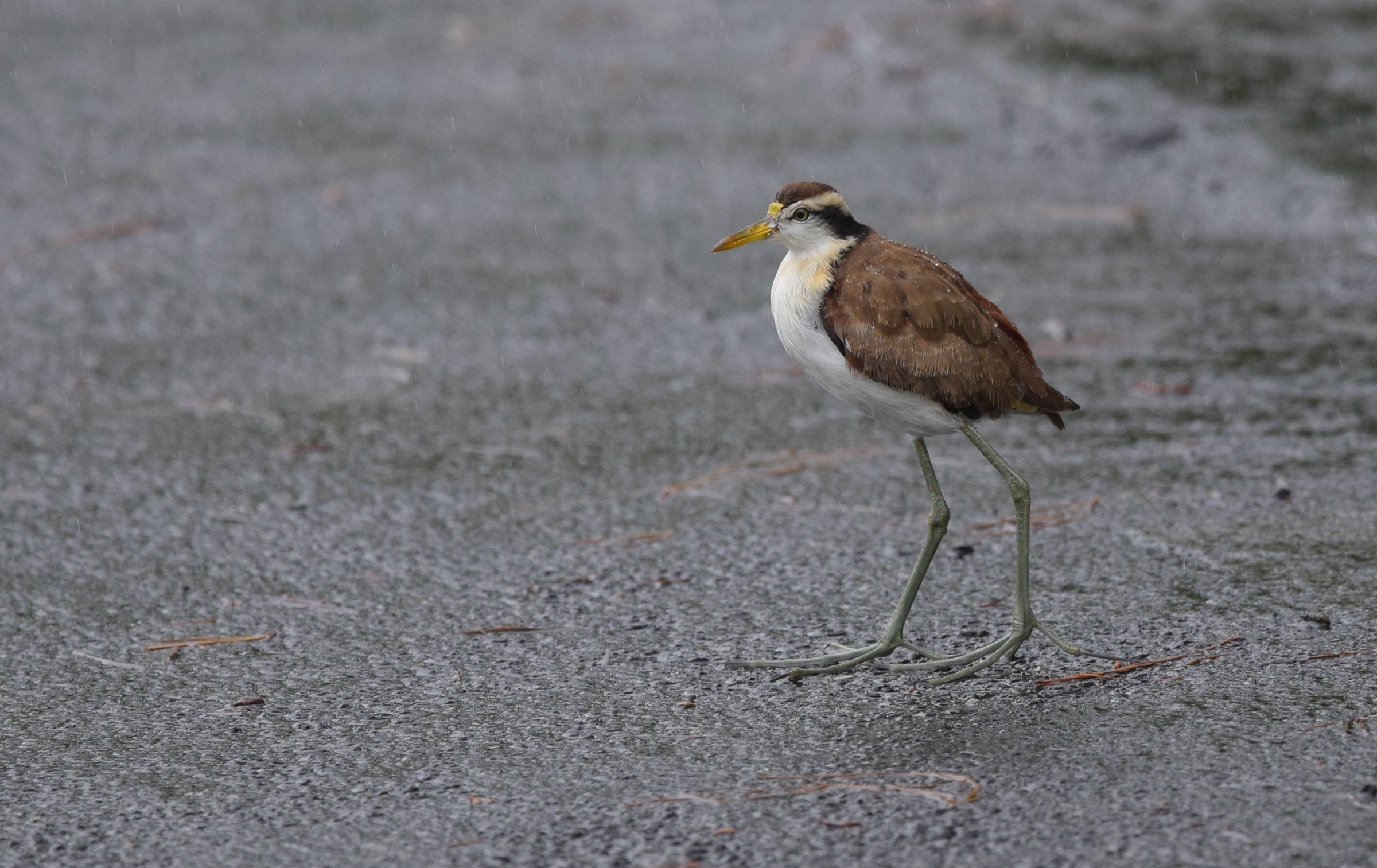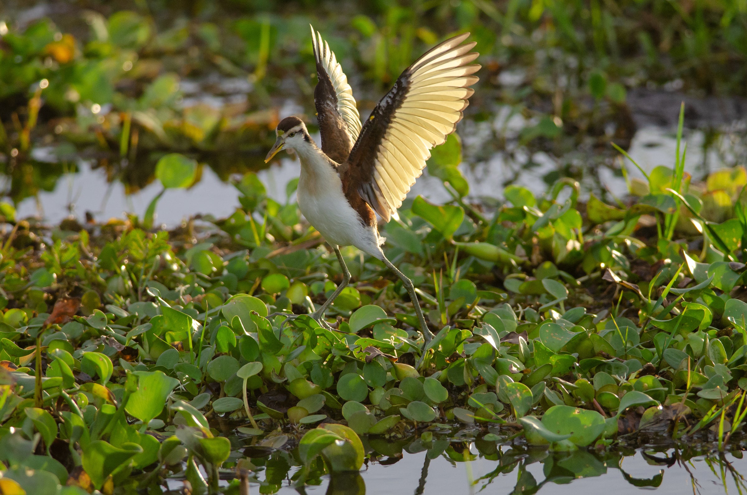 At marshy ponds from Mexico to Panama, this odd shorebird is common. Its long toes allow it to run about on lily pads and other floating vegetation. When it flies, the feet trail behind it; on landing, it may hold the wings high for a moment, showing off the yellow flight feathers. This species has turned up several times in Texas, and has even nested there.