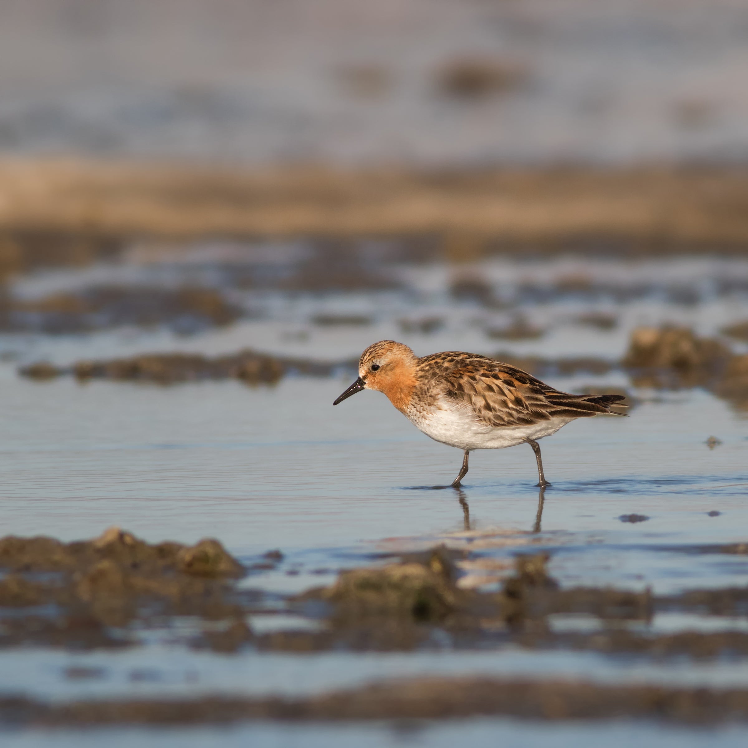 This rusty-headed little sandpiper is mostly an Asian bird, but every summer, small numbers cross the Bering Strait to nest in western Alaska. Rarely, a few individuals will migrate south in the Americas rather than taking their usual route south to the Australasian region. Such strays have been seen on both coasts and at points in between. Most Rufous-necked Stints found south of Alaska have been adults migrating south in July, still in distinctive breeding plumage.