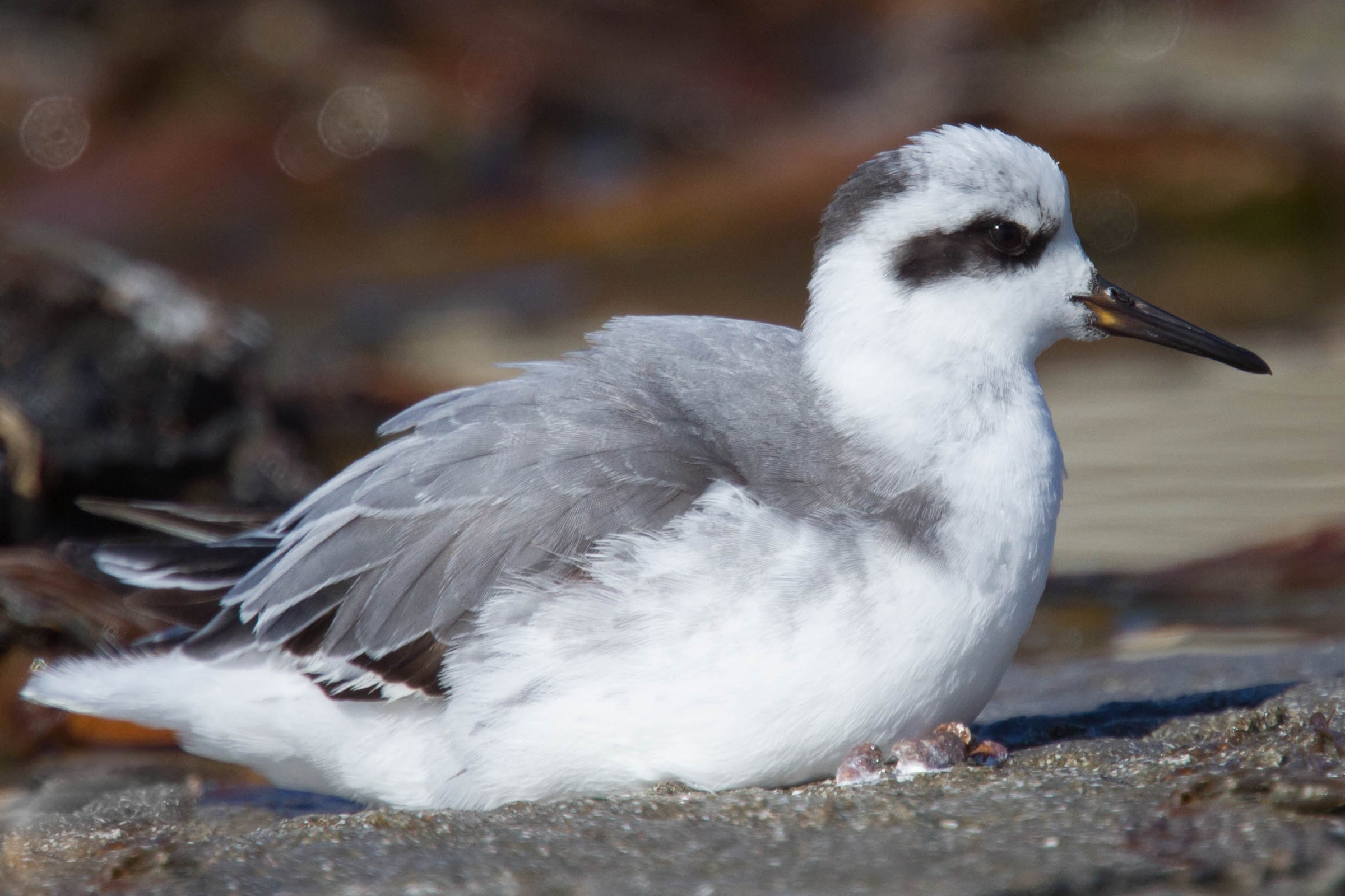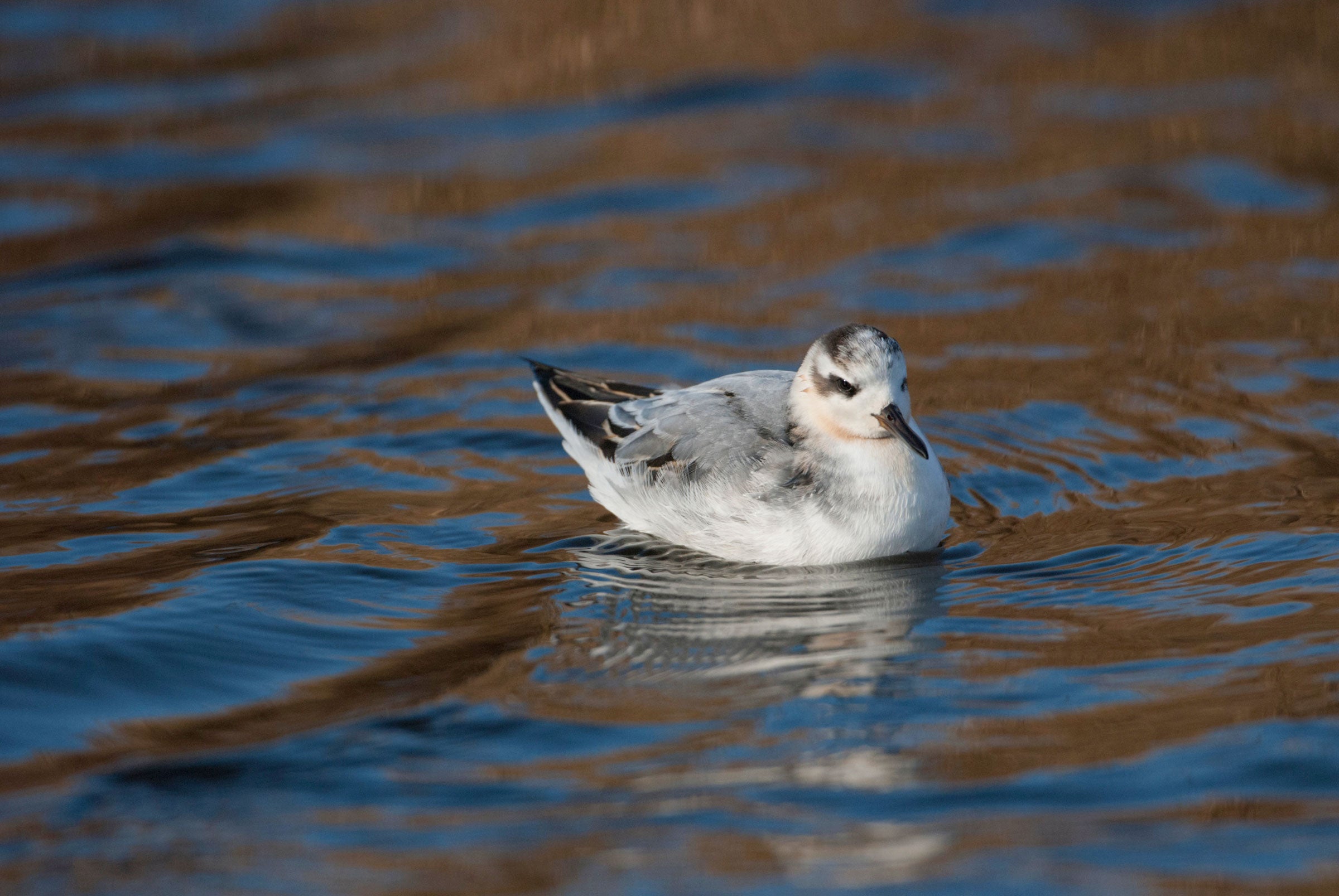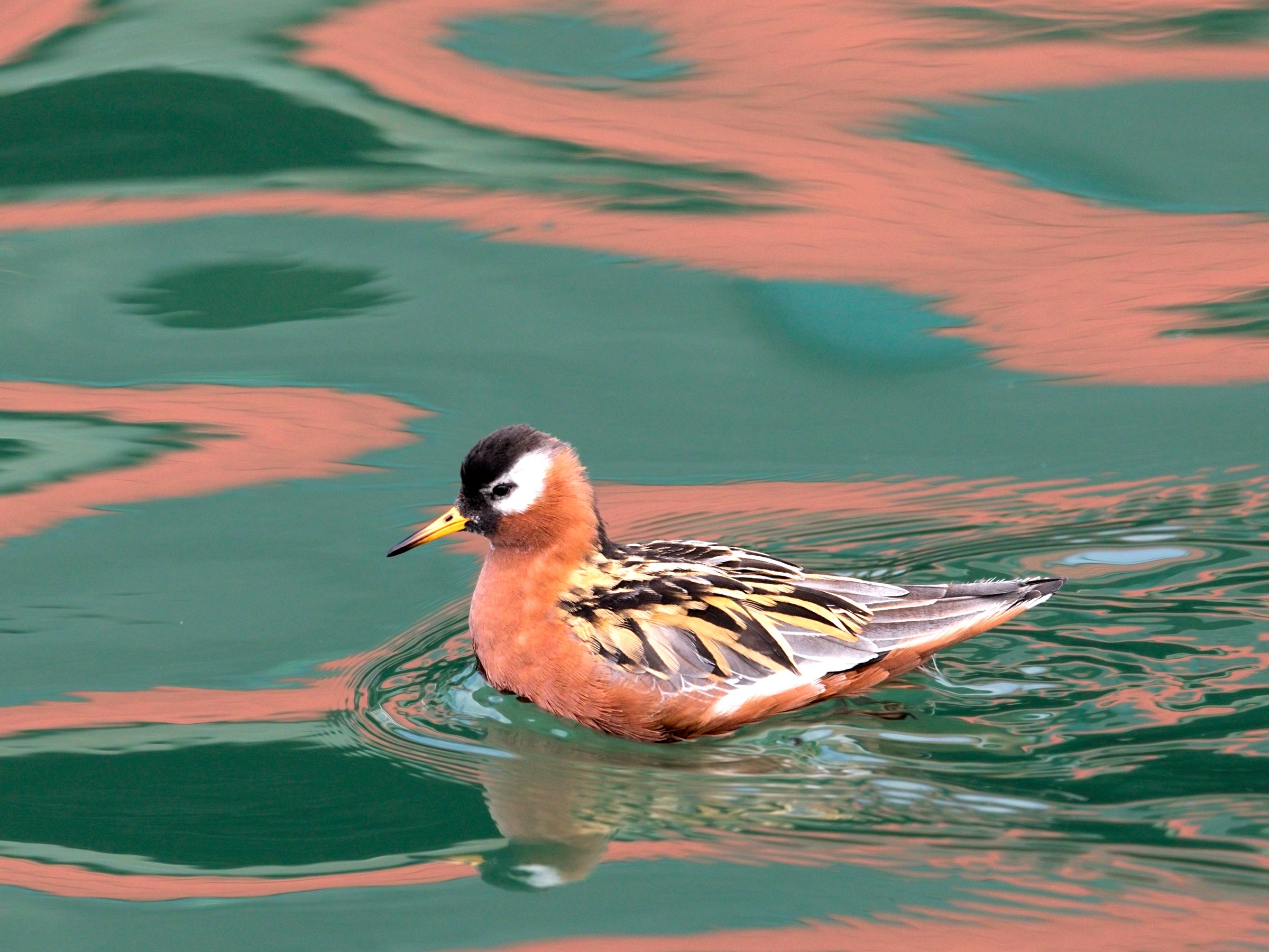 Phalaropes reverse the usual sex roles in birds: Females are larger and more colorful than males; females take the lead in courtship, and males are left to incubate the eggs and care for the young. The Red Phalarope nests in the high Arctic, and winters in flocks on southern oceans. It is rarely seen inland in most parts of North America.