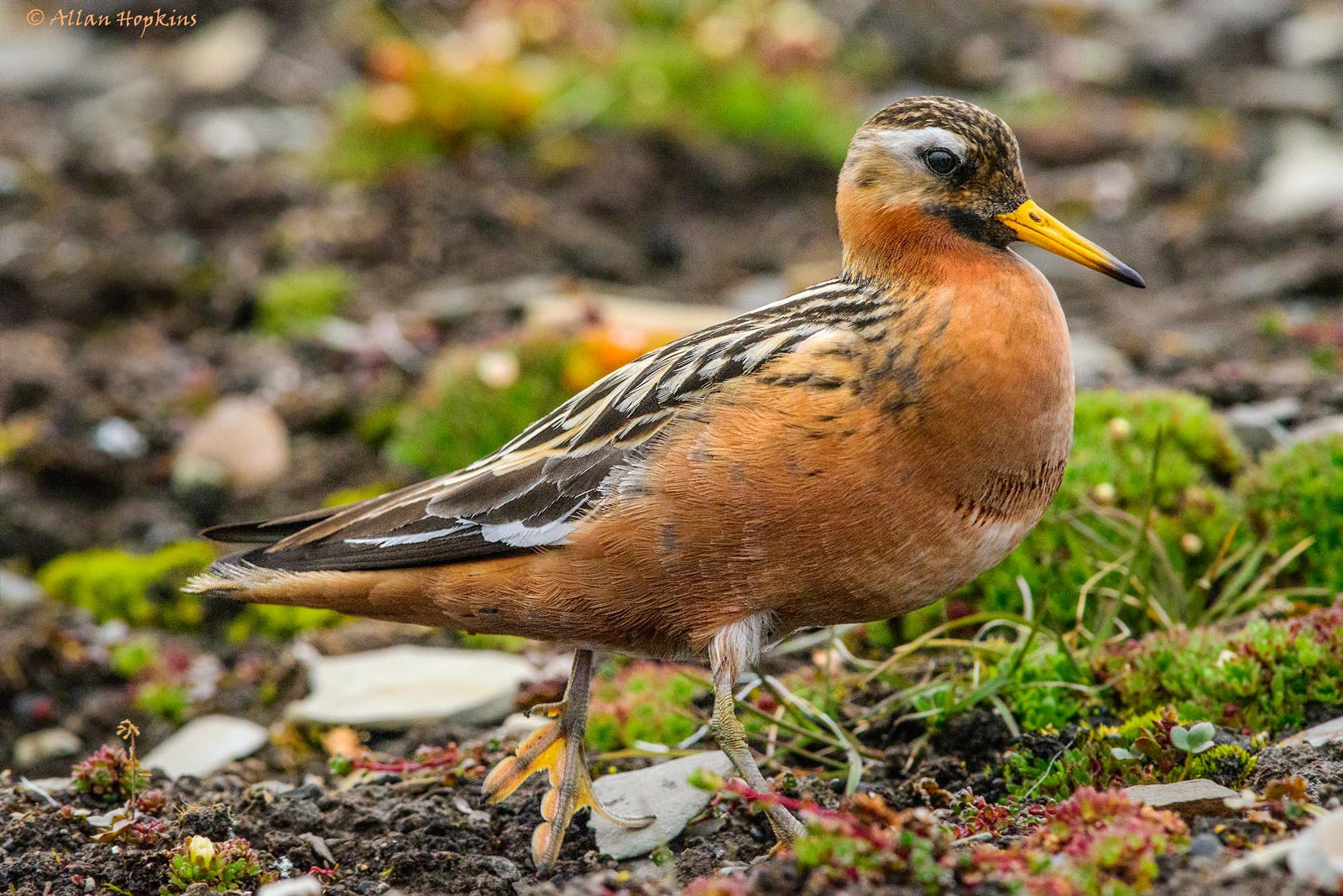 8" (20 cm). Spring female rich chestnut-red below, with white on face, yellow base of bill, buff back stripes. Male duller. Fall adults similar to Red-necked but smoother gray on back (without stripes), and have much thicker bill. Fall juveniles show more buff at first.