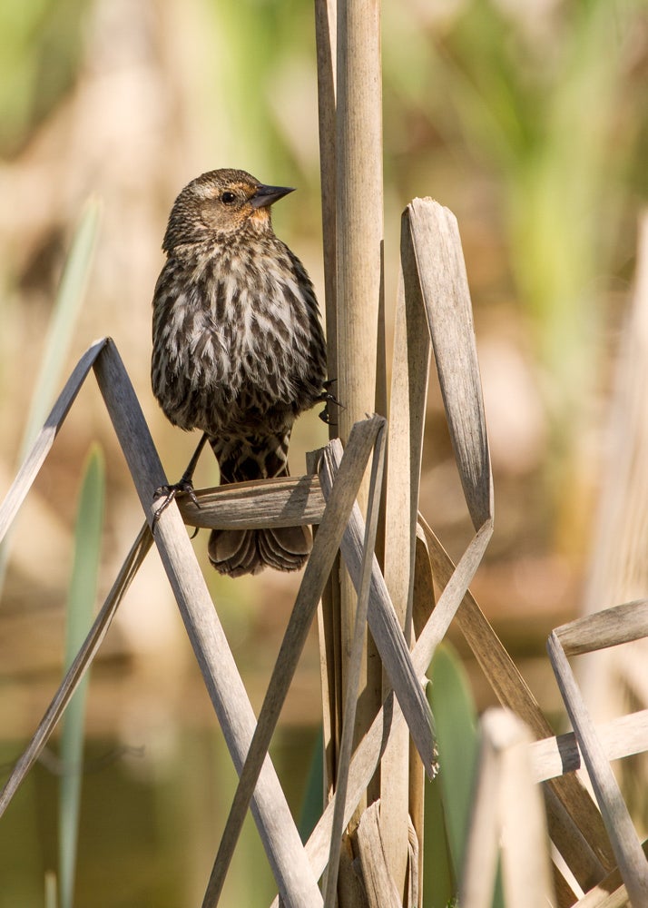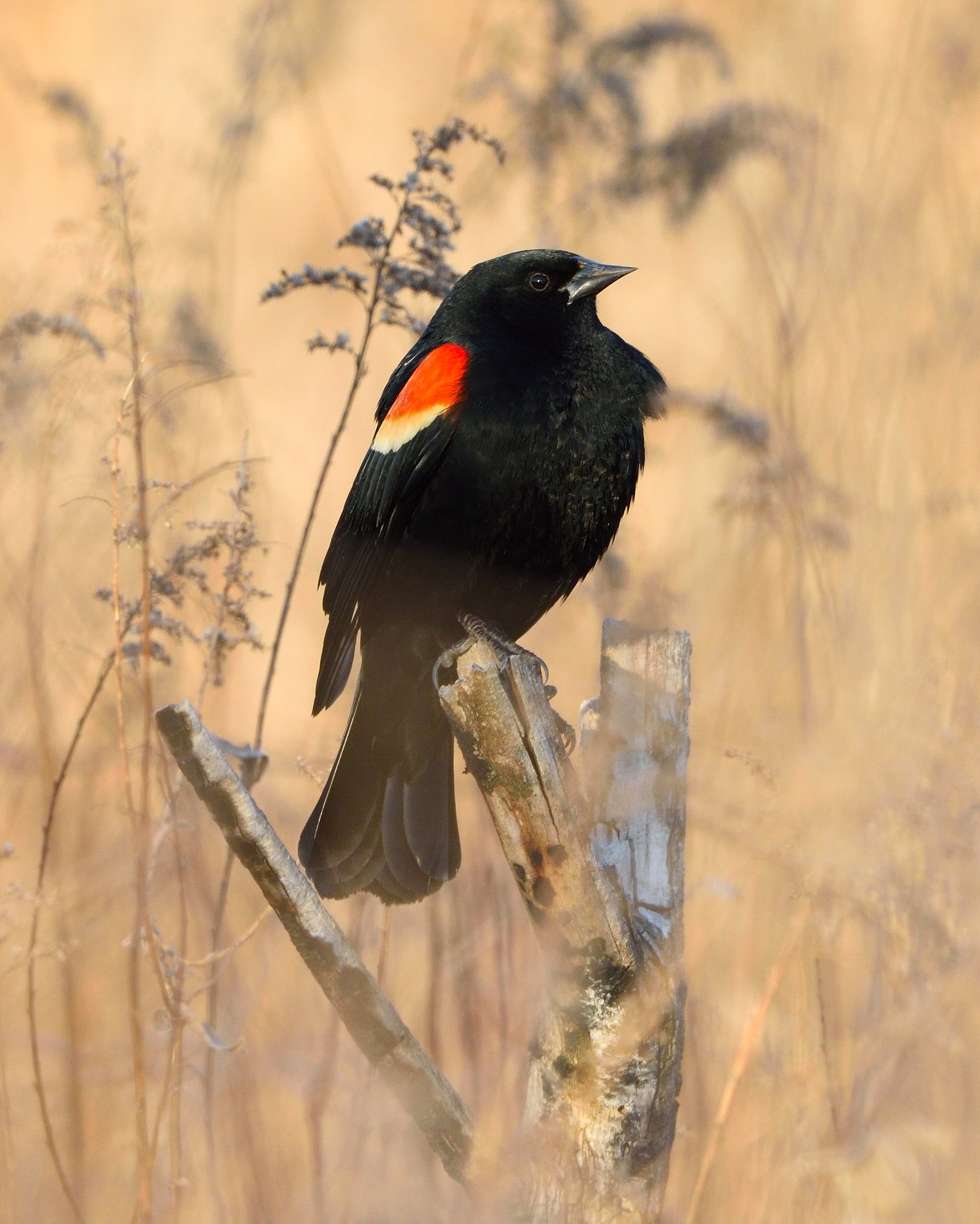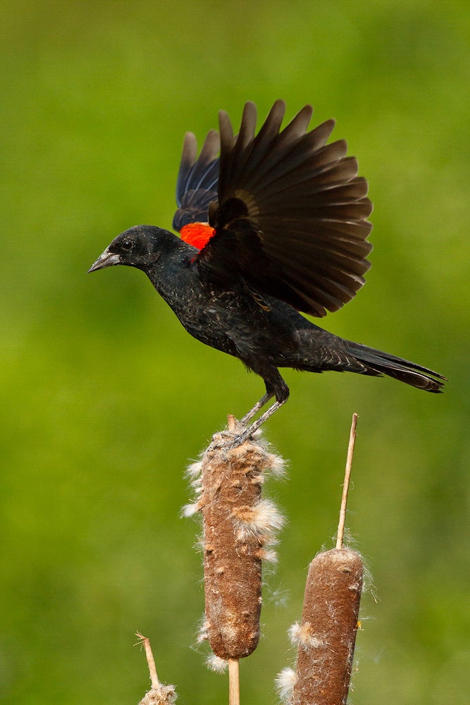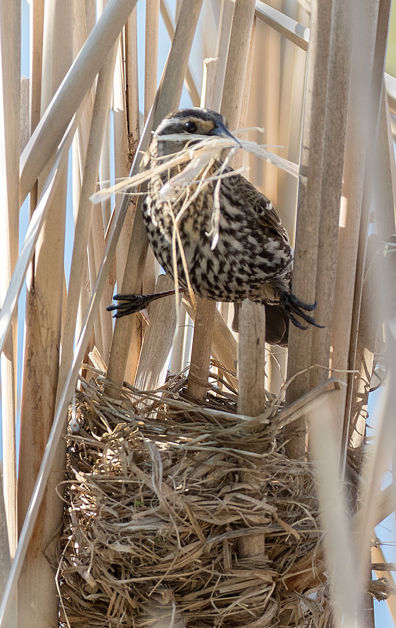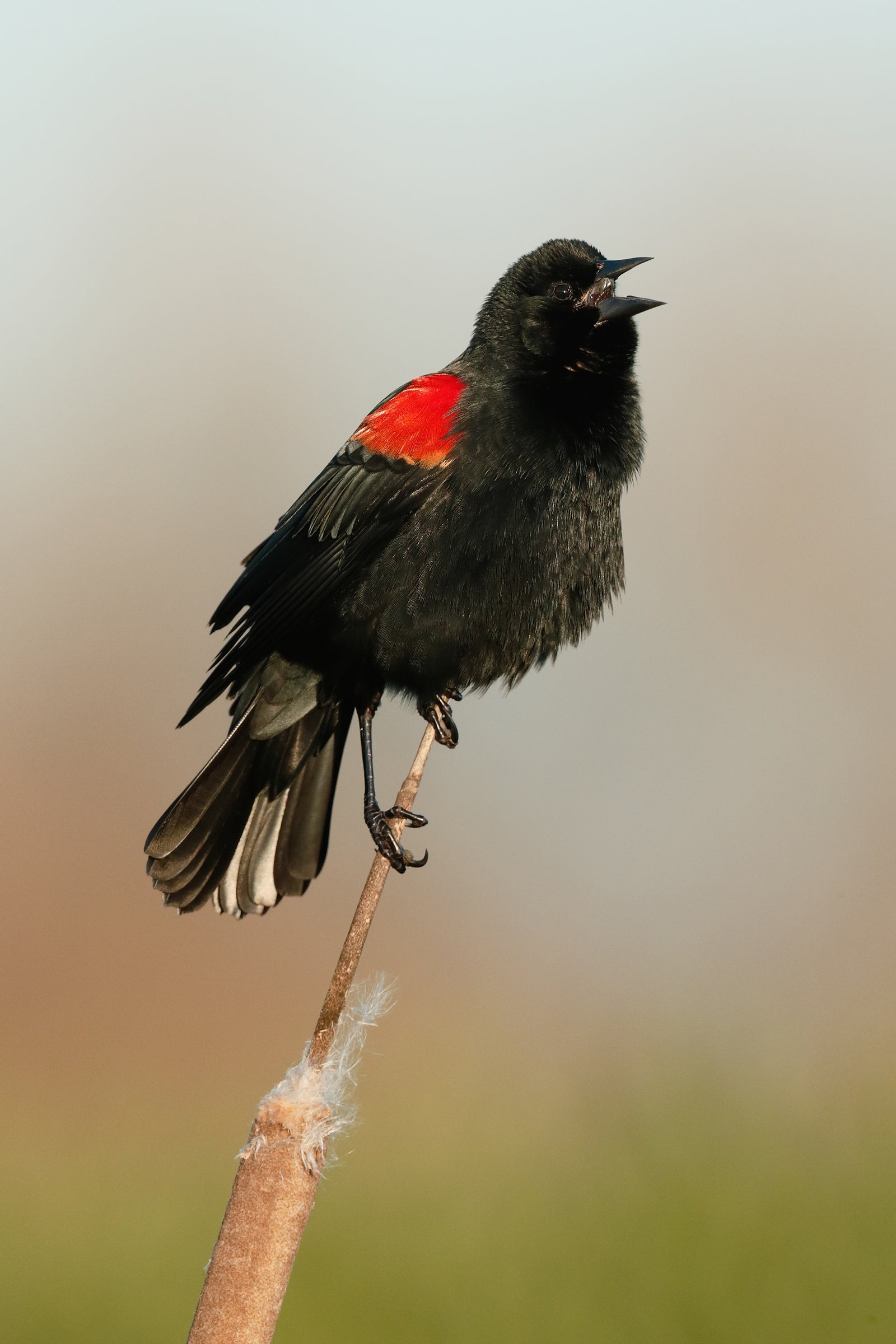 Among our most familiar birds, the Red-winged Blackbird seems to sing its nasal songs in every marsh and wet field from coast to coast. They are notably bold, and several will often attack a larger bird, such as a hawk or crow, that flies over their nesting area. The red shoulder patches of the male, hidden under body feathers much of the time, are brilliantly displayed when he is singing. Outside the nesting season, Red-winged Blackbirds sometimes roost in huge concentrations.