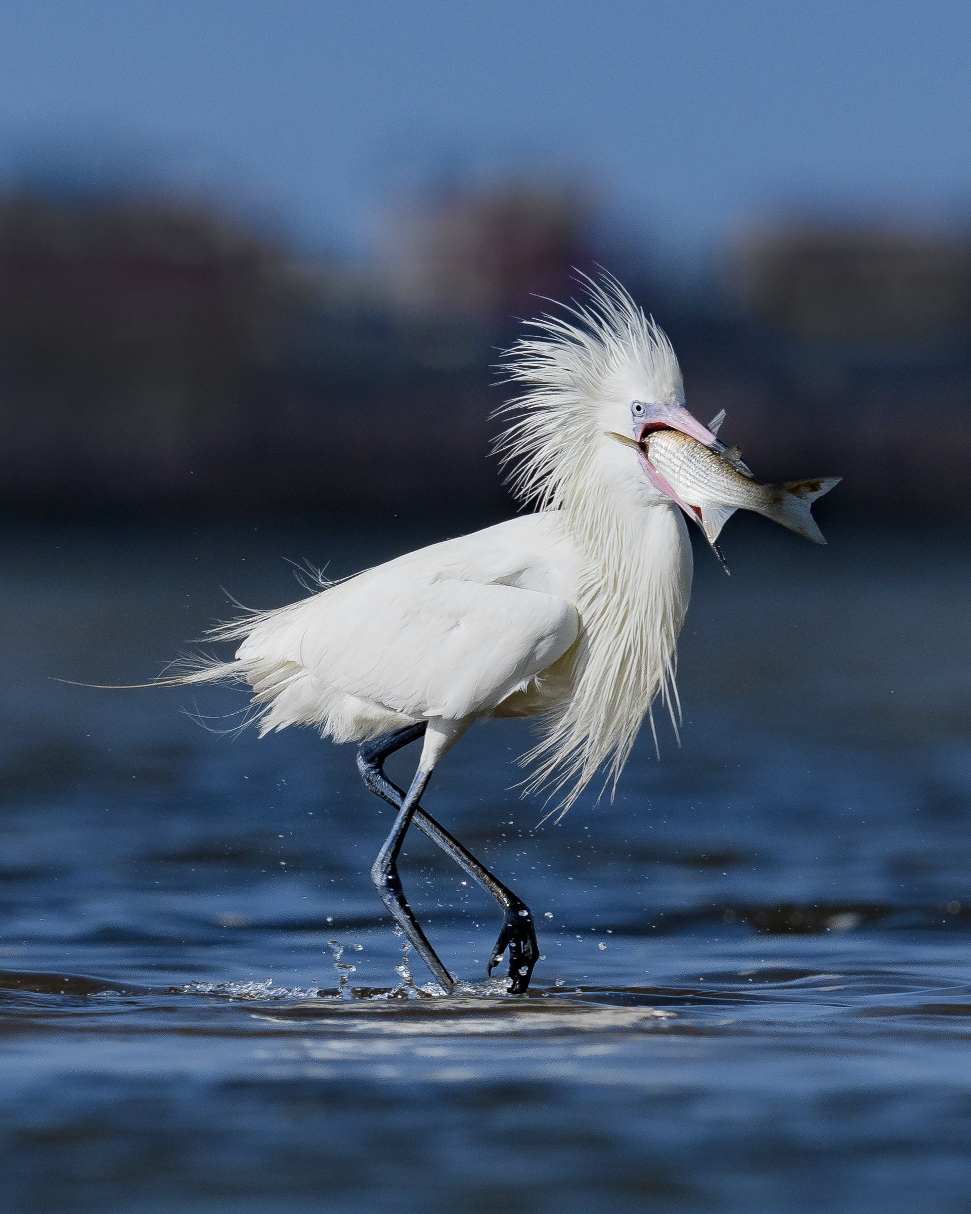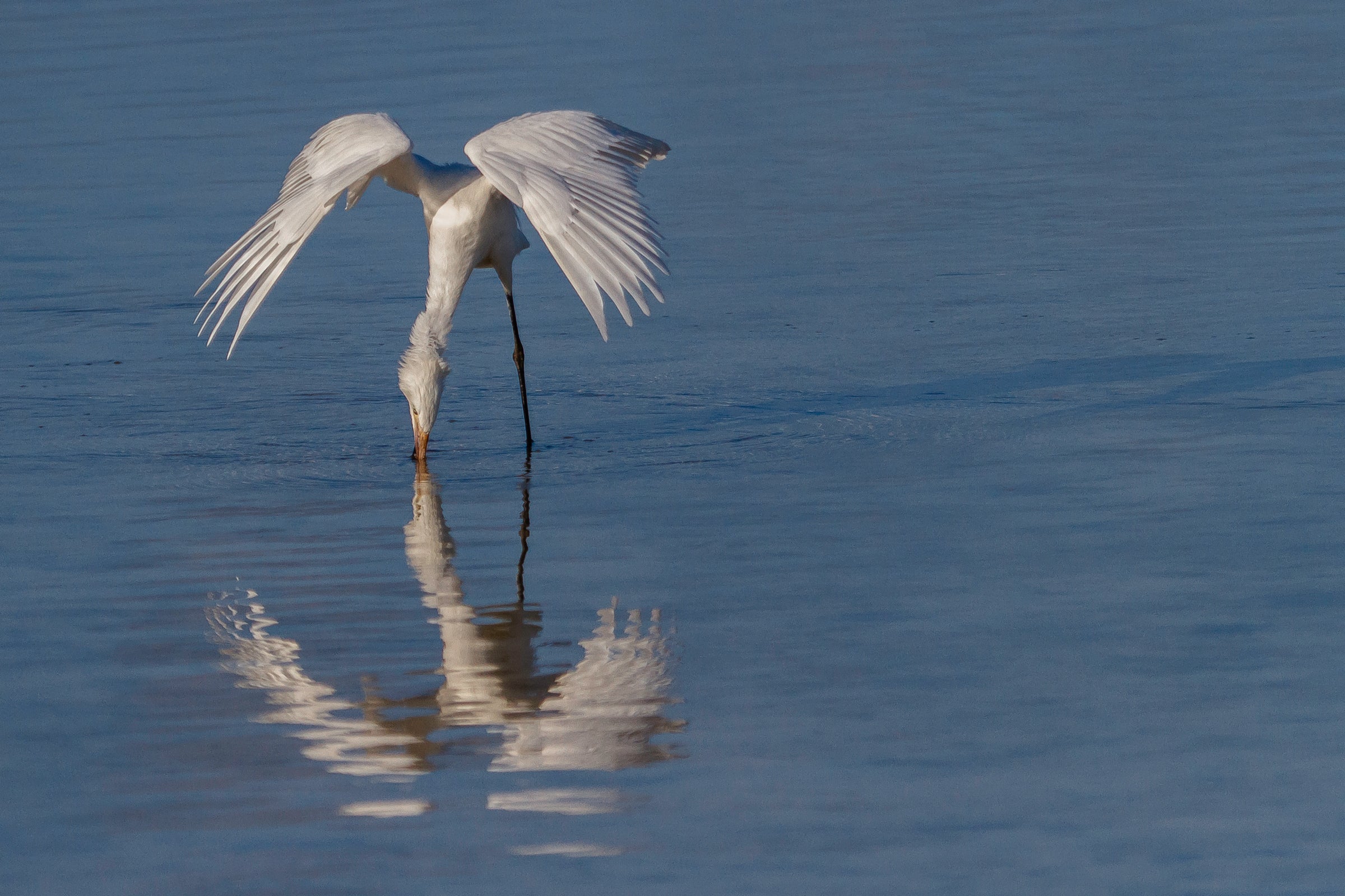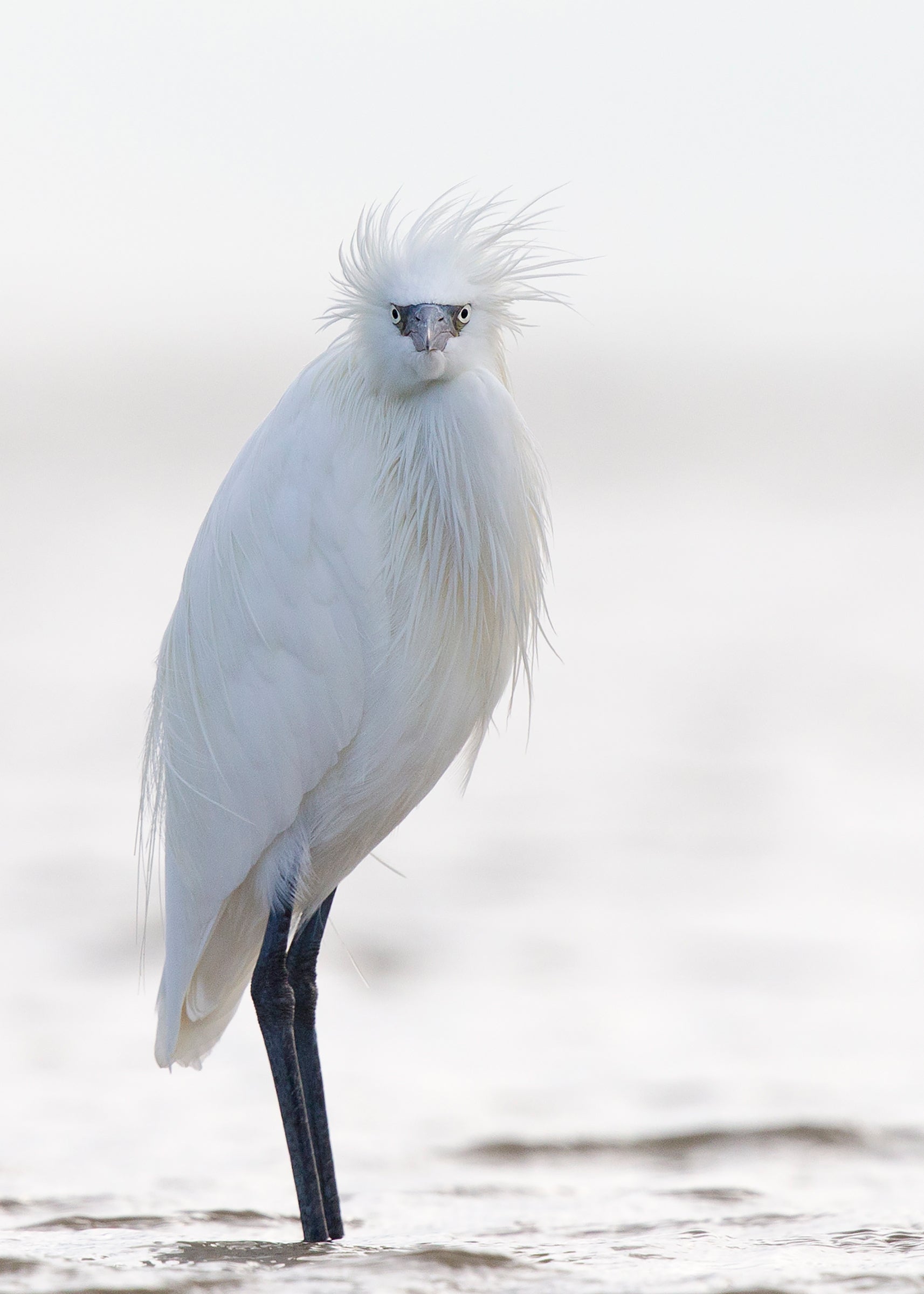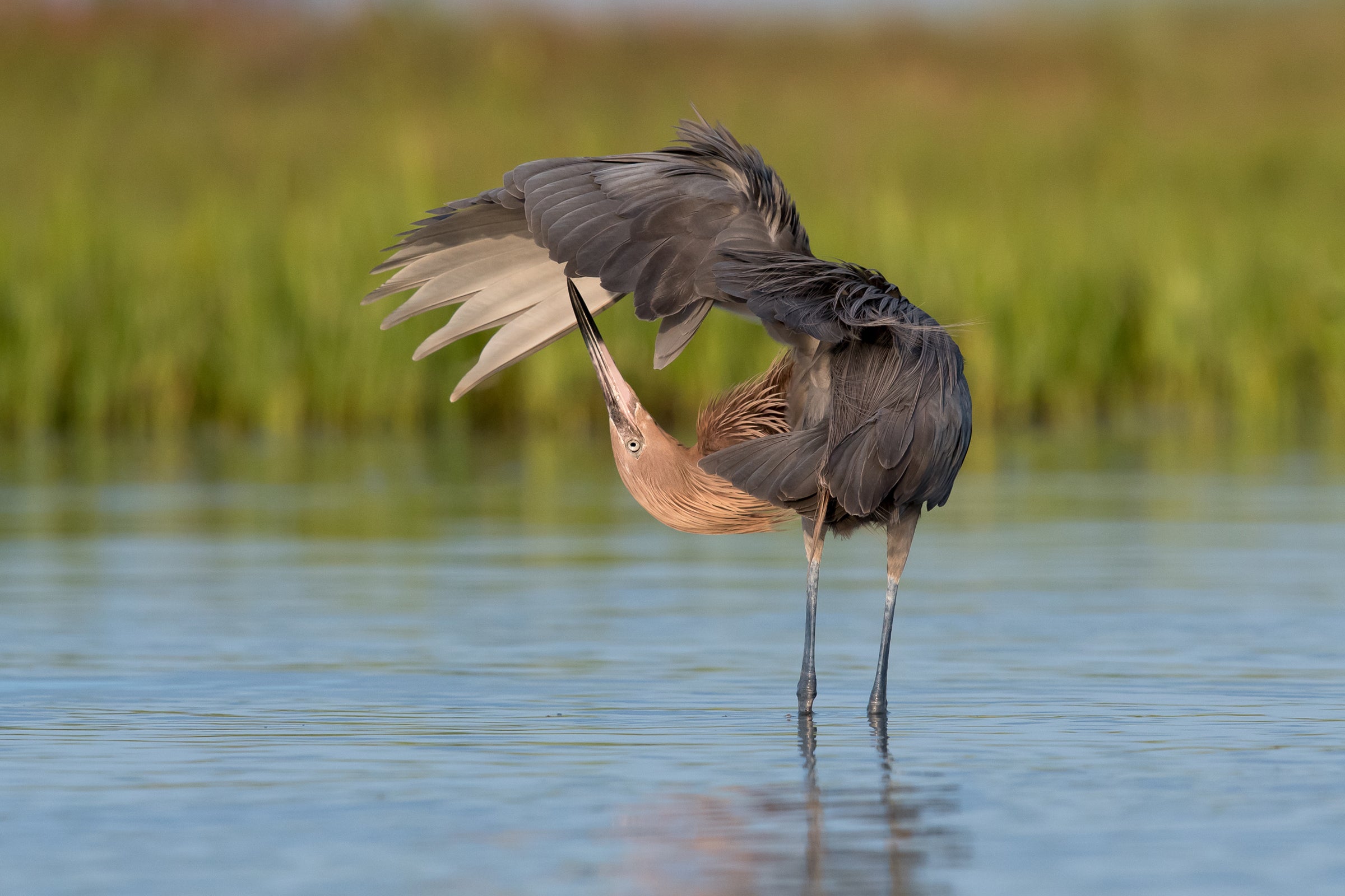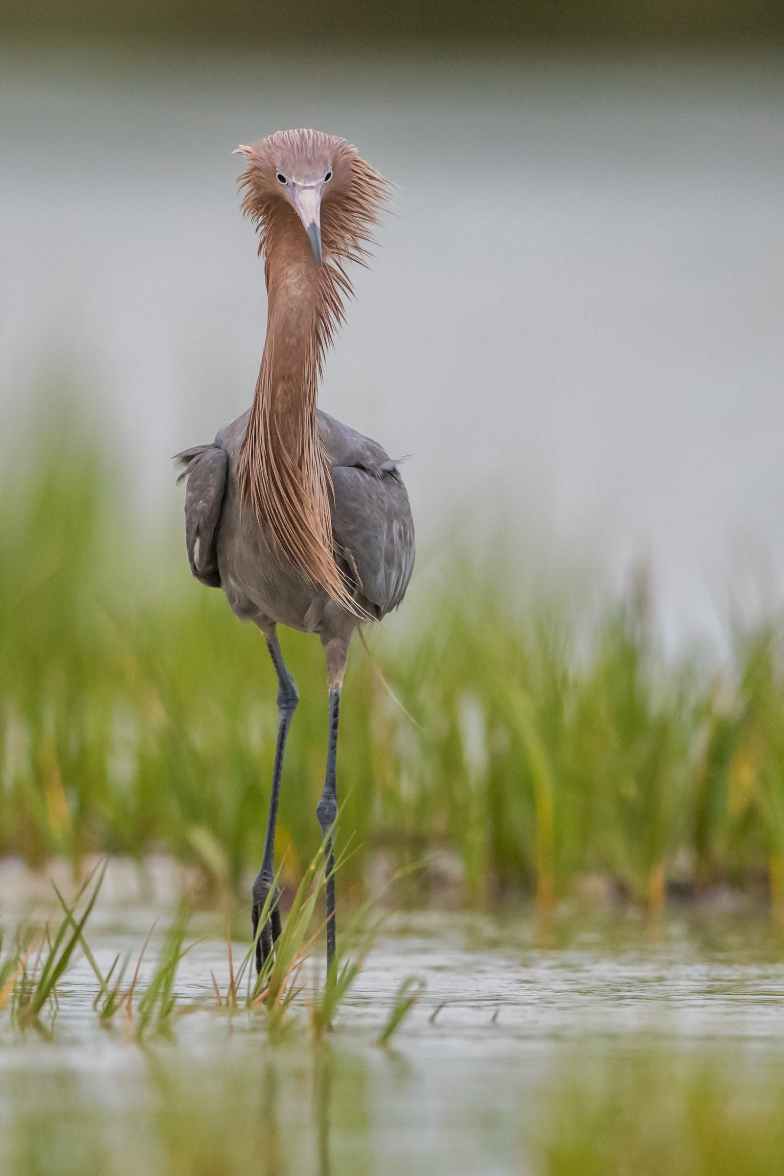 A conspicuously long-legged, long-necked wader of coastal regions, more tied to salt water than any of our other herons or egrets. Often draws attention by its feeding behavior: running through shallows with long strides, staggering sideways, leaping in air, raising one or both wings, and abruptly stabbing at fish. Also notable for its two color morphs. Reddish Egrets are either dark or white for life, beginning with the downy stage in the nest. Mated pairs may be of the same or different color morphs, and broods of young may include either or both morphs. Over most of range, dark birds are far more numerous.