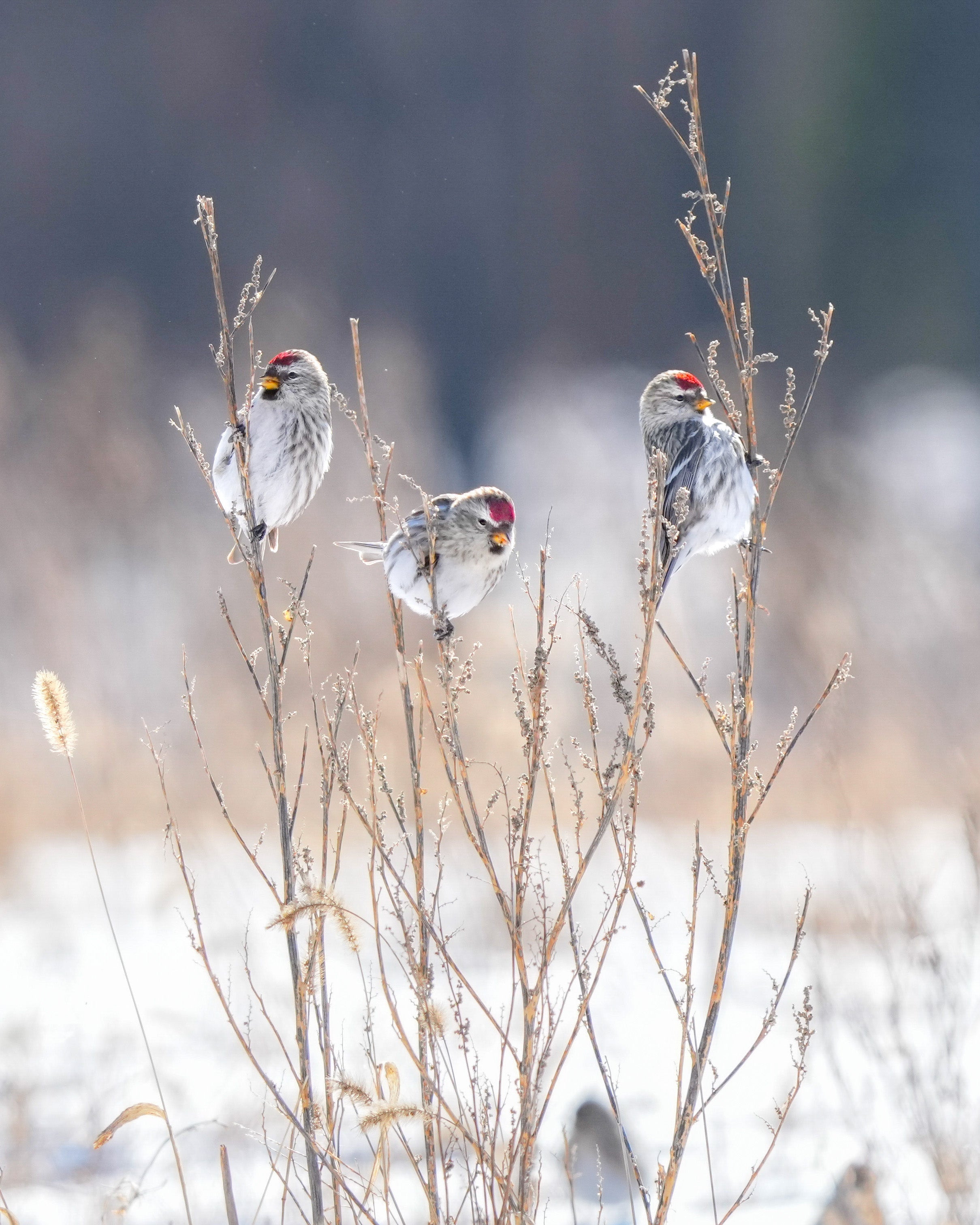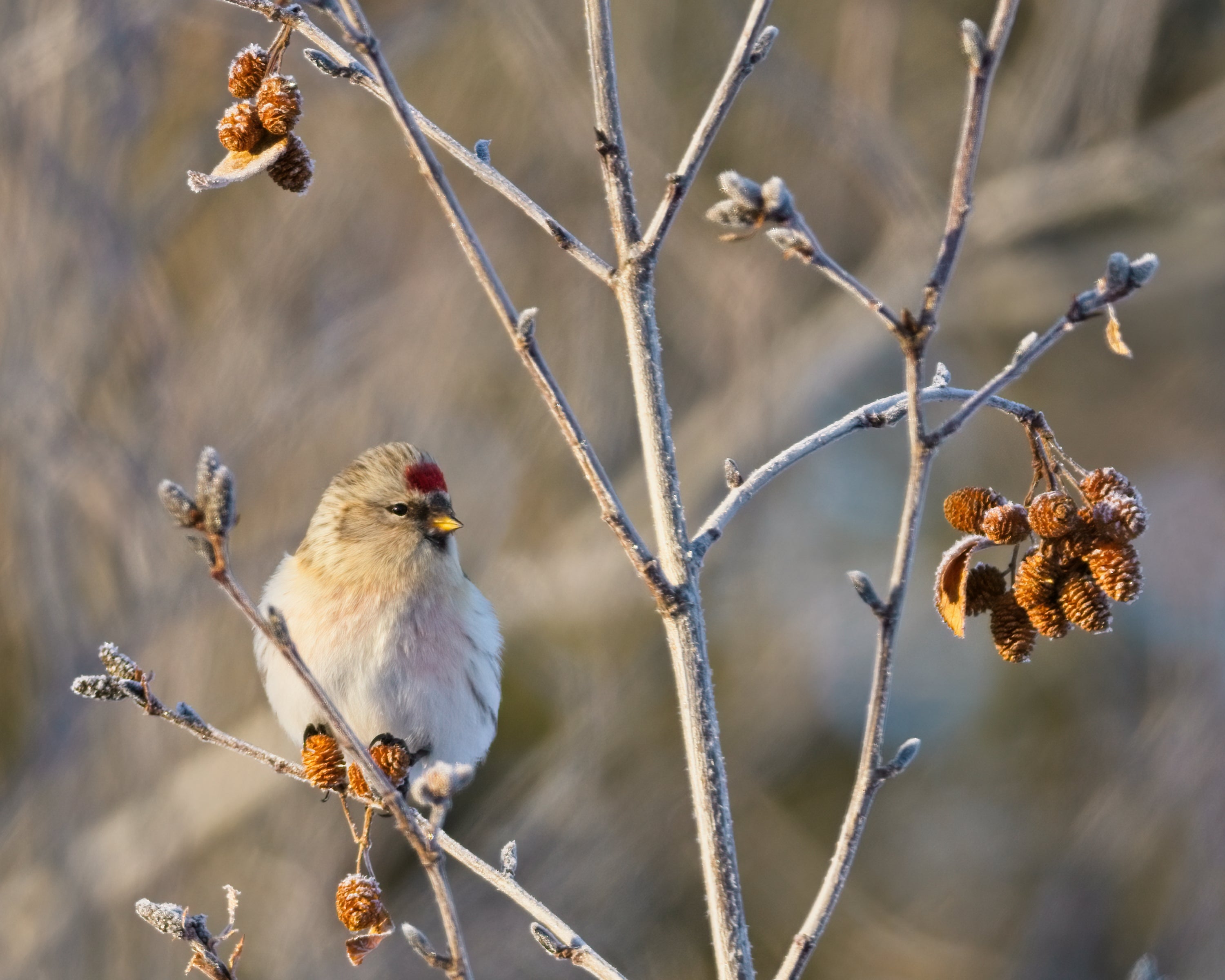 Birches, thickets, tundra scrub. In winter, weeds, brush. The Redpoll breeds in shrubby habitats of the North, including clearings in birch or spruce forest, thickets of willow, alder, or dwarf birch, and bushy areas on tundra. Winters in various kinds of semi-open country, including woodland edges and brushy or weedy fields.