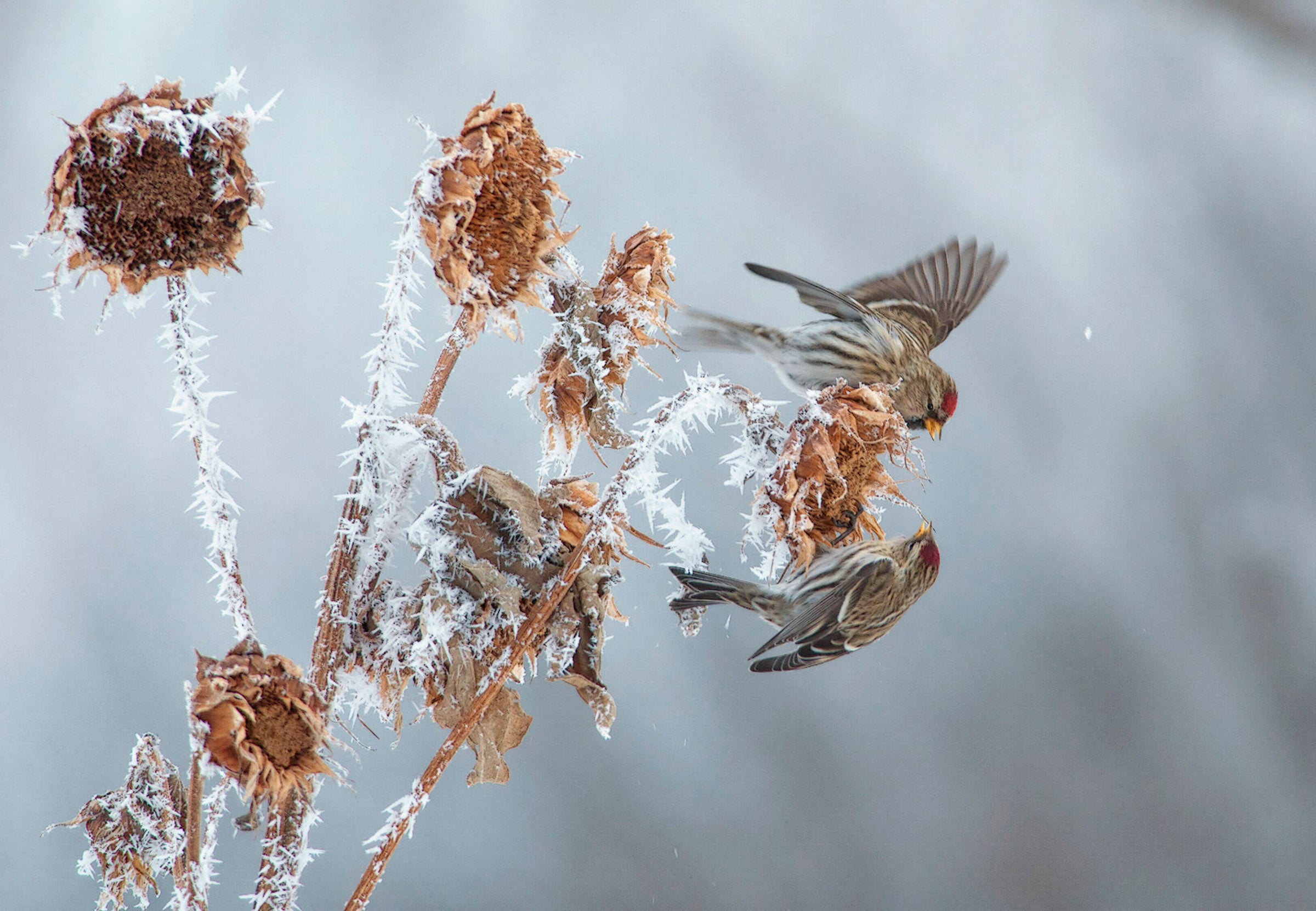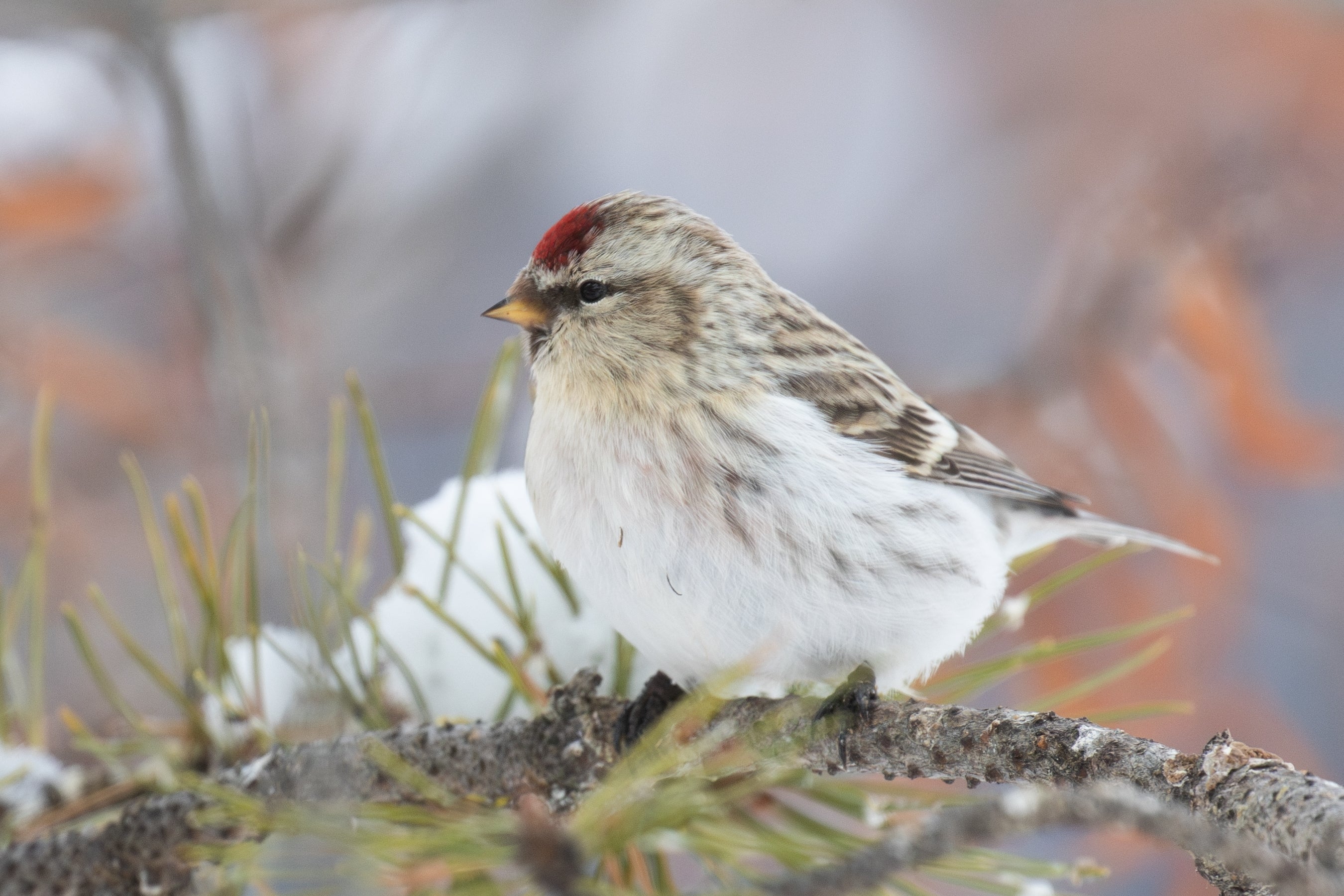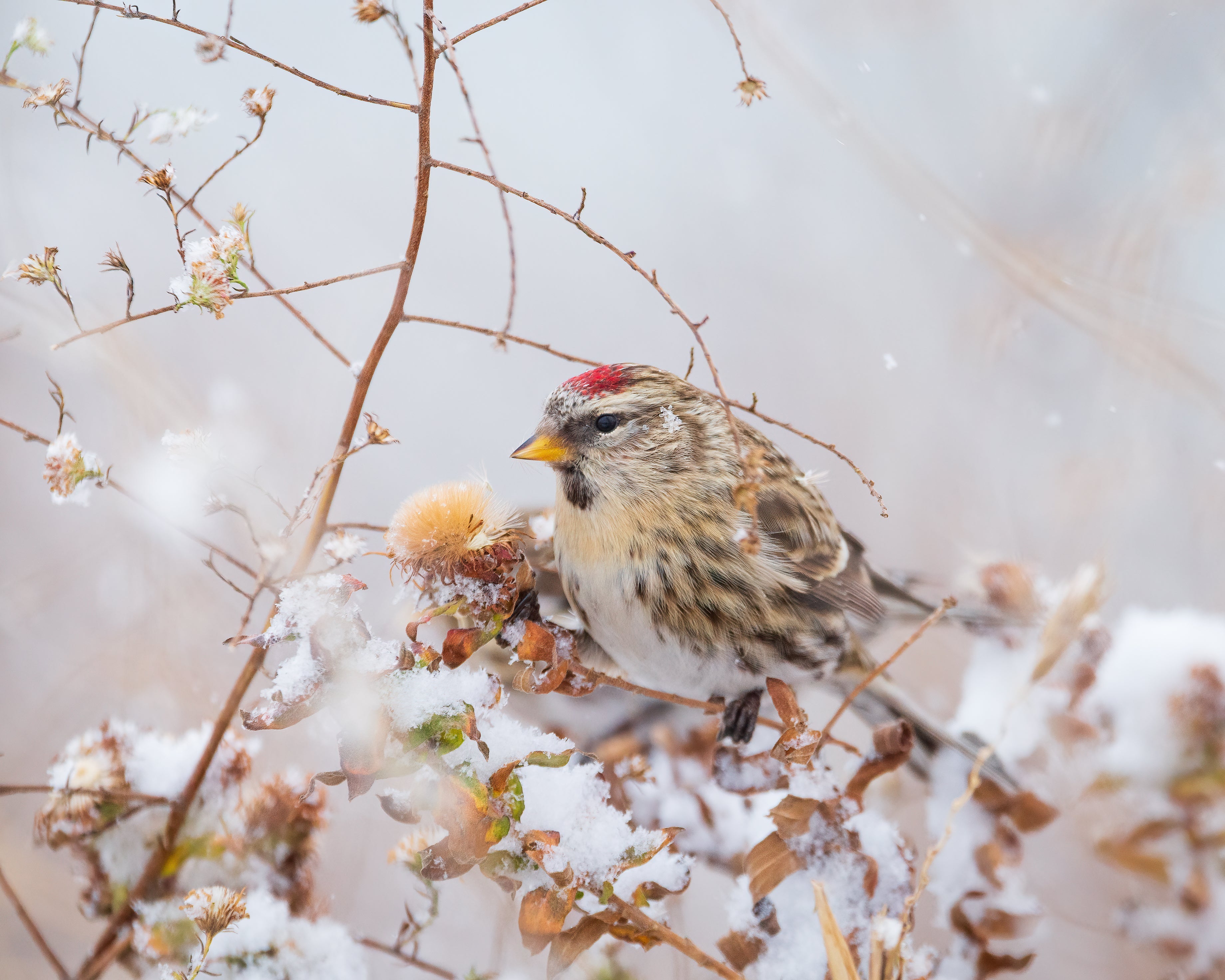 One of the 'winter finches,' nesting in the Arctic and sometimes invading southern Canada and the northern states. Redpolls are tiny, restless birds, feeding actively on seeds among trees and weeds, fluttering and climbing about acrobatically, their flocks seemingly always on the move. At bird feeders in winter, Redpolls are often remarkably tame. For their small size, they have a remarkable ability to survive cold temperatures; their southward flights are sparked by the temporary scarcity of food in the North, not by cold. The northernmost breeding populations are noticeably paler and were formerly separated as a distinct species, Hoary Redpoll. Although they tend to stay farther north, a few of these paler birds may be mixed in with winter Redpoll flocks visiting southern Canada and the northern states.