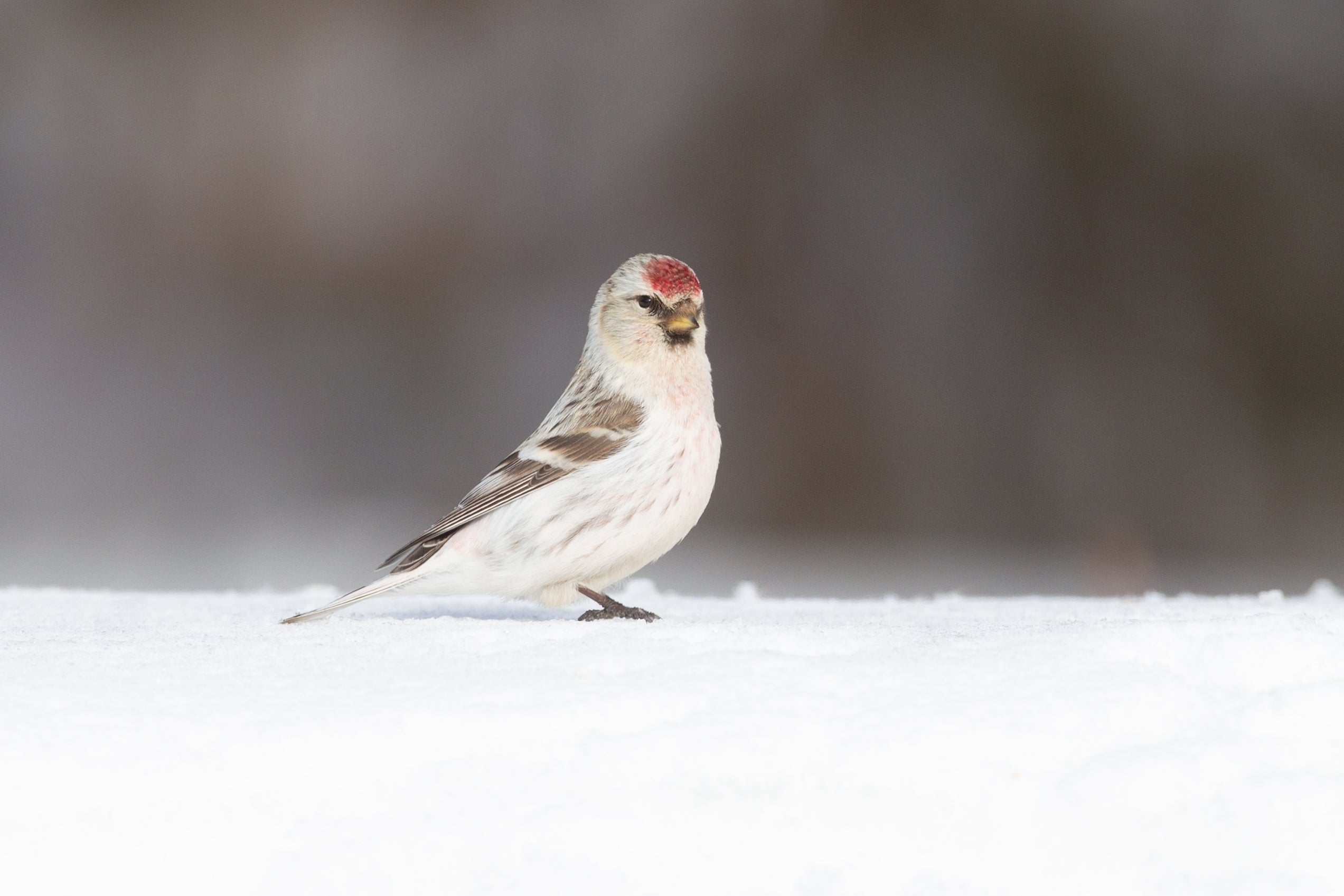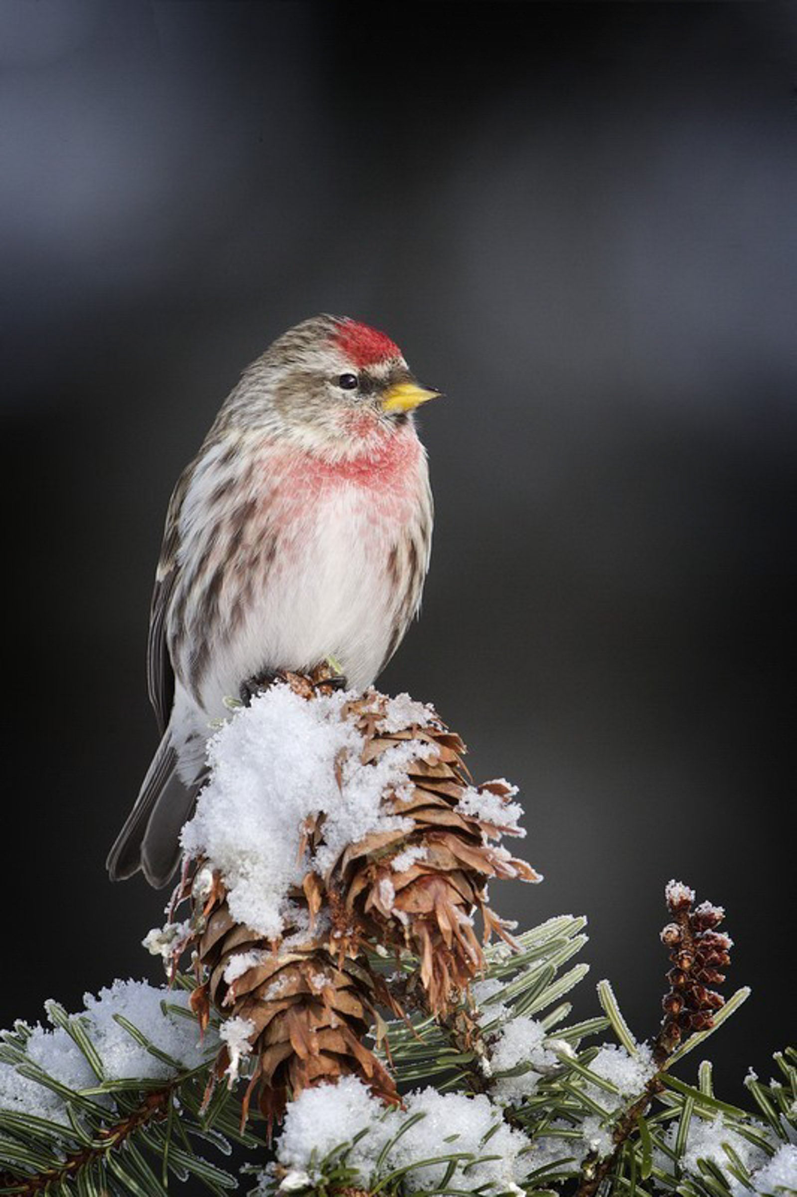 Both sexes — Length: 4.5–5.5 in (12–14 cm); wingspan: 8–10 in (20–25 cm); weight: 0.3–0.7 oz (9–20 g). The Redpoll is small, with a red forehead, a black chin, and a yellow bill. Darker overall in summer. Male has a variable pink wash on the chest. Compare Redpoll to House Finch and other red finches.