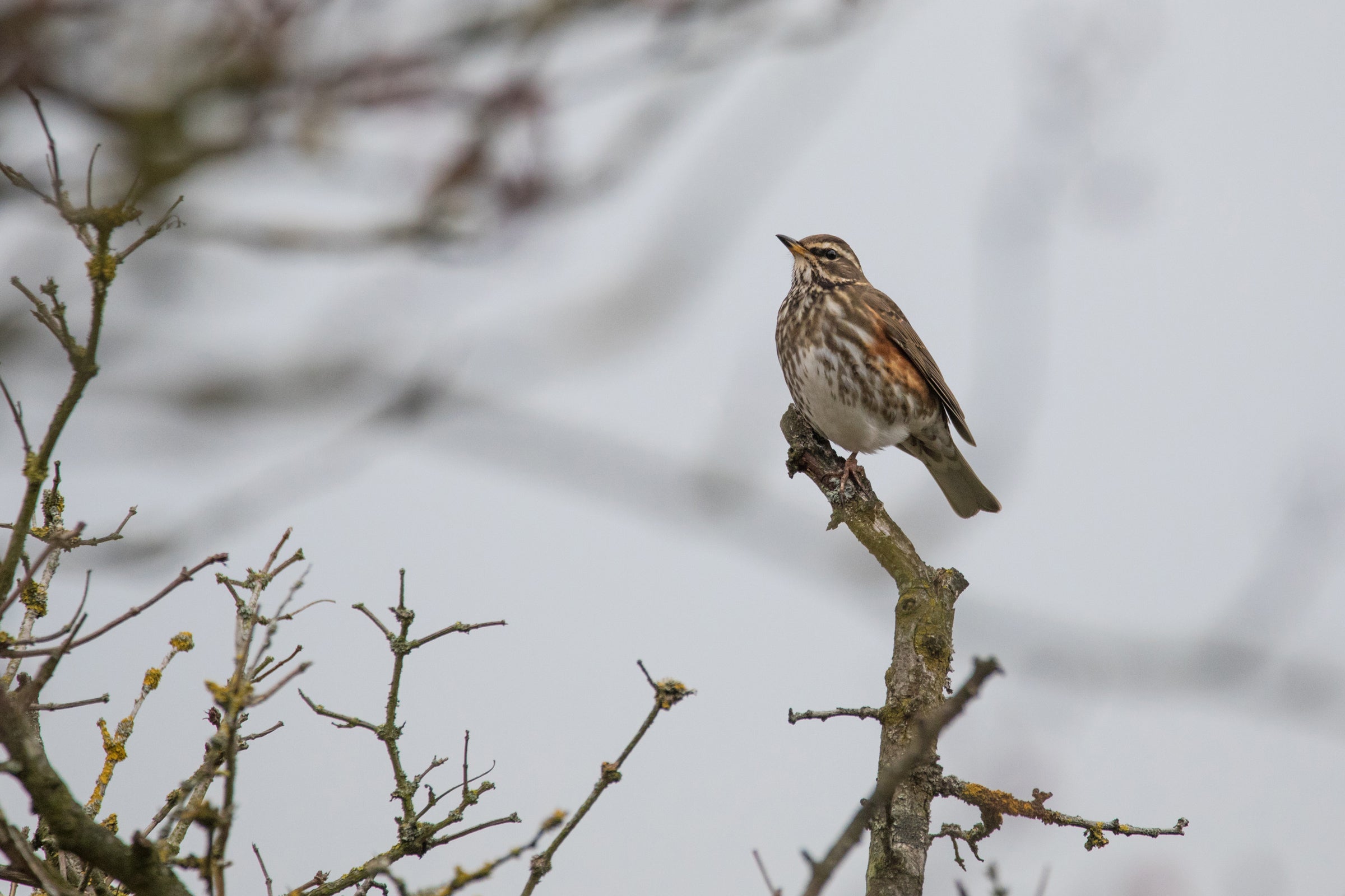 Inhabiting open woods and fields across Europe and northern Asia, this medium-sized thrush occurs regularly as close to our area as Iceland. Contrary to what its name might suggest, the red in its wing is only on the underside; on the perched bird, it shows up only as a rust color along the flanks. The Redwing has strayed to northeastern North America several times, mostly in winter.