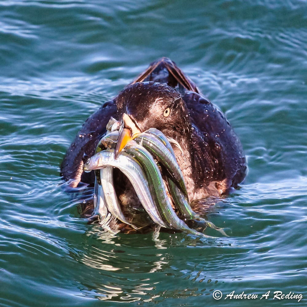 Fish, crustaceans. Food brought to nestlings is mostly small fish, particularly sand lance, herring, and anchovy, also rockfish, smelt, saury, and others. Favors fish that gathers in dense schools. Diet of adults probably similar. Also eats crustaceans.