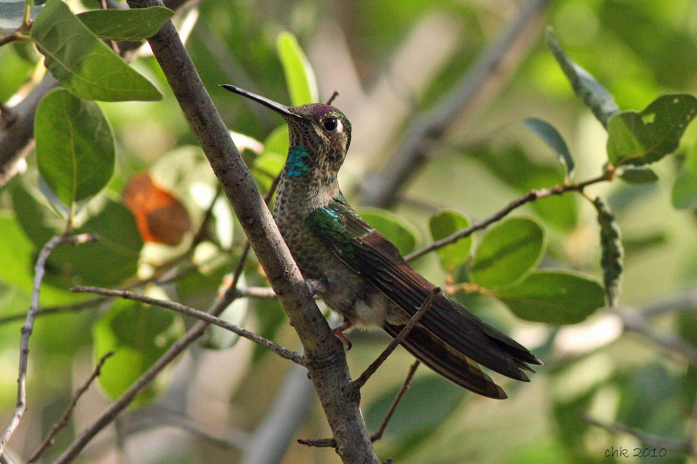 4 1/2 -5 1/2" (11-14 cm). A large, long-billed hummingbird. Male's green throat and purple crown flash in good light, but usually bird looks all dark, with white spot behind eye. Female plainer; note size, long bill, white stripe behind eye, mottled gray-green sides, small pale tips on outer tail feathers.