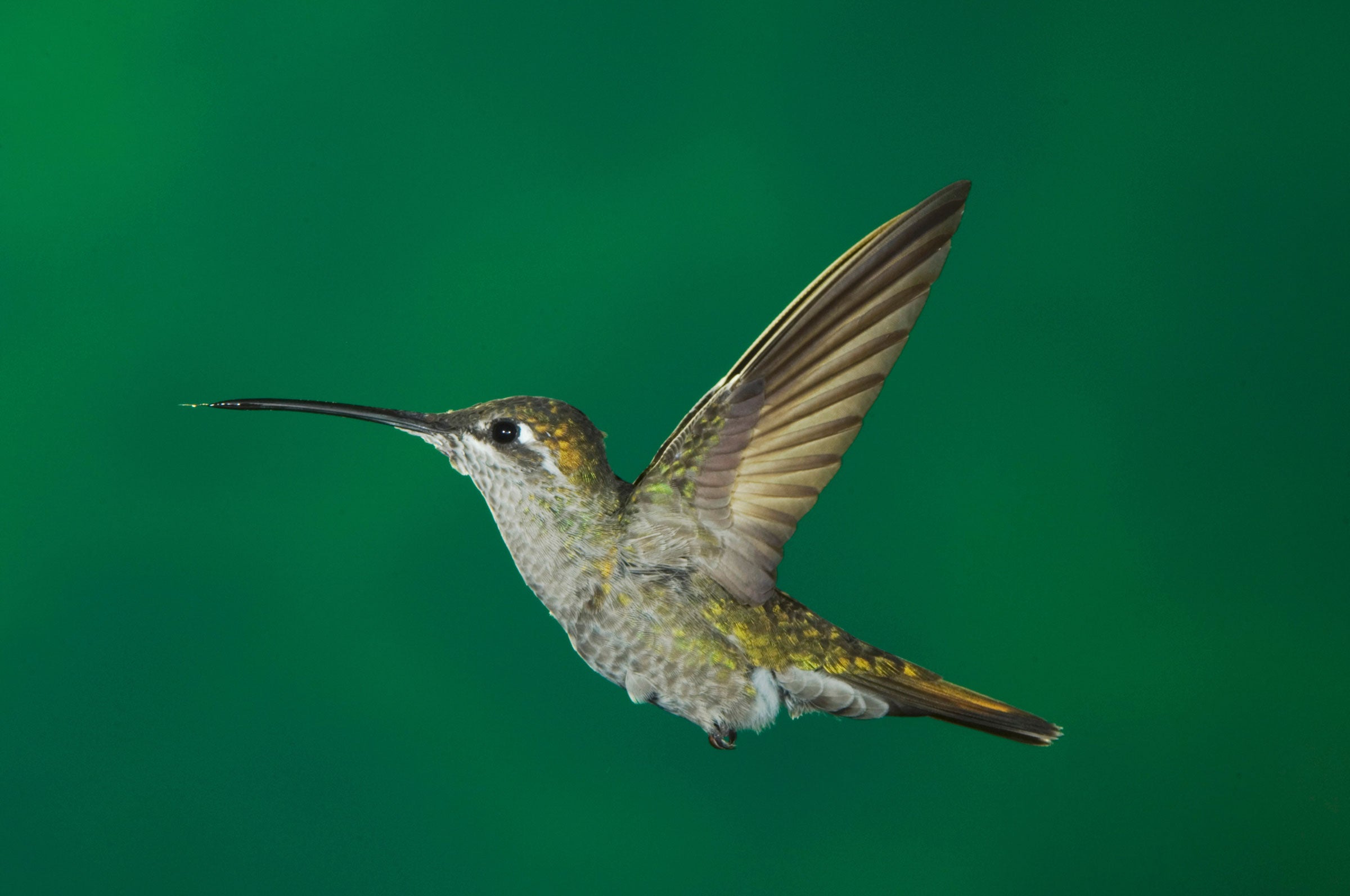 A big, long-billed hummingbird of forests in the southwestern mountains. Almost as large as the Blue-throated Hummingbird found in the same ranges, the Rivoli's is not usually so aggressive or conspicuous, but some individuals are very pugnacious in defending flower patches or feeders, even fighting with the Blue-throat at times. In hovering flight, the wingbeats are almost slow enough for the human eye to see.