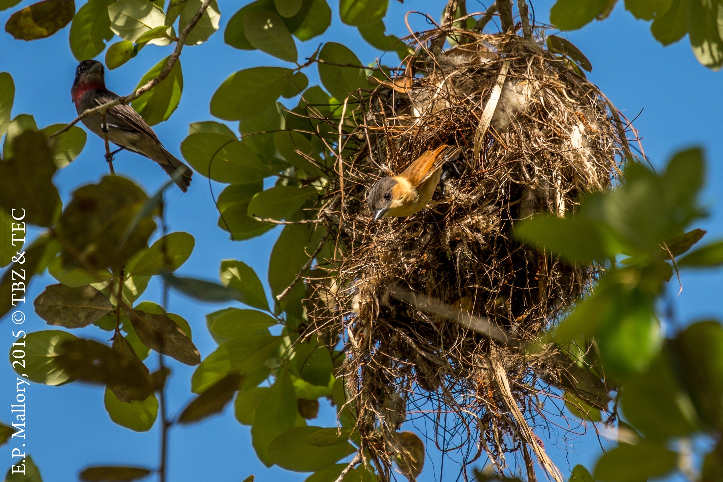 Male defends nesting territory by singing. Has a thin, rhythmic "dawn song," usually heard only before sunrise. Nest: Usually suspended at the end of a long hanging branch, under the shady canopy of a large tree (sycamore or cottonwood in Arizona), up to 50' above the ground. Nest (built mostly by female, with some help from male) is a very large globular mass of vegetation, with the entrance low on one side; made of bark strips, grass, weeds, vines, spiderwebs, and other materials. More material may be added even after incubation begins.