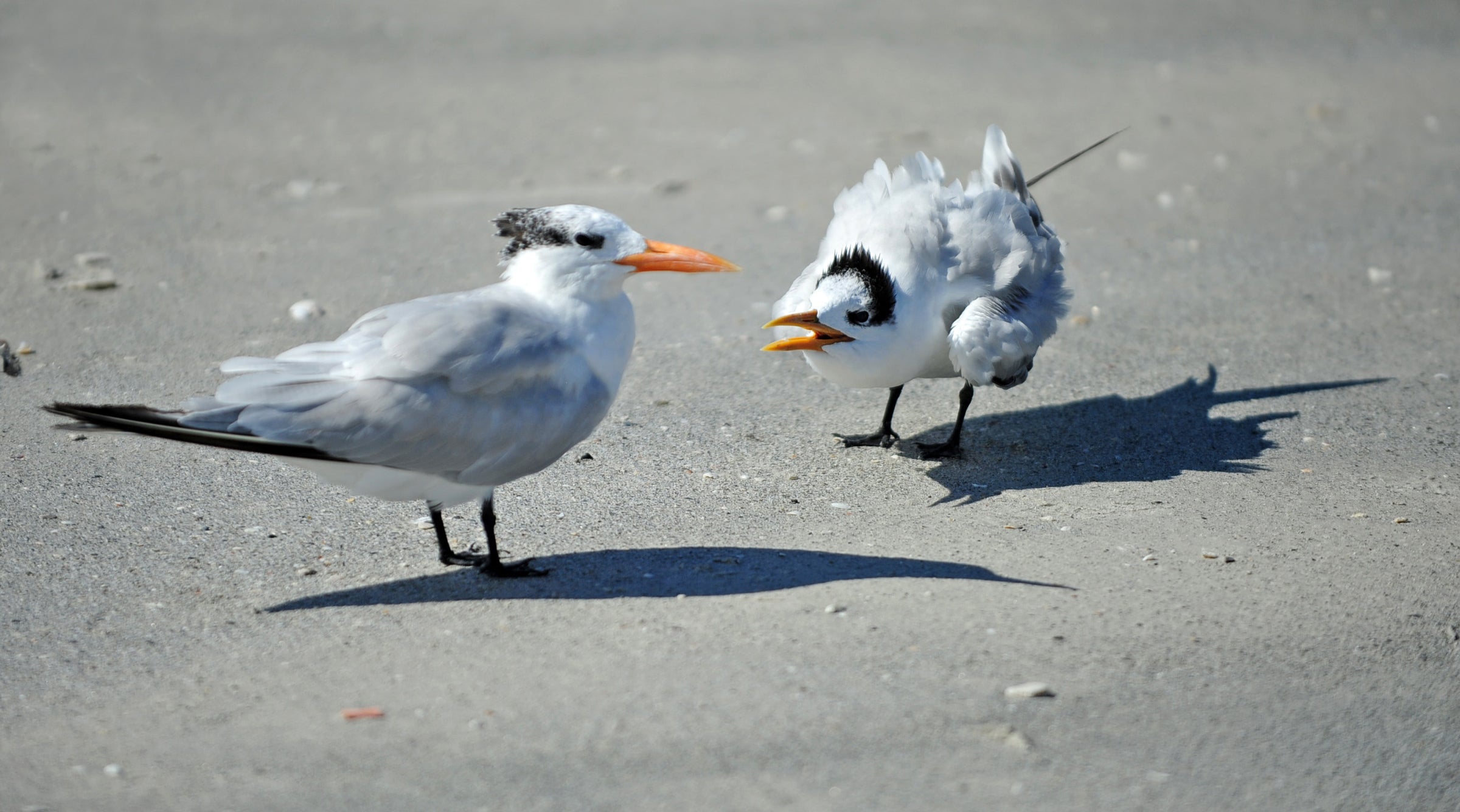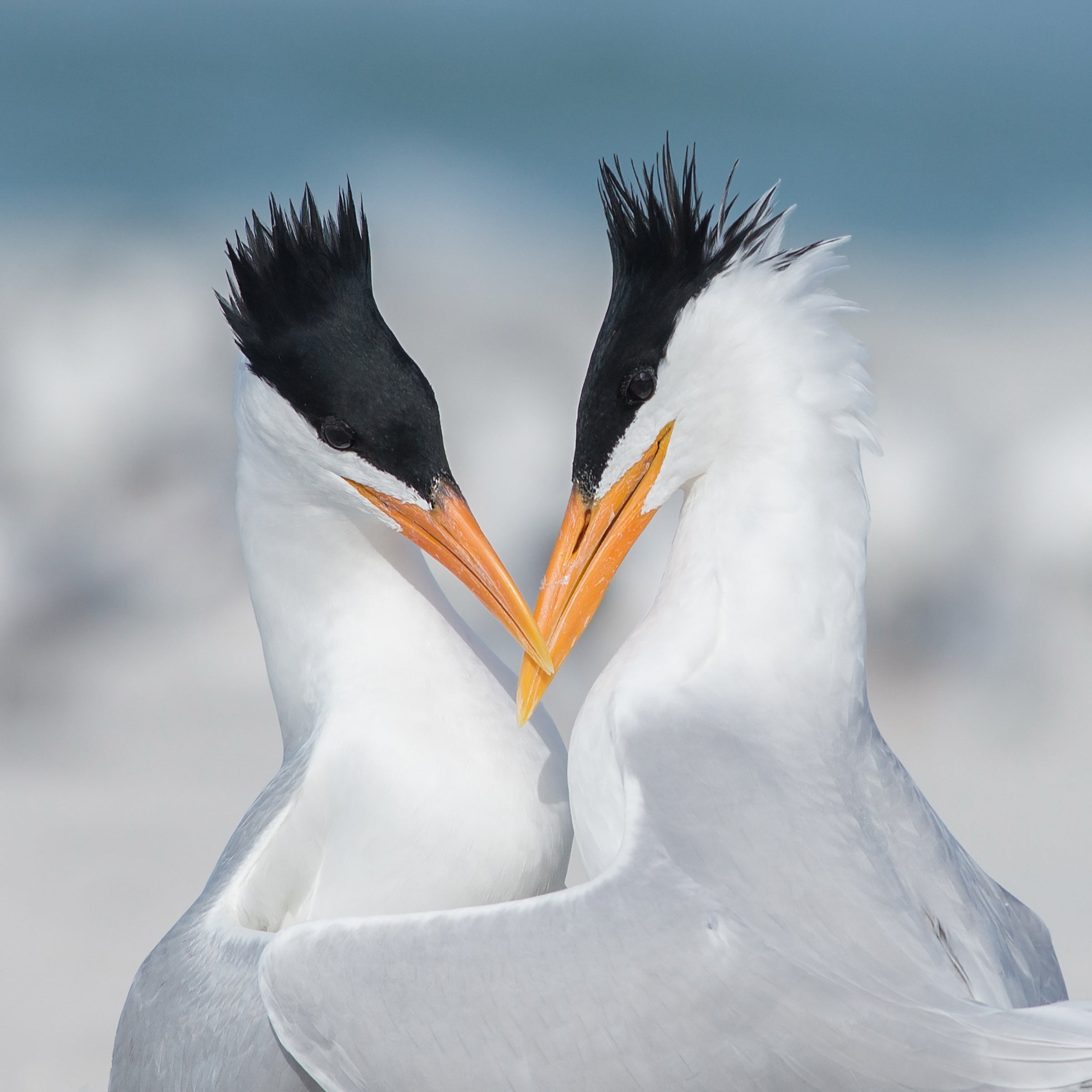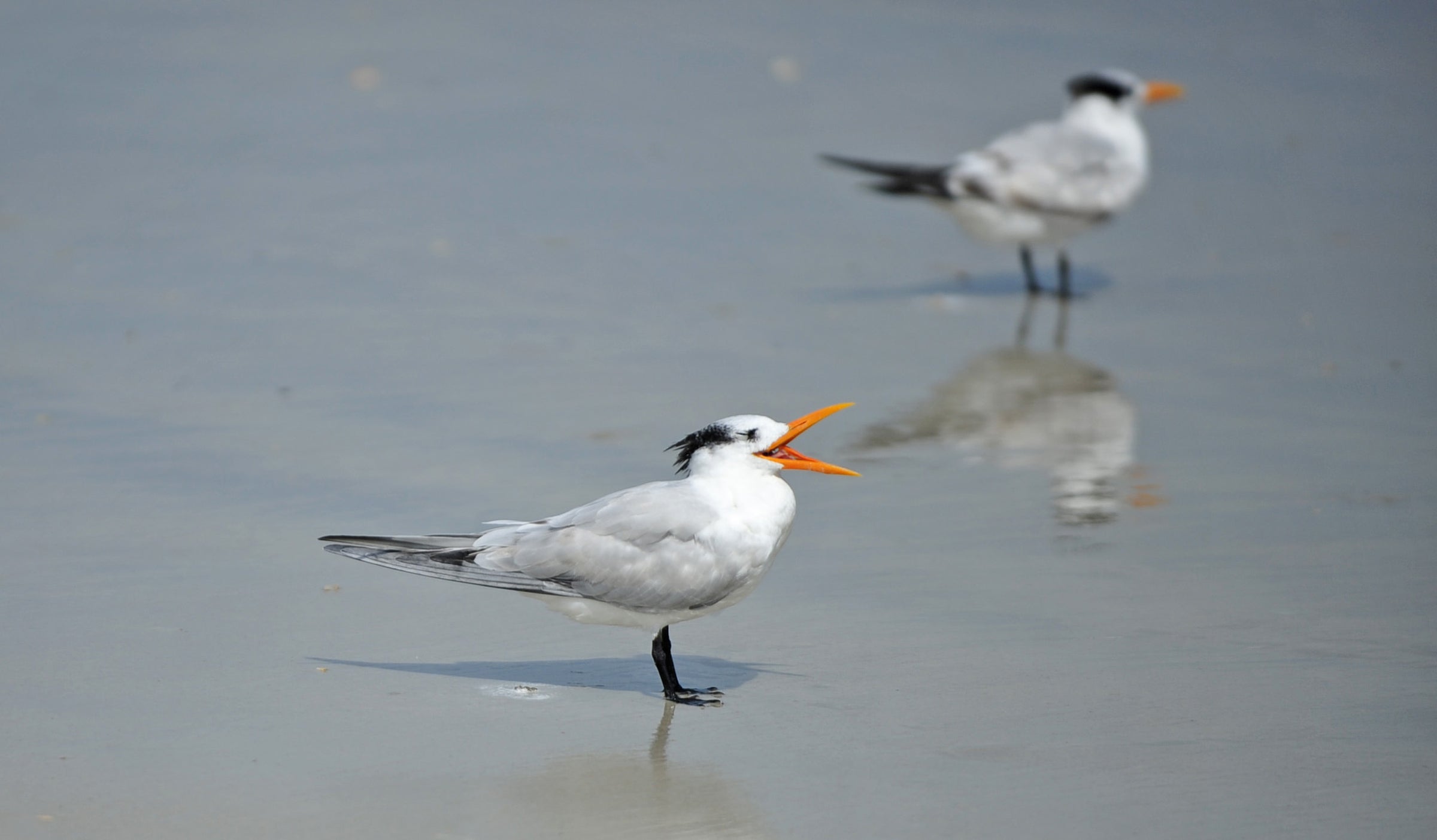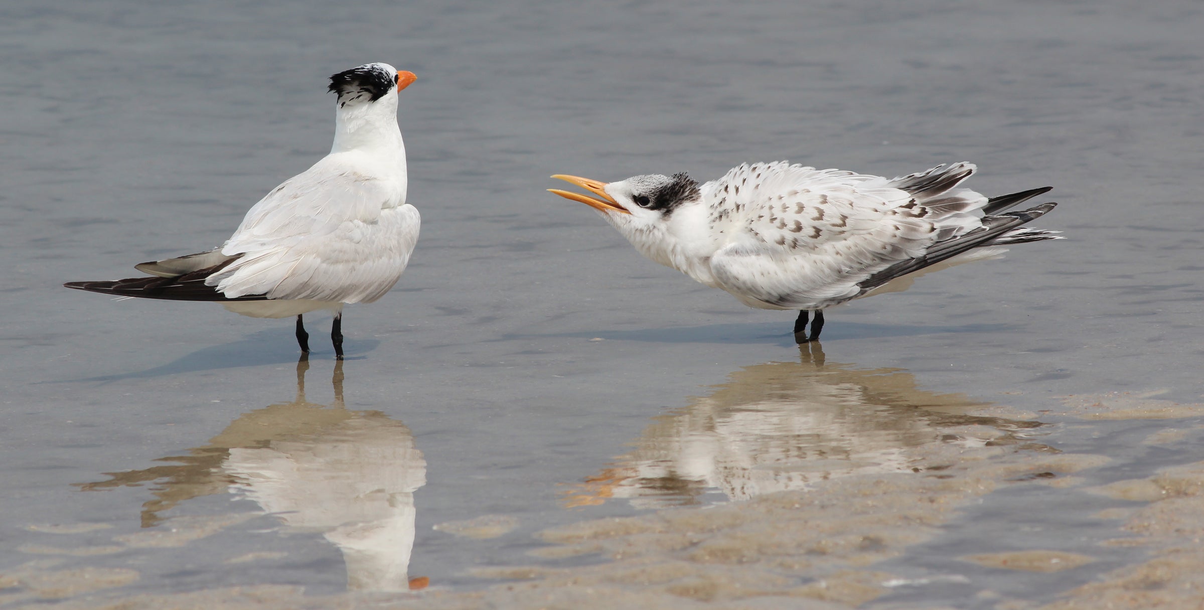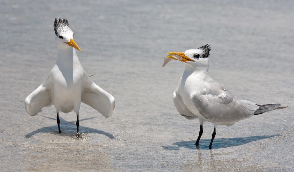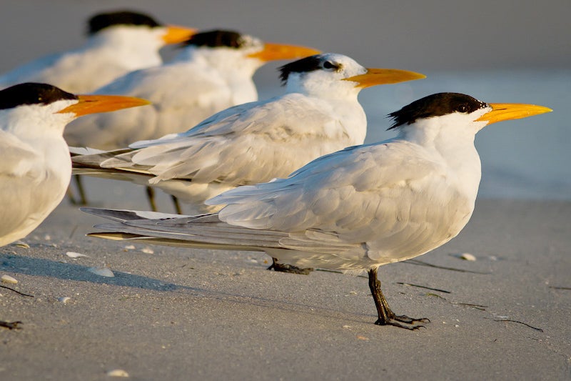 Common along tropical and subtropical shores, the Royal Tern is a characteristic sight along the Gulf Coast and southern Atlantic Coast, less numerous in California. Aside from a few interior localities in Florida, it is almost never found inland except after hurricanes.