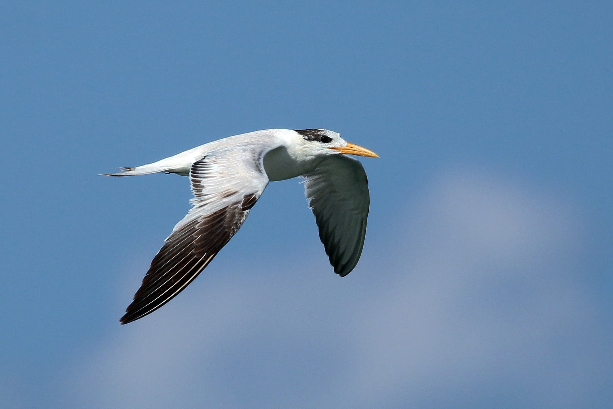 18-21" (46-53 cm). C A bit slimmer than Caspian Tern, with wispy crest, fairly thick carrot orange bill. Underside of wingtips much paler. Forehead is white most of year (becomes black for part of breeding season). On Pacific Coast, see Elegant Tern.