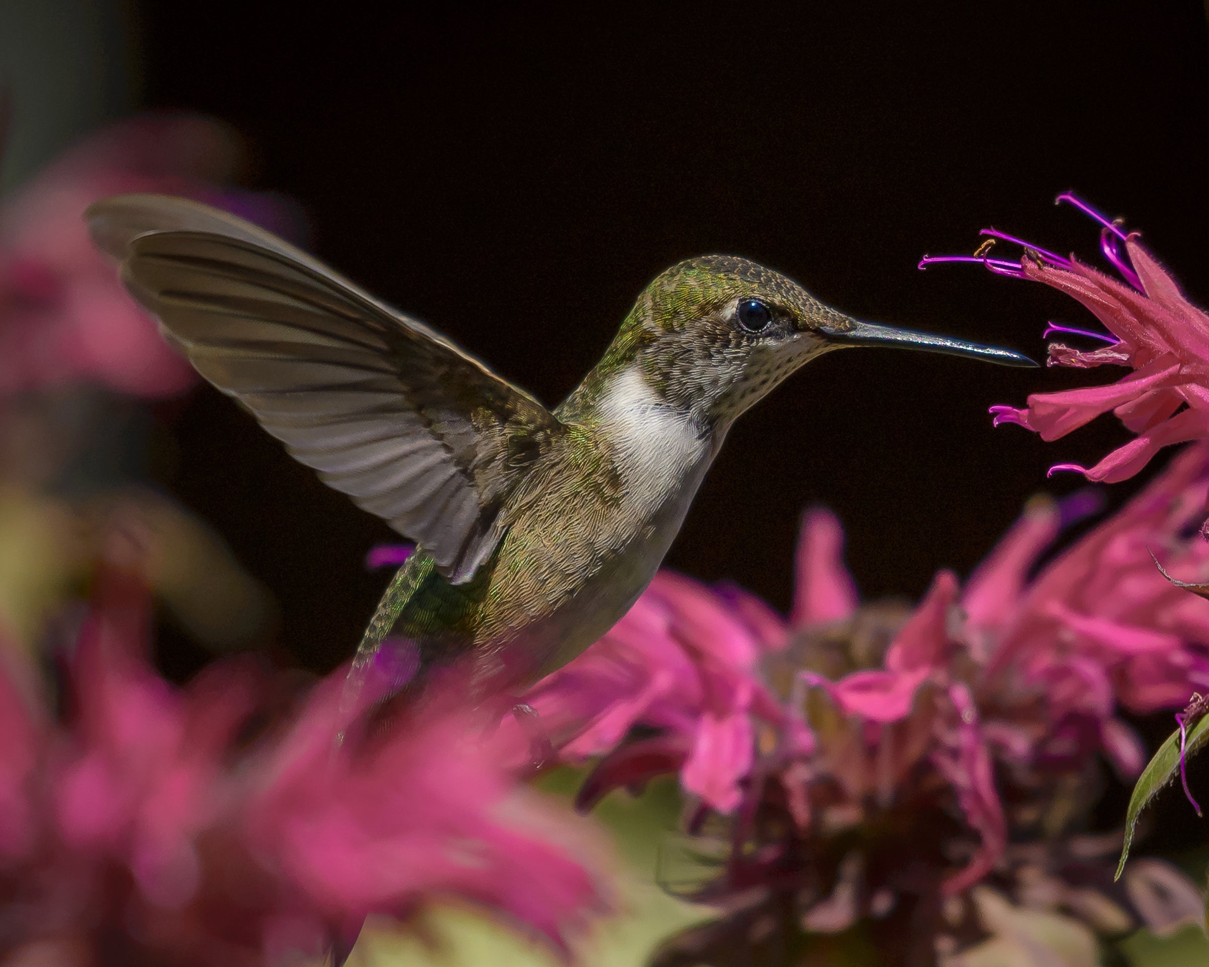 Hundreds of kinds of hummingbirds nest in the American tropics, and more than a dozen in the western U.S., but east of the Great Plains there is only the Ruby-throat. There it is fairly common in summer in open woods and gardens. Hovering in front of a flower to sip nectar, it beats its wings more than 50 times per second. Impressive migrants despite their small size, some Ruby-throats may travel from Canada to Costa Rica.