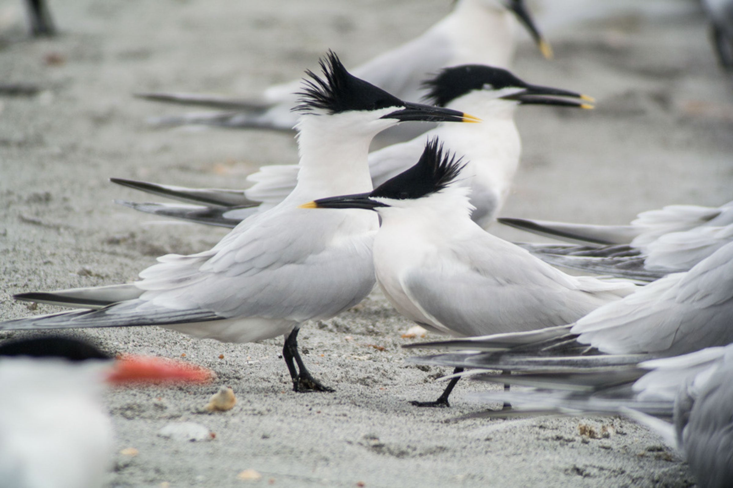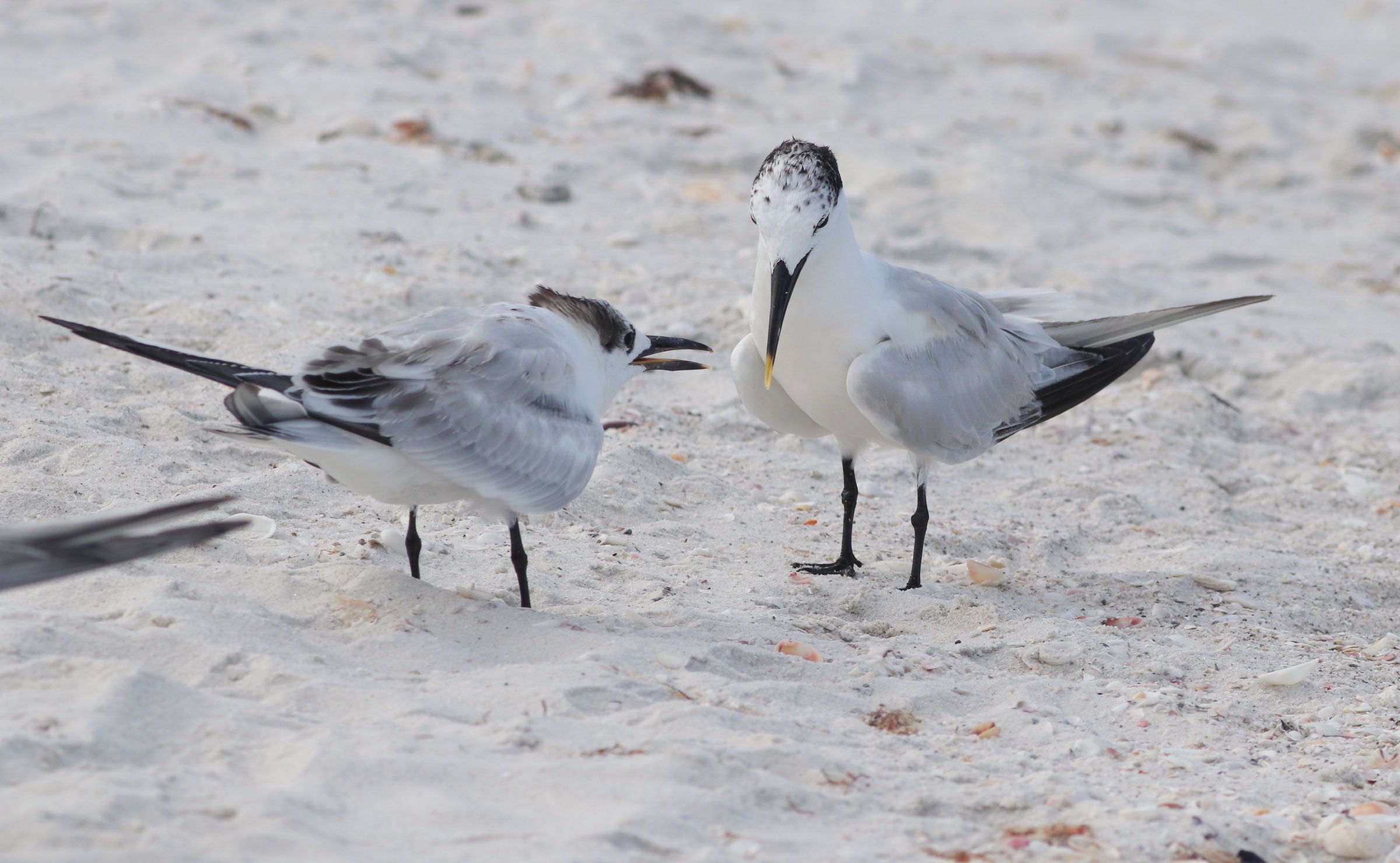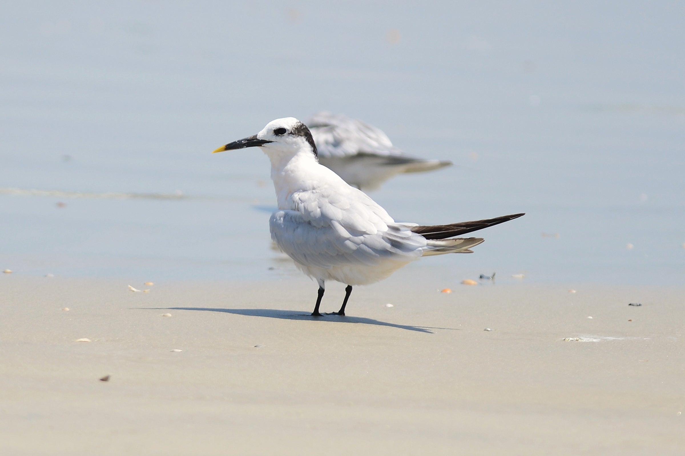 A slim, long-billed tern, swift and graceful in flight. Strictly coastal in the southeastern states. Larger than the typical terns of the Forster's / Common sort, but distinctly smaller than Royal or Caspian terns. Might be thought of as the Royal Tern's sidekick; typically found with that species, usually even nesting in mixed colonies with it, but tends to be less numerous. Named after the town of Sandwich in County Kent, England, where this tern was first discovered.