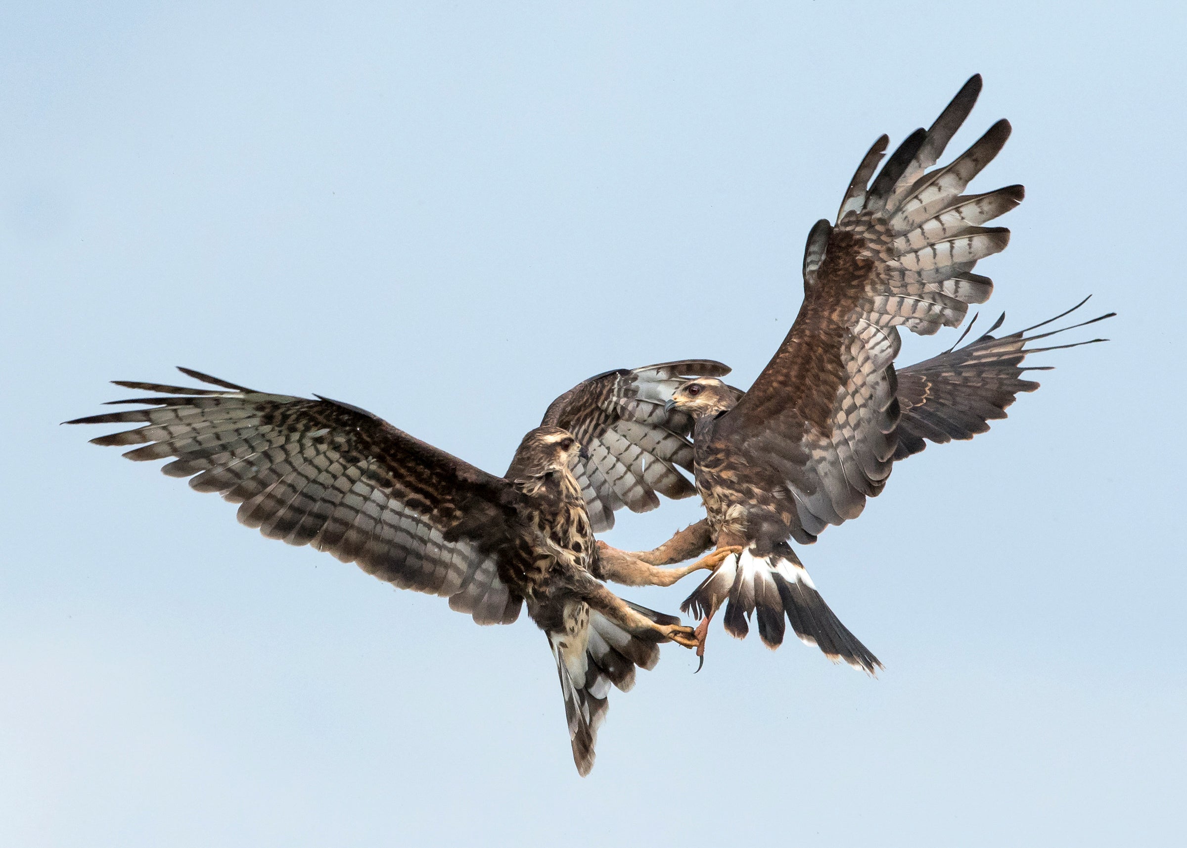 16-18" (41-46 cm). W. 3' 8 (1.1 m). Broad wingtips, deeply hooked bill, orange-red legs and face. Male has slaty black, with much white at base of tail. Female browner, with white marks on face and streaks below, barring on wing feathers.