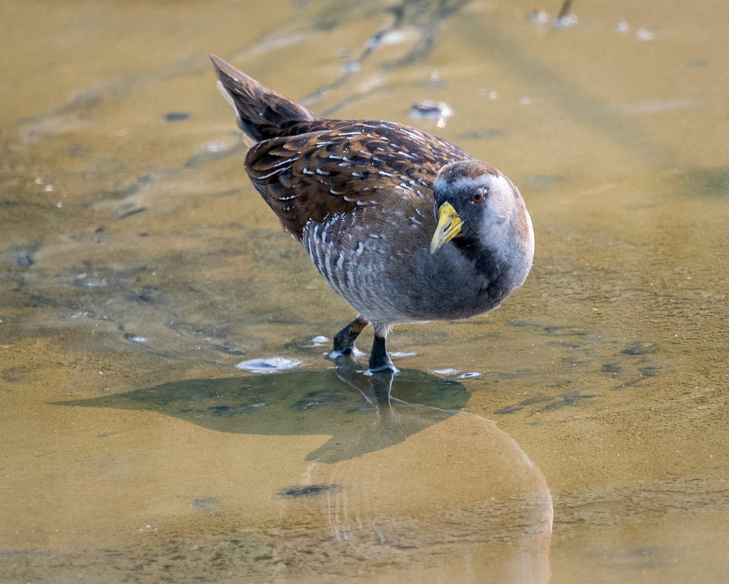 The Sora makes its presence known with plaintive whistles and whinnies rising from the marshes all across North America. Despite its abundance, it is not often seen: As with other rails, it spends most of its time hidden in dense marshy growth or wet meadows. Occasionally it will walk about in full view at the edge of a pond, delighting any birders who happen to be nearby. Although Soras might seem like weak fliers when seen fluttering over the marsh, they regularly migrate long distances, many going to South America for the winter.
