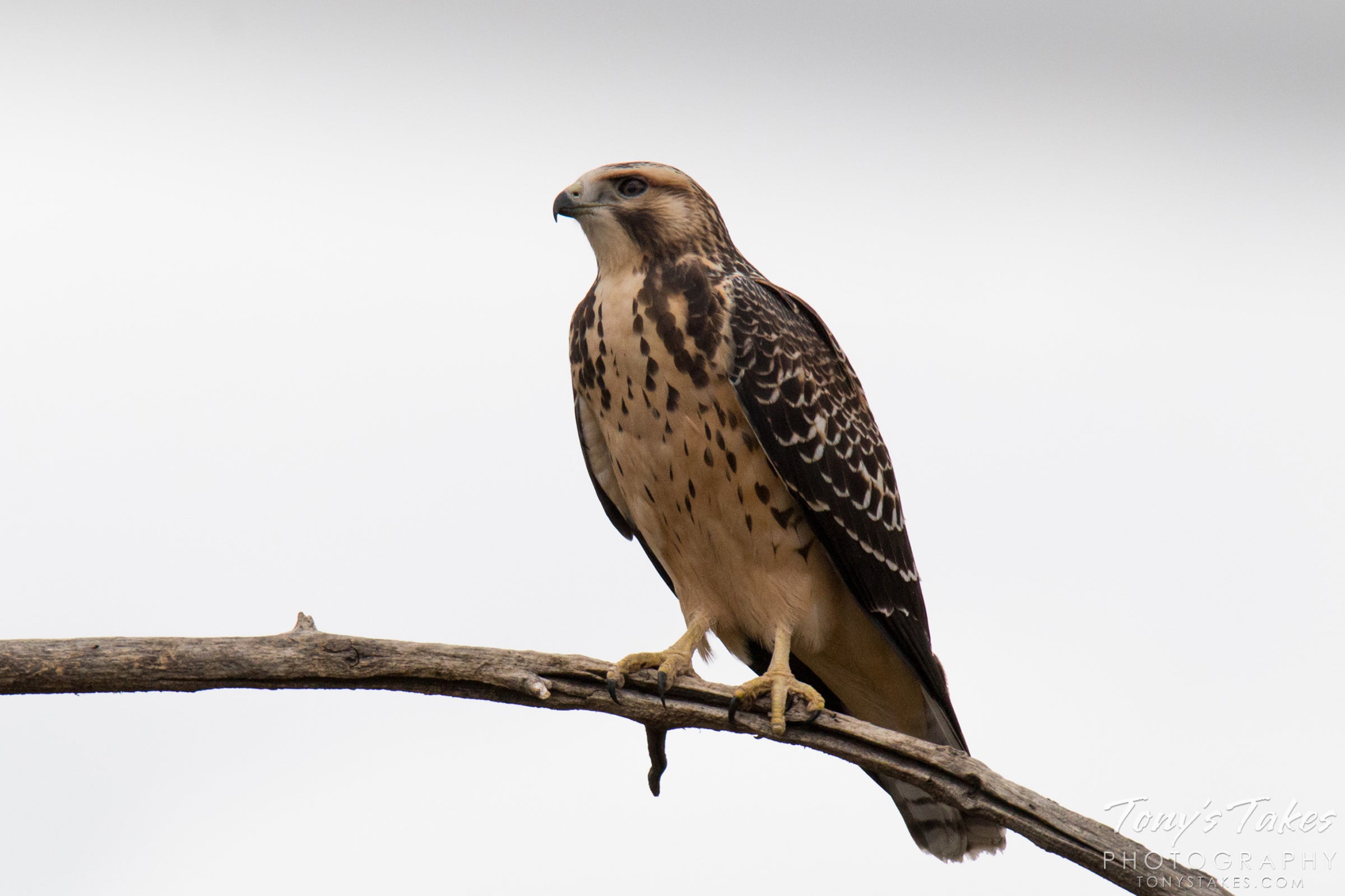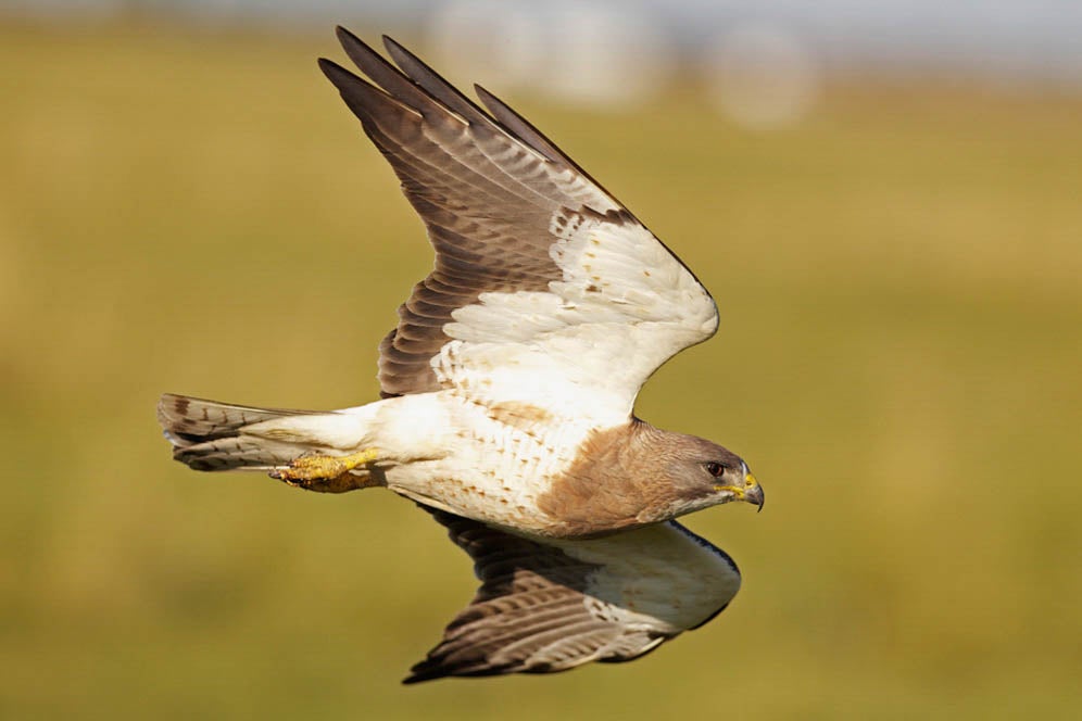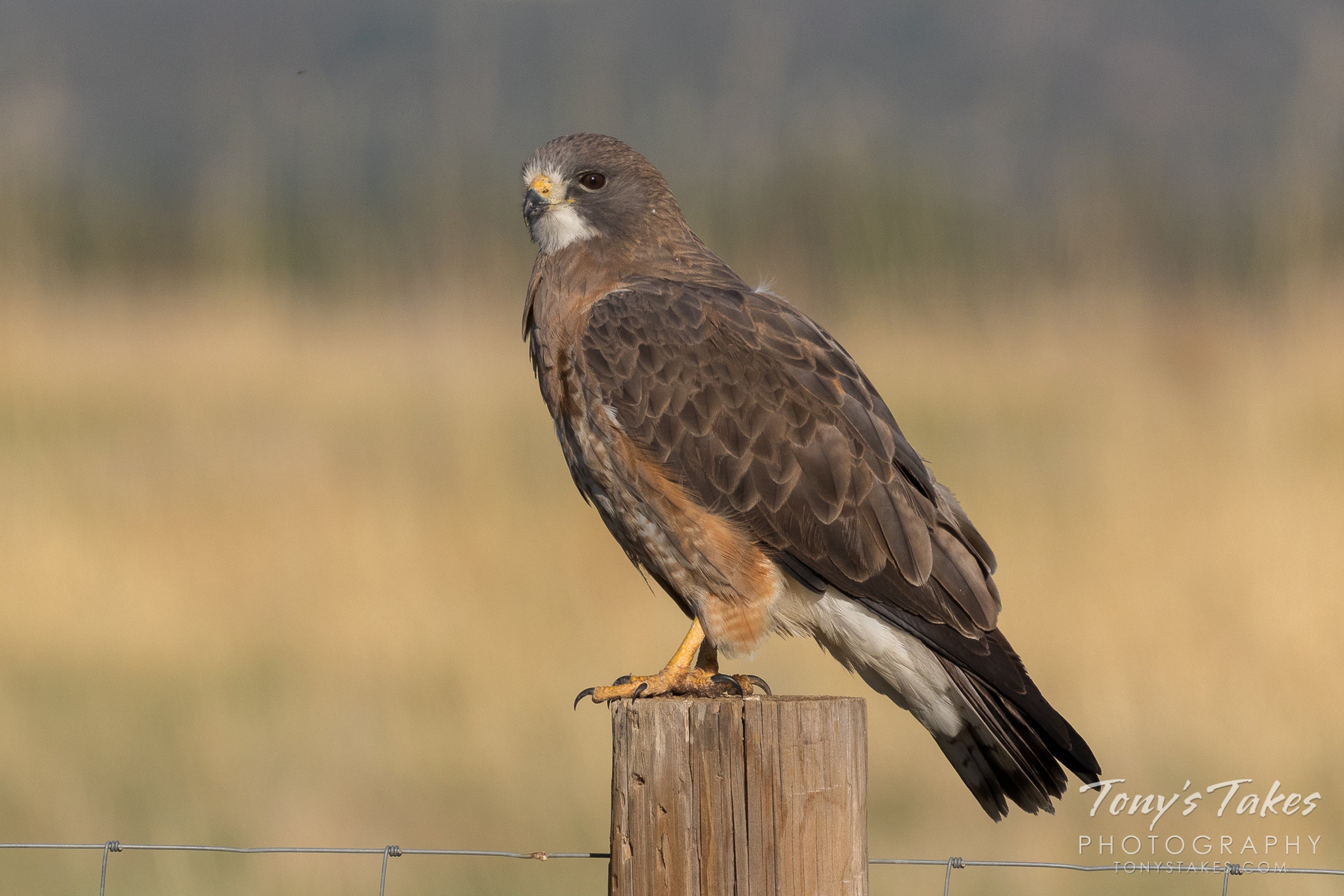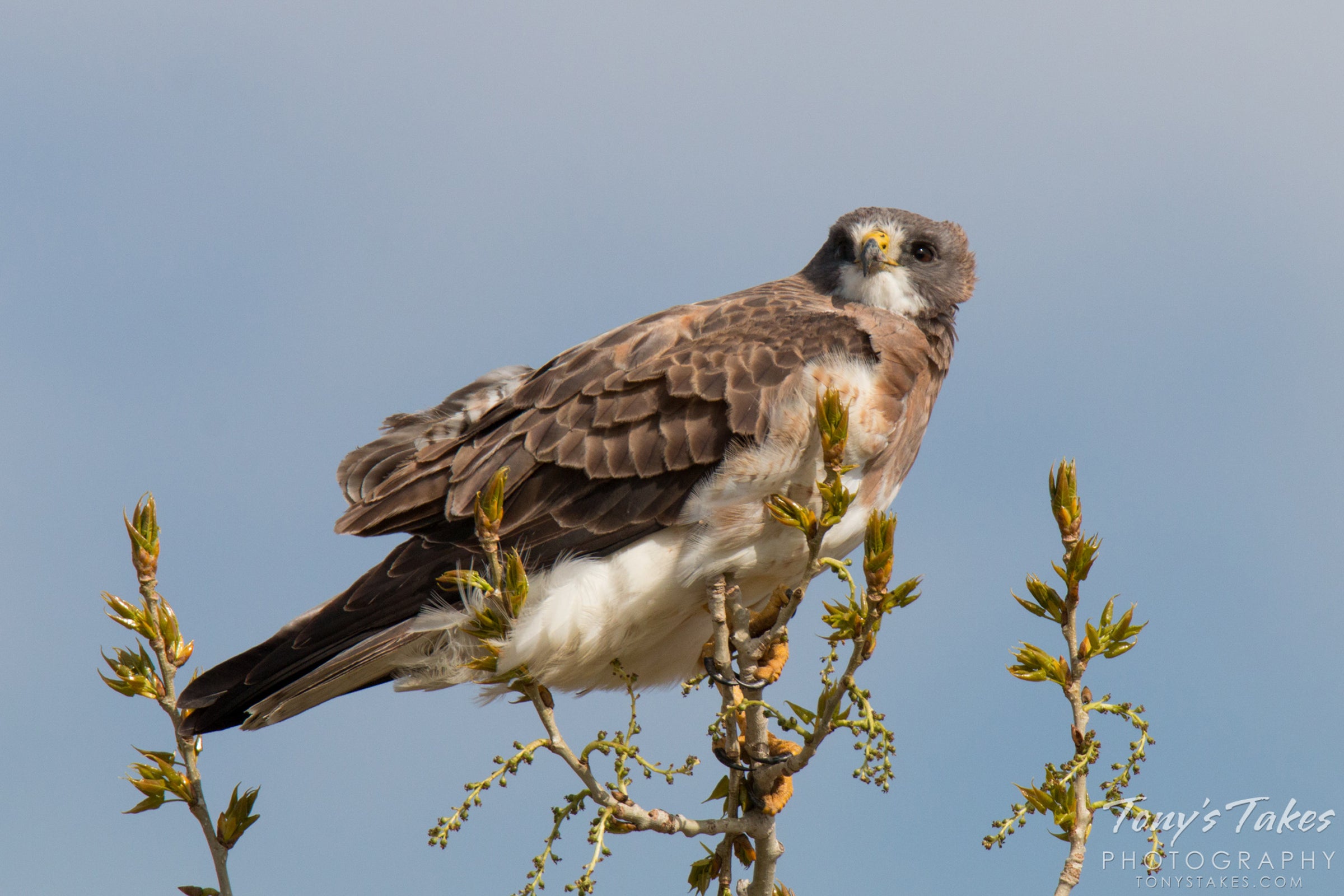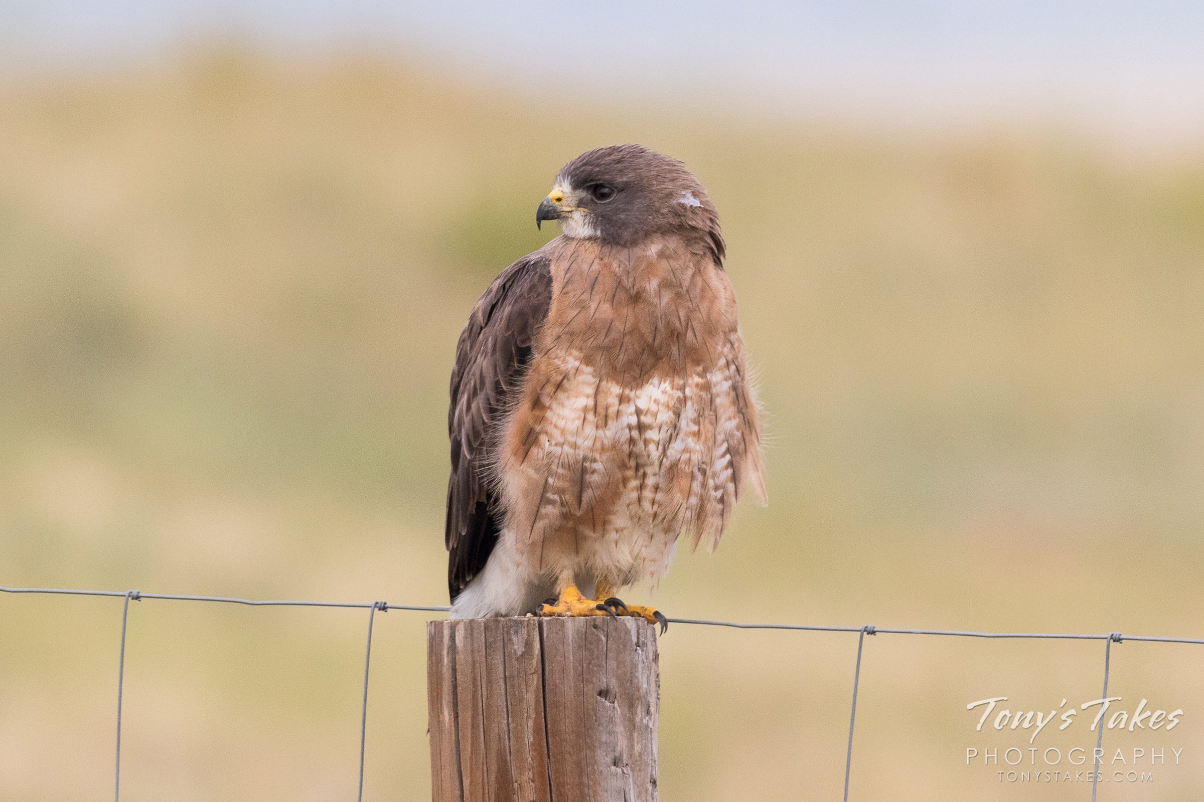 This slim and graceful hawk is a common sight over grasslands of the Great Plains and the west, but only in summer: every autumn, most individuals migrate to southern South America. Although Swainson's Hawk is big enough to prey on rodents, snakes, and birds (and does so, while it is raising young), at most seasons it feeds heavily on large insects instead. Flocks are often seen sitting on the ground in fields where there are many grasshoppers or caterpillars.
