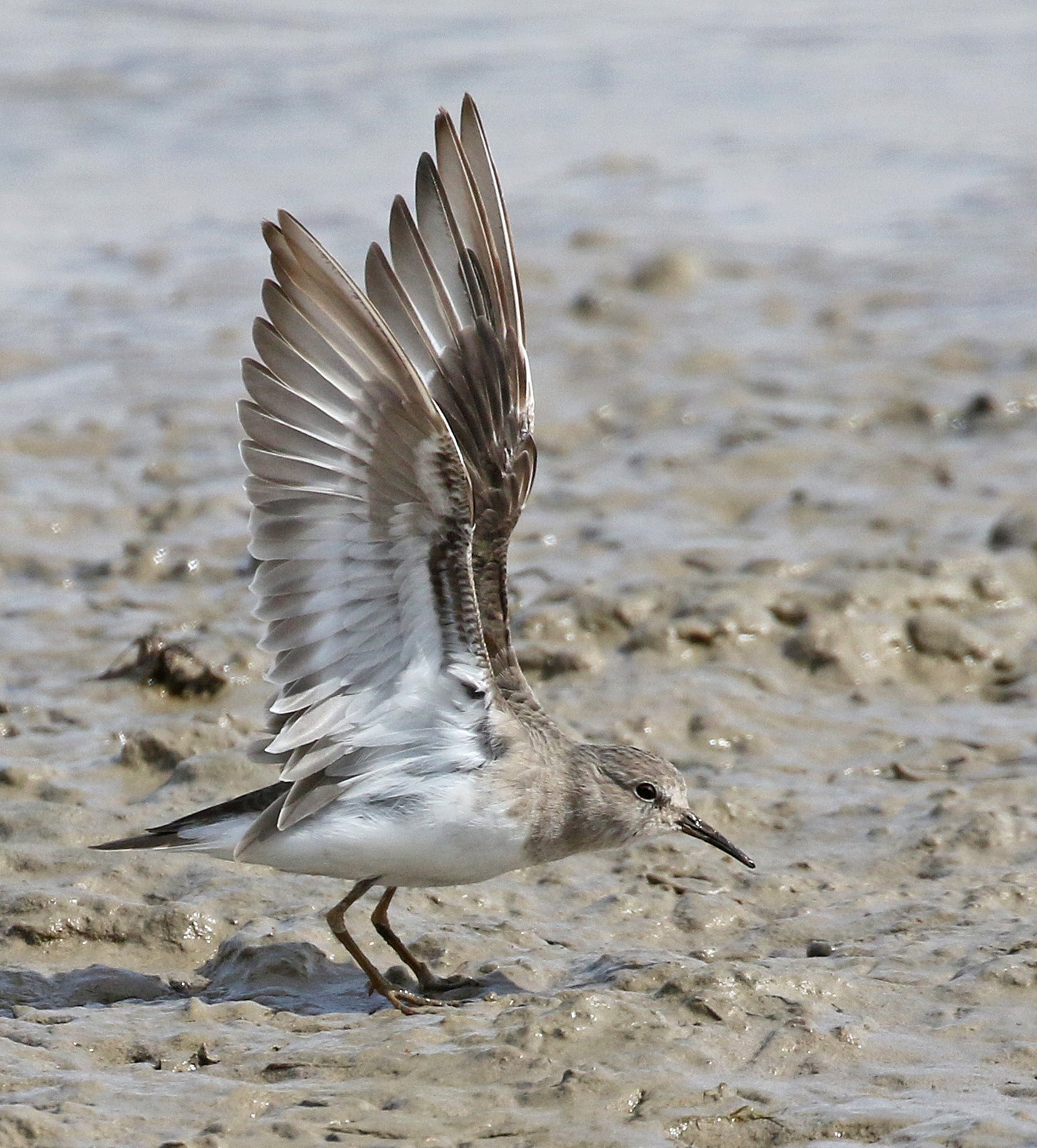 6 1/4" (16 cm). Very rare visitor. Size and shape similar to Least Sandpiper, but with slightly longer wings and tail. Mostly dull brownish gray on back, head, and chest, with yellow to greenish legs. Bright white outer tail feathers are distinctive but hard to see.