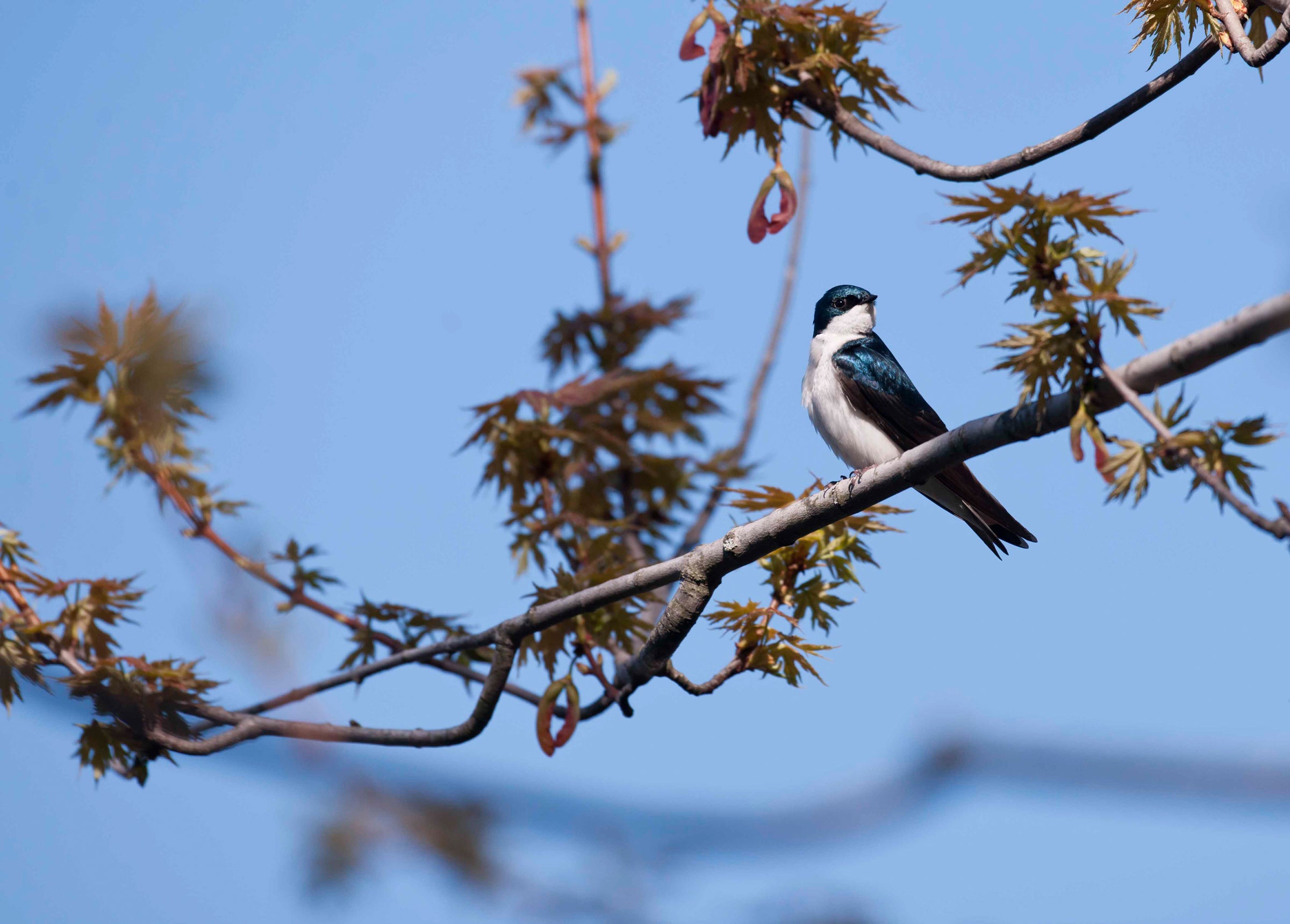 The popularity of the bluebird has been a boon to the Tree Swallow, which nests in holes of exactly the same size, and has taken advantage of bluebird houses over much of North America. In regions with no such ready supply of artificial nest sites, the swallows must compete with other cavity-nesting birds, arriving early in spring to stake out territories. Unlike other swallows, Tree Swallows eat many berries (especially bayberries), allowing them to survive through wintry spells when other insect-eaters might starve.