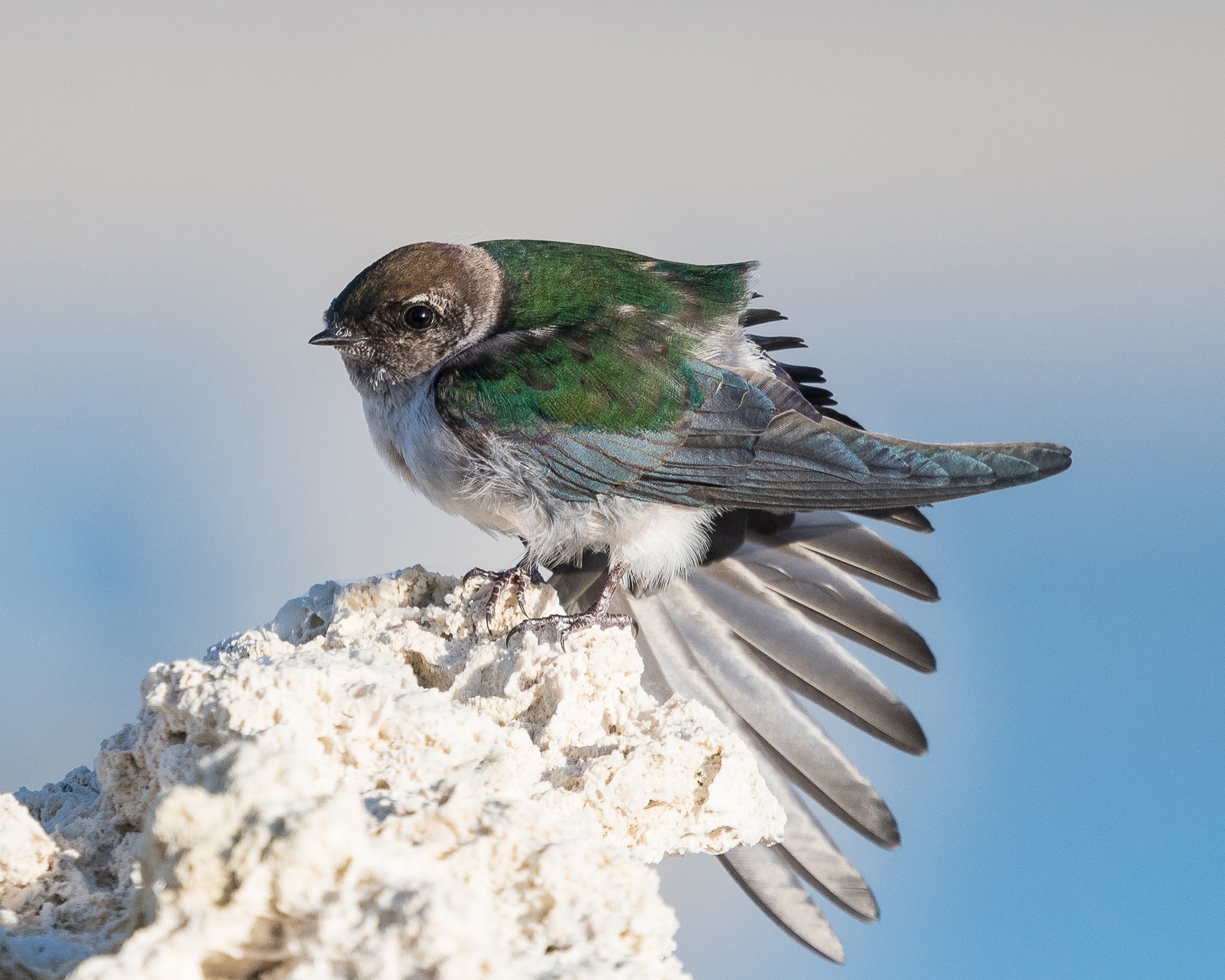 A small swallow of the west, nesting from Alaska to central Mexico. Similar to the Tree Swallow in appearance and also in behavior, nesting in tree cavities and in birdhouses; it also will nest in rock crevices of cliffs in rugged terrain. Flocks are often seen flying high over mountain pine forests or over steep canyons.