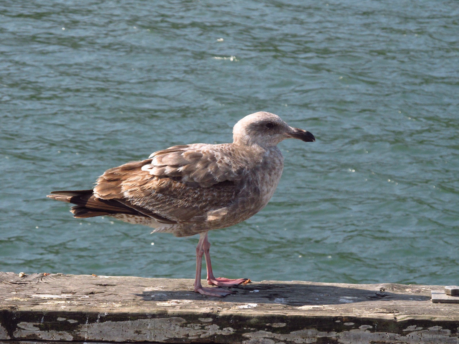 24-27" (61-69 cm). Size of American Herring Gull but looks bulkier, and bill often looks more swollen and drooping toward tip. Adults have back and wings dark gray to blackish, wingtips black and white, legs pink. Young birds all dark brown at first, similar to youngest American Herring Gulls, but note bill shape and paler rump; gradually change to adult plumage by fourth winter. North of Monterey, adults are slightly paler gray above. In Washington, often interbreeds with Glaucous-winged Gull, and hybrids occur all along the coast in winter.