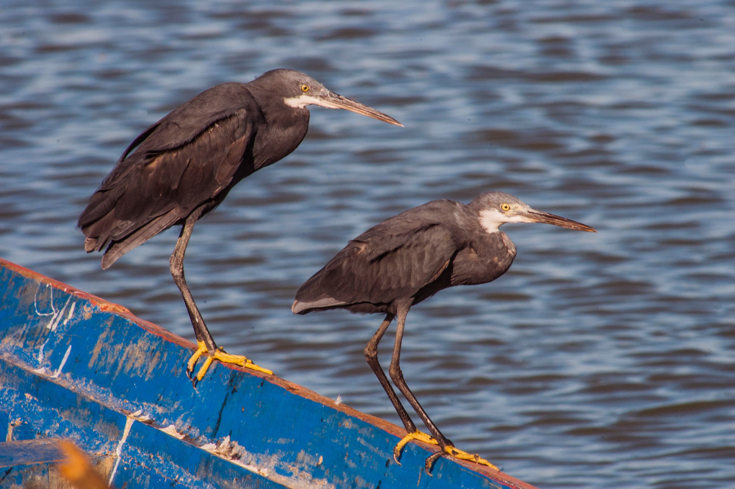 23-25" (58-62 cm). Very rare visitor along east coast. Size and shape similar to Snowy Egret but with thicker, longer bill. Usually dark slate gray with white throat. Has black legs with yellow feet, dull yellow bill.