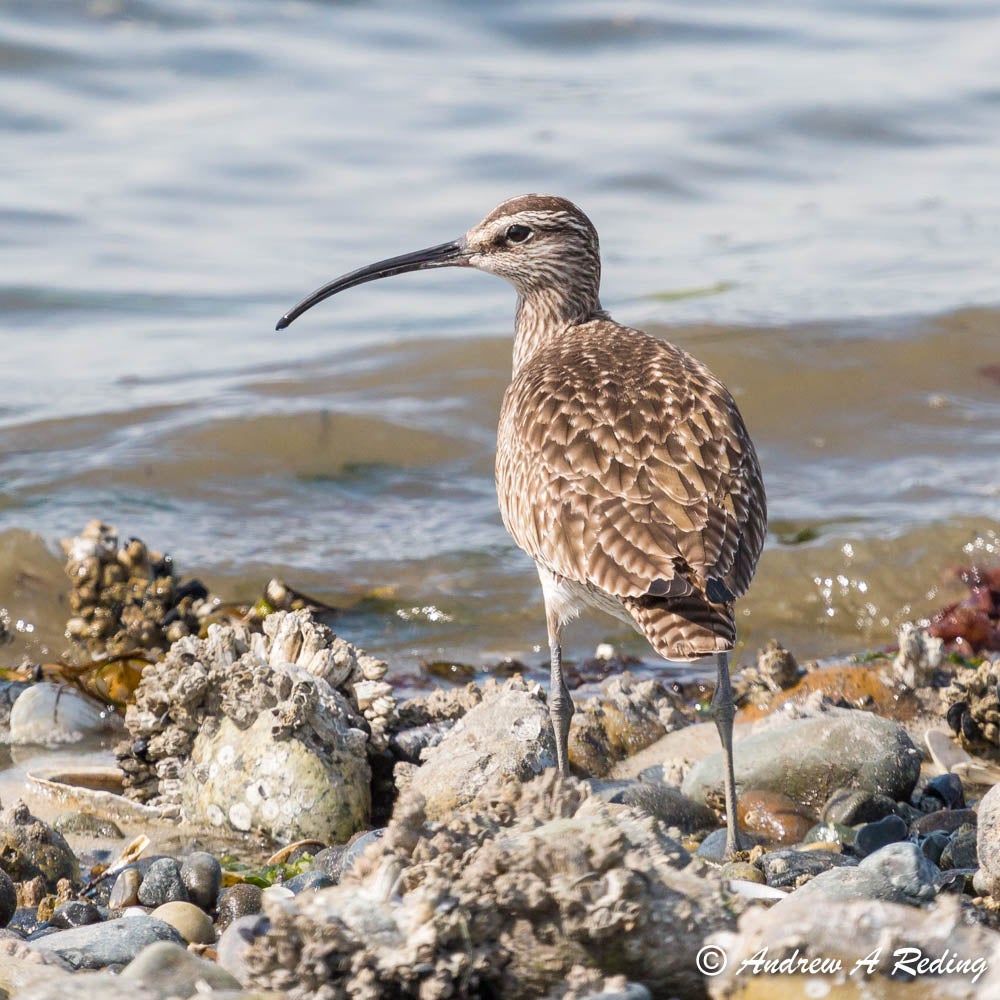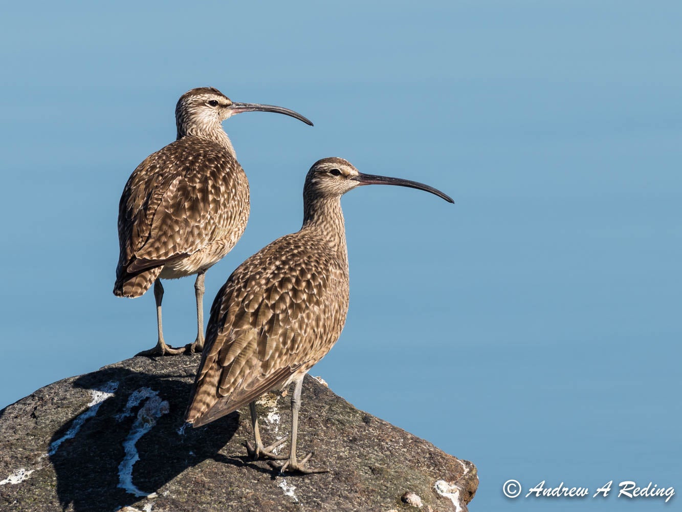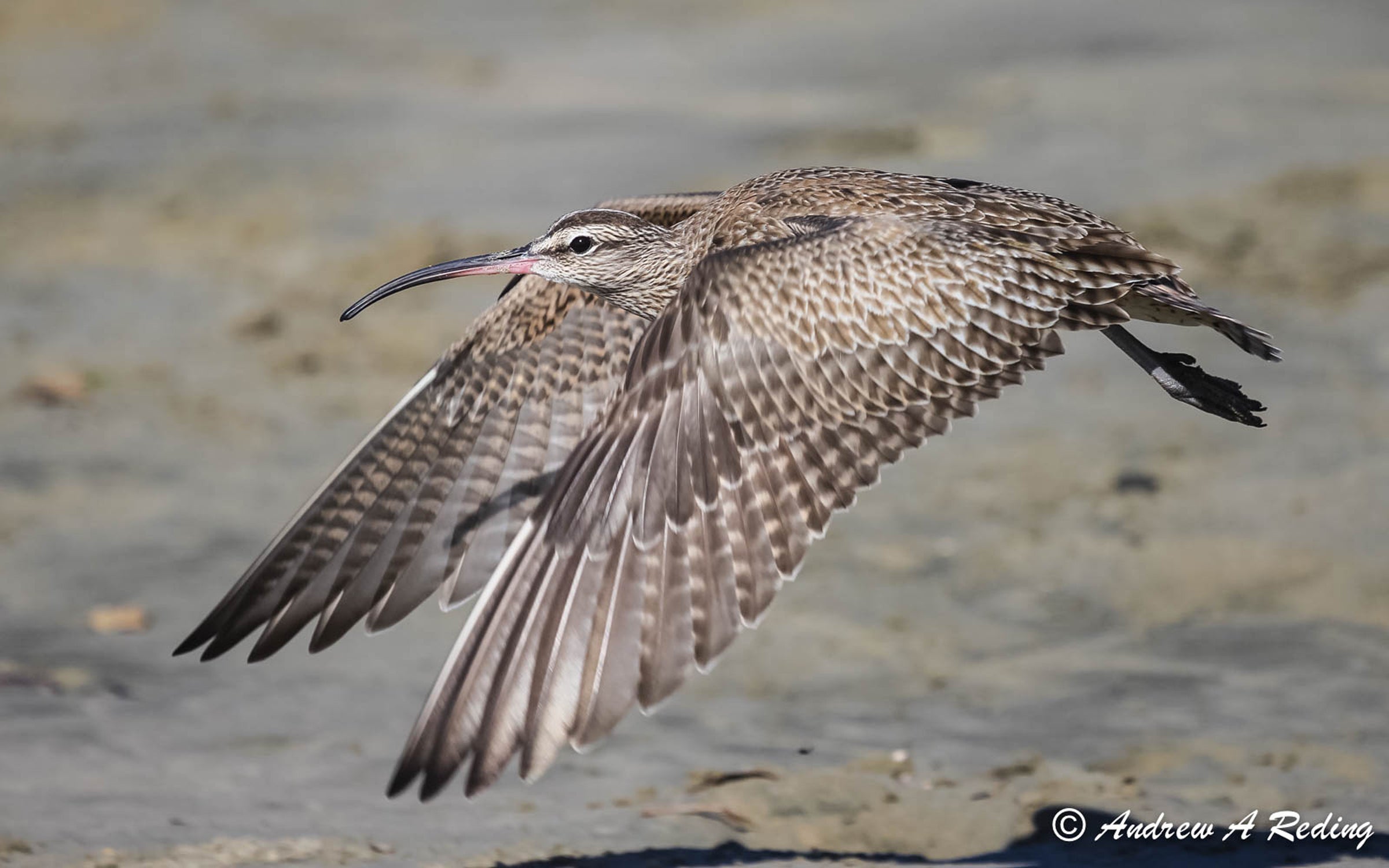 The most widespread of the curlews, nesting in the Arctic across North America and Eurasia, wintering on the coasts of six continents. Whimbrels tend to concentrate in flocks at a few favored spots in migration, so that the observer sees either many of them or else very small numbers. The name 'Whimbrel,' originating in England, apparently began as a loose interpretation of the bird's call.