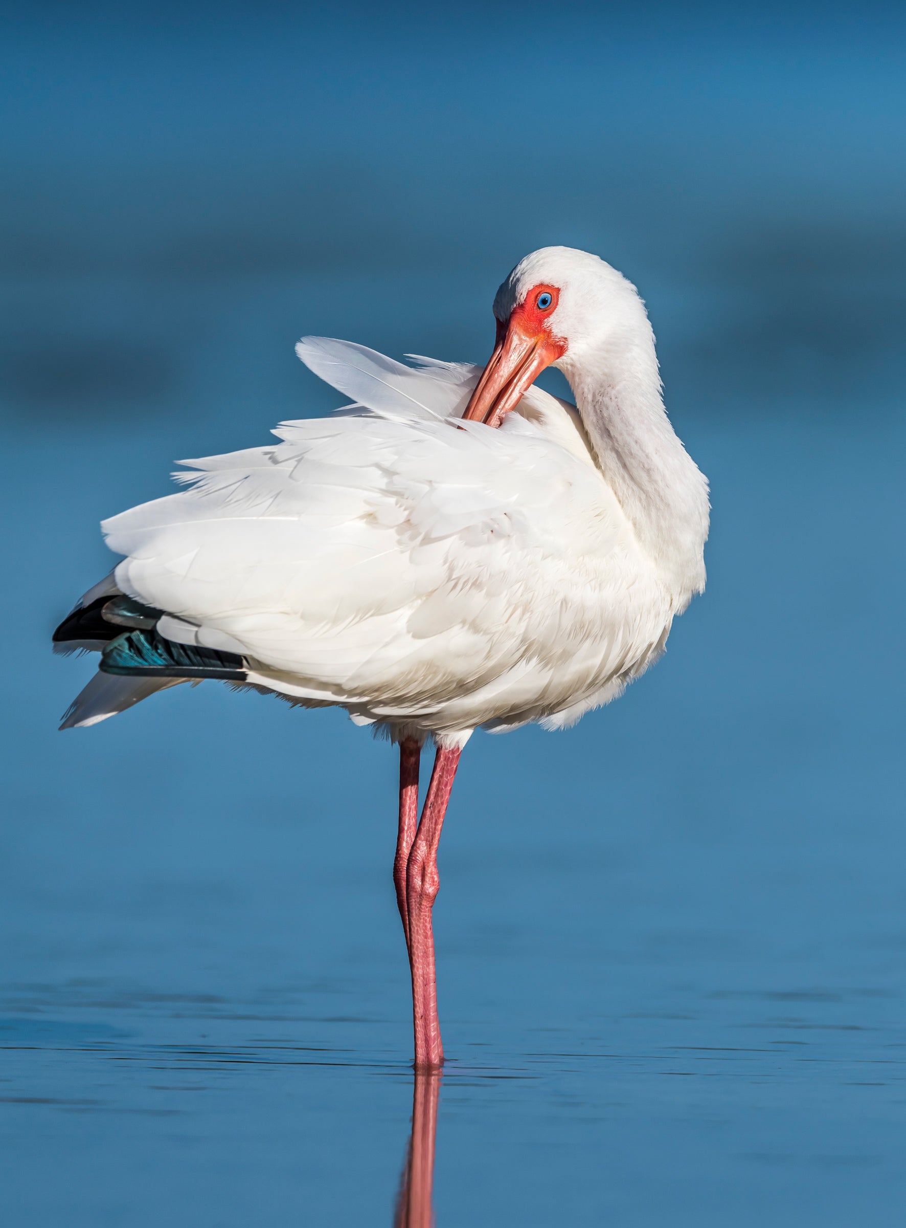 One of the most numerous wading birds in Florida, and common elsewhere in the southeast. Highly sociable at all seasons, roosting and feeding in flocks, nesting in large colonies. When groups wade through shallows, probing with their long bills, other wading birds such as egrets may follow them to catch prey stirred up by the ibises.