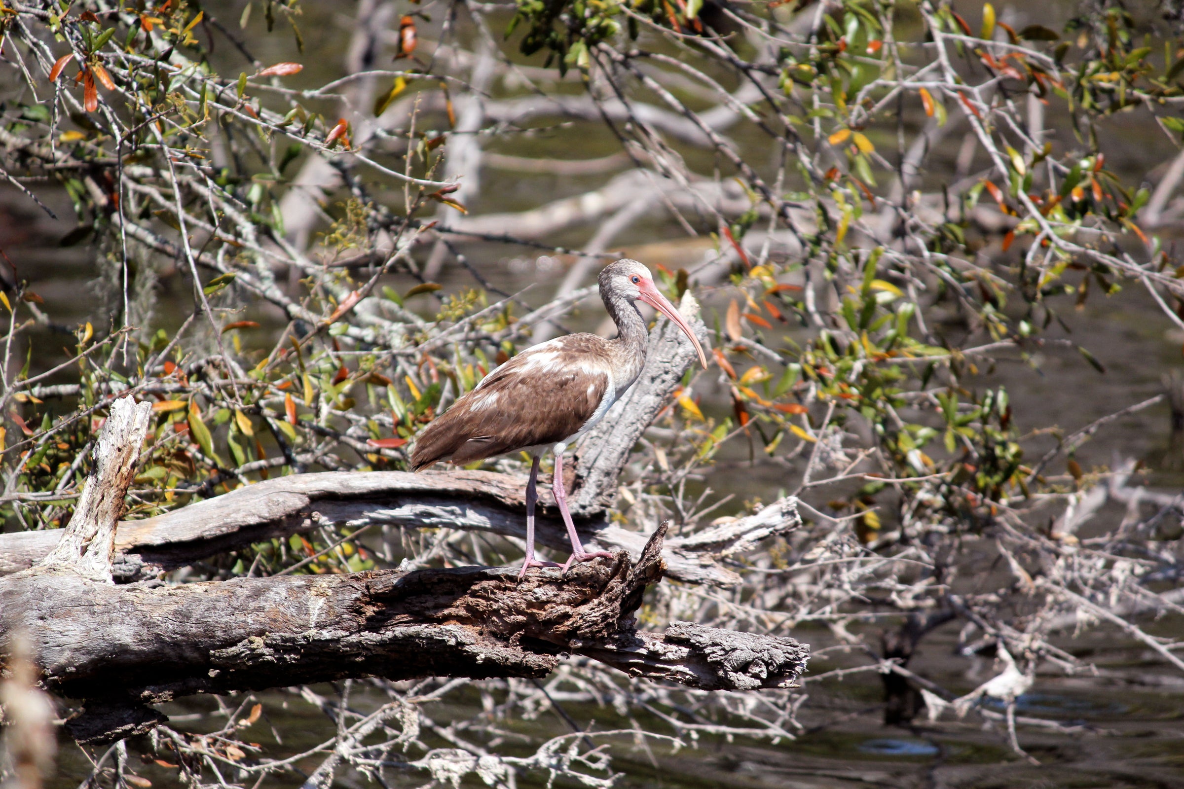 23-27" (58-69 cm). W. 3'2 (97 cm). Adult unmistakable, white with curved red bill, red face and legs, black wingtips. Young bird mostly brown with white belly at first, recognized by pink curved bill; becomes patchy as it matures.